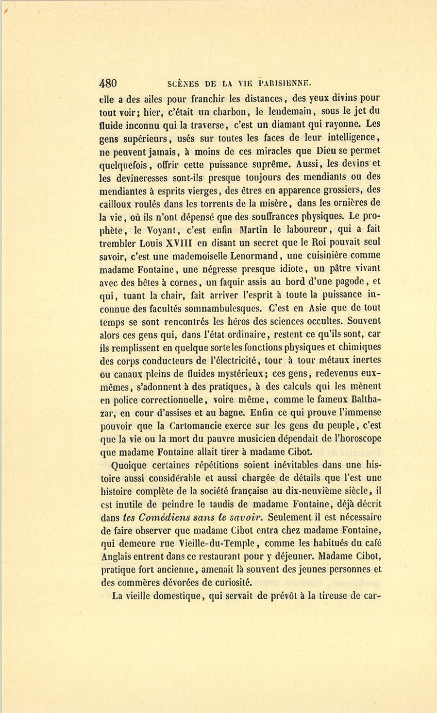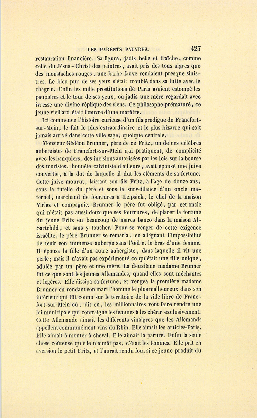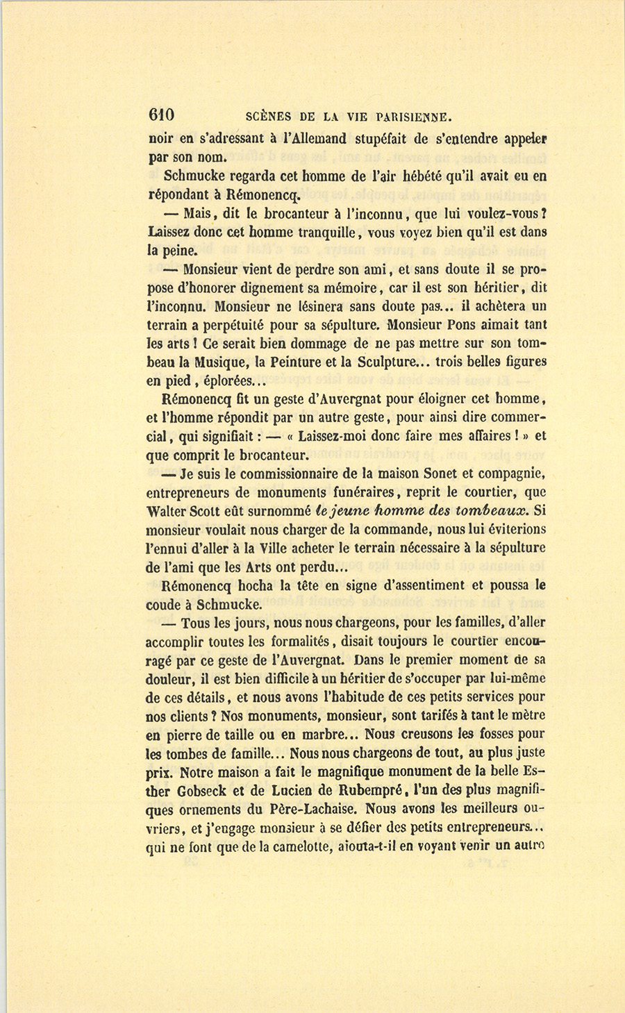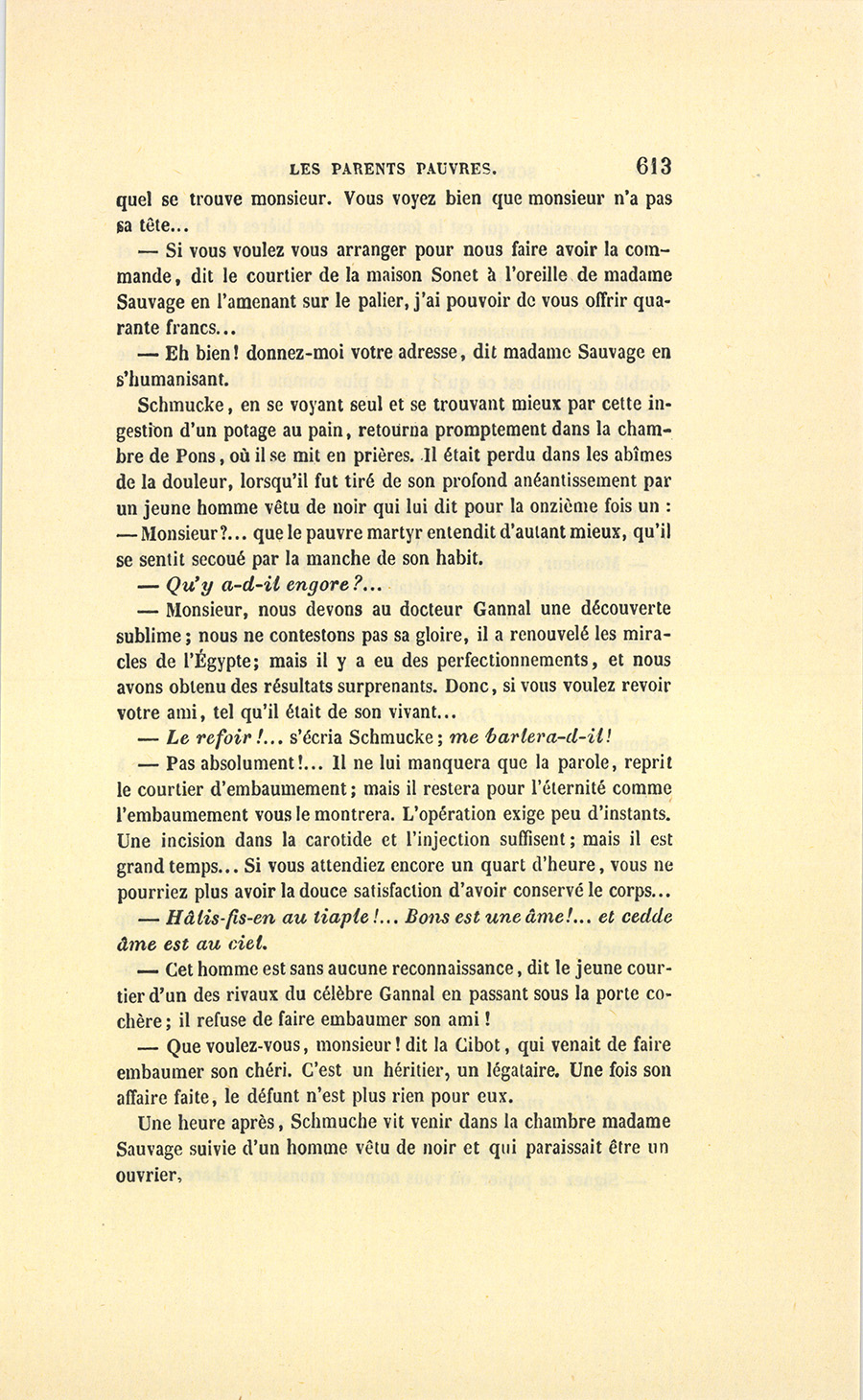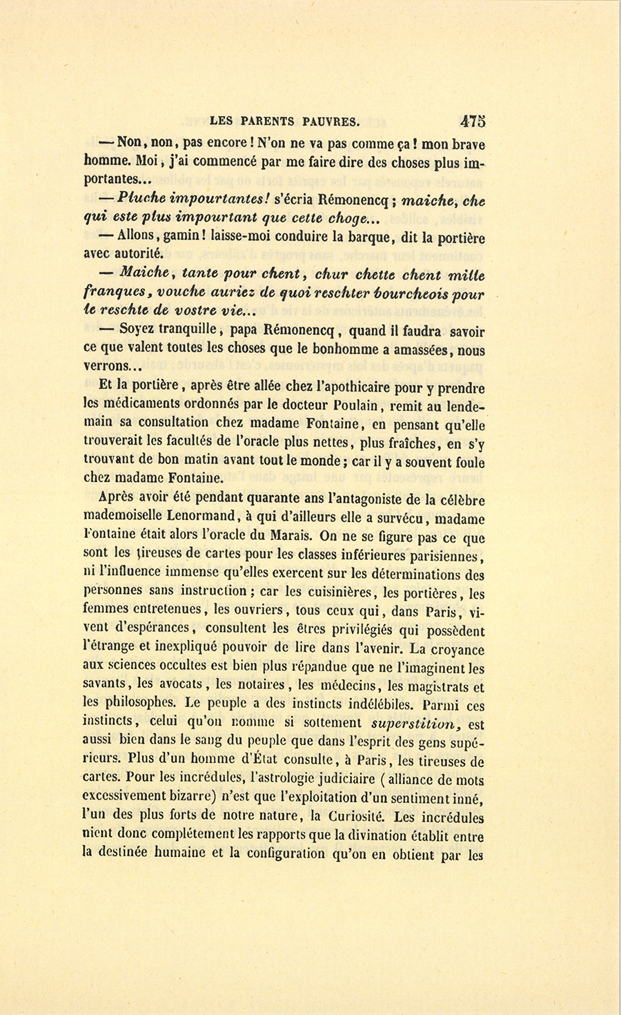 D’après le galbe de cet homme osseux, et malgré son hardi spencer, vous l’eussiez difficilement classé parmi les artistes parisiens, nature de convention dont le privilége assez semblable à celui du gamin de Paris, est de réveiller dans les imaginations bourgeoises les jovialités les plus mirobolantes, puisqu’on a remis en honneur ce vieux mot drôlatique. Ce passant était pourtant un grand prix, l’auteur de la première cantate couronnée à l’Institut, lors du rétablissement de l’Académie de Rome, enfin monsieur Sylvain Pons !… l’auteur de célèbres romances roucoulées par nos mères, de deux ou trois opéras joués en 1815 et 1816, puis de quelques partitions inédites. Ce digne homme finissait chef {p. 384} d’orchestre à un théâtre des boulevards. Il était, grâce à sa figure, professeur dans quelques pensionnats de demoiselles, et n’avait pas d’autres revenus que ses appointements et ses cachets. Courir le cachet à cet âge !… Combien de mystères dans cette situation peu romanesque !