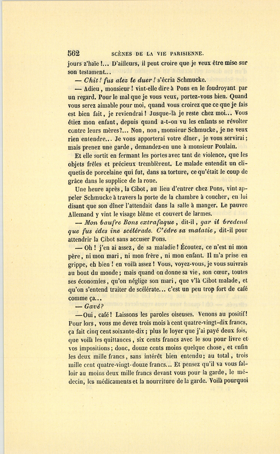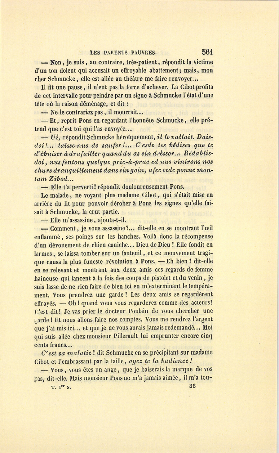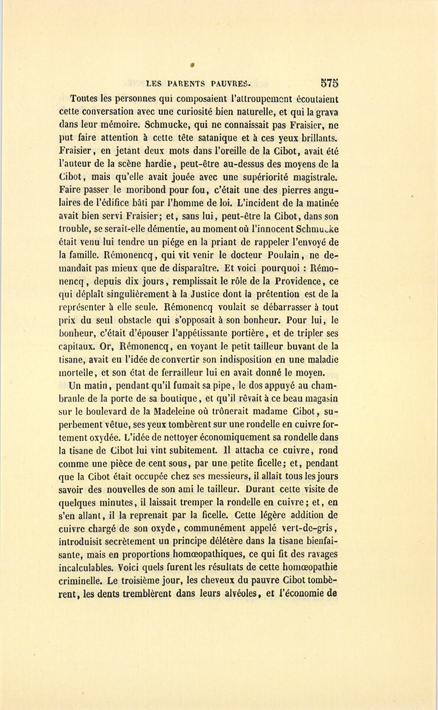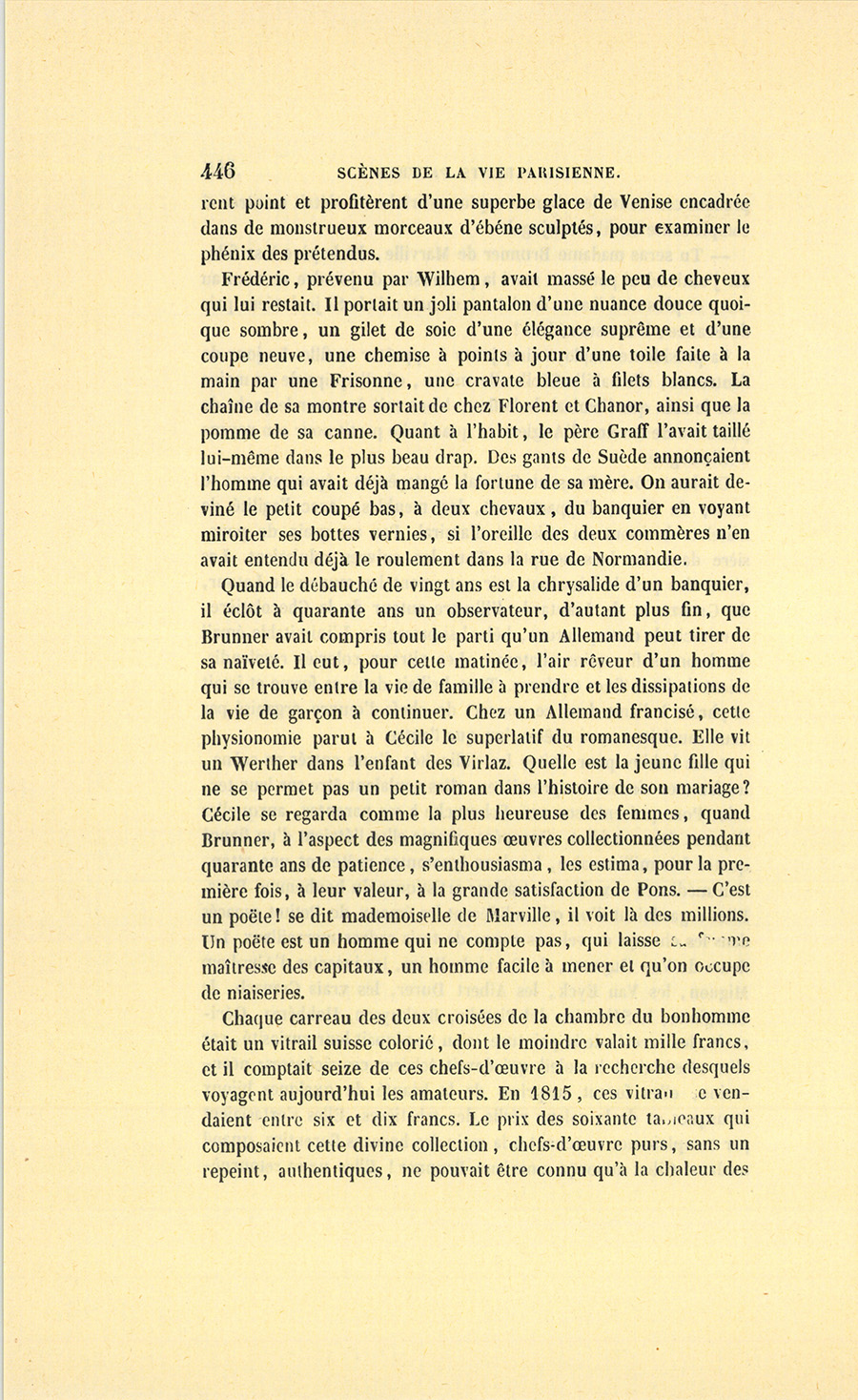 D’après le galbe de cet homme osseux, et malgré son hardi spencer, vous l’eussiez difficilement classé parmi les artistes parisiens, nature de convention dont le privilége assez semblable à celui du gamin de Paris, est de réveiller dans les imaginations bourgeoises les jovialités les plus mirobolantes, puisqu’on a remis en honneur ce vieux mot drôlatique. Ce passant était pourtant un grand prix, l’auteur de la première cantate couronnée à l’Institut, lors du rétablissement de l’Académie de Rome, enfin monsieur Sylvain Pons !… l’auteur de célèbres romances roucoulées par nos mères, de deux ou trois opéras joués en 1815 et 1816, puis de quelques partitions inédites. Ce digne homme finissait chef {p. 384} d’orchestre à un théâtre des boulevards. Il était, grâce à sa figure, professeur dans quelques pensionnats de demoiselles, et n’avait pas d’autres revenus que ses appointements et ses cachets. Courir le cachet à cet âge !… Combien de mystères dans cette situation peu romanesque !