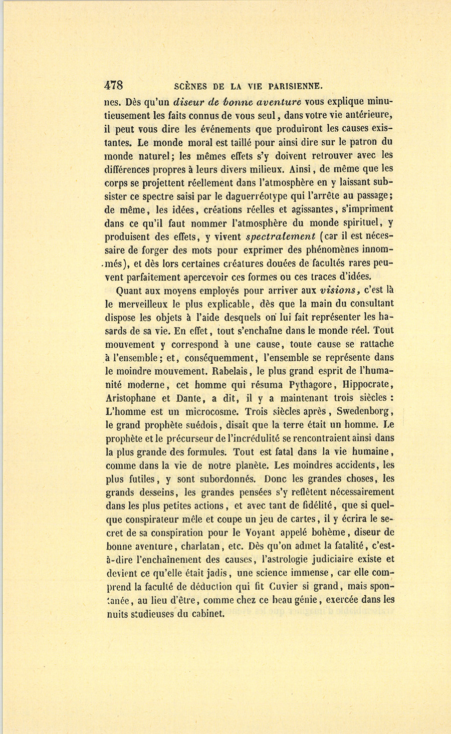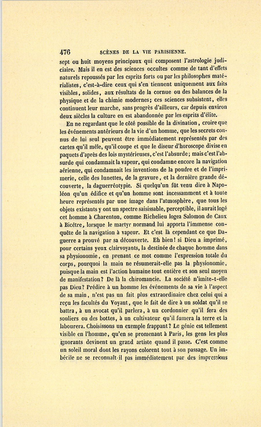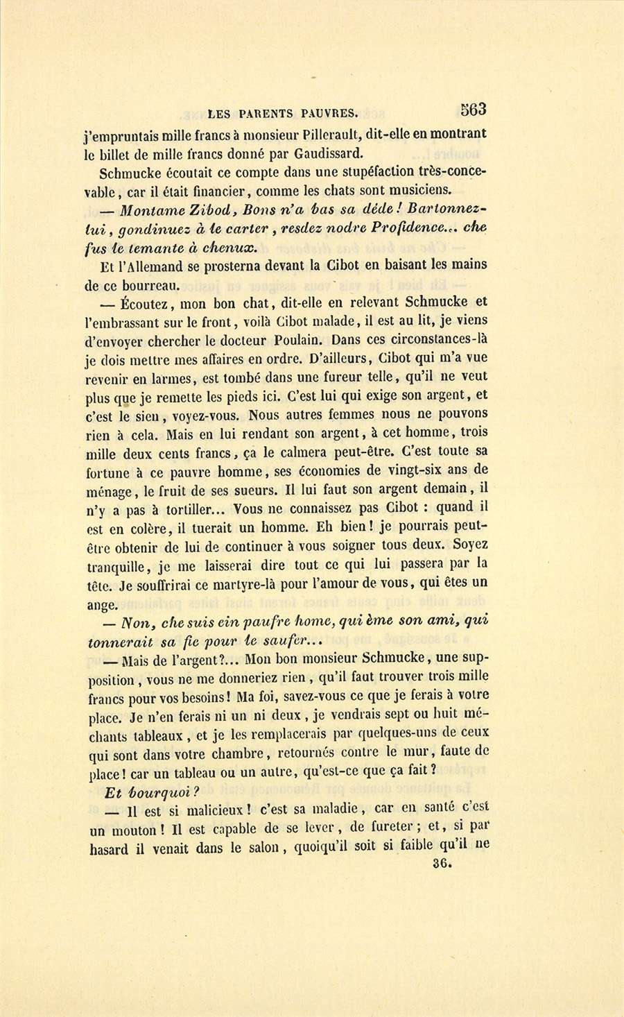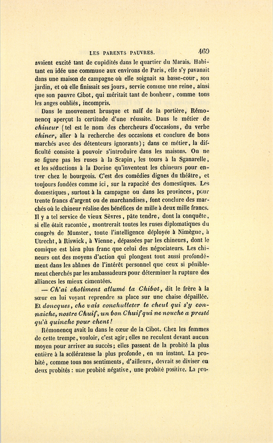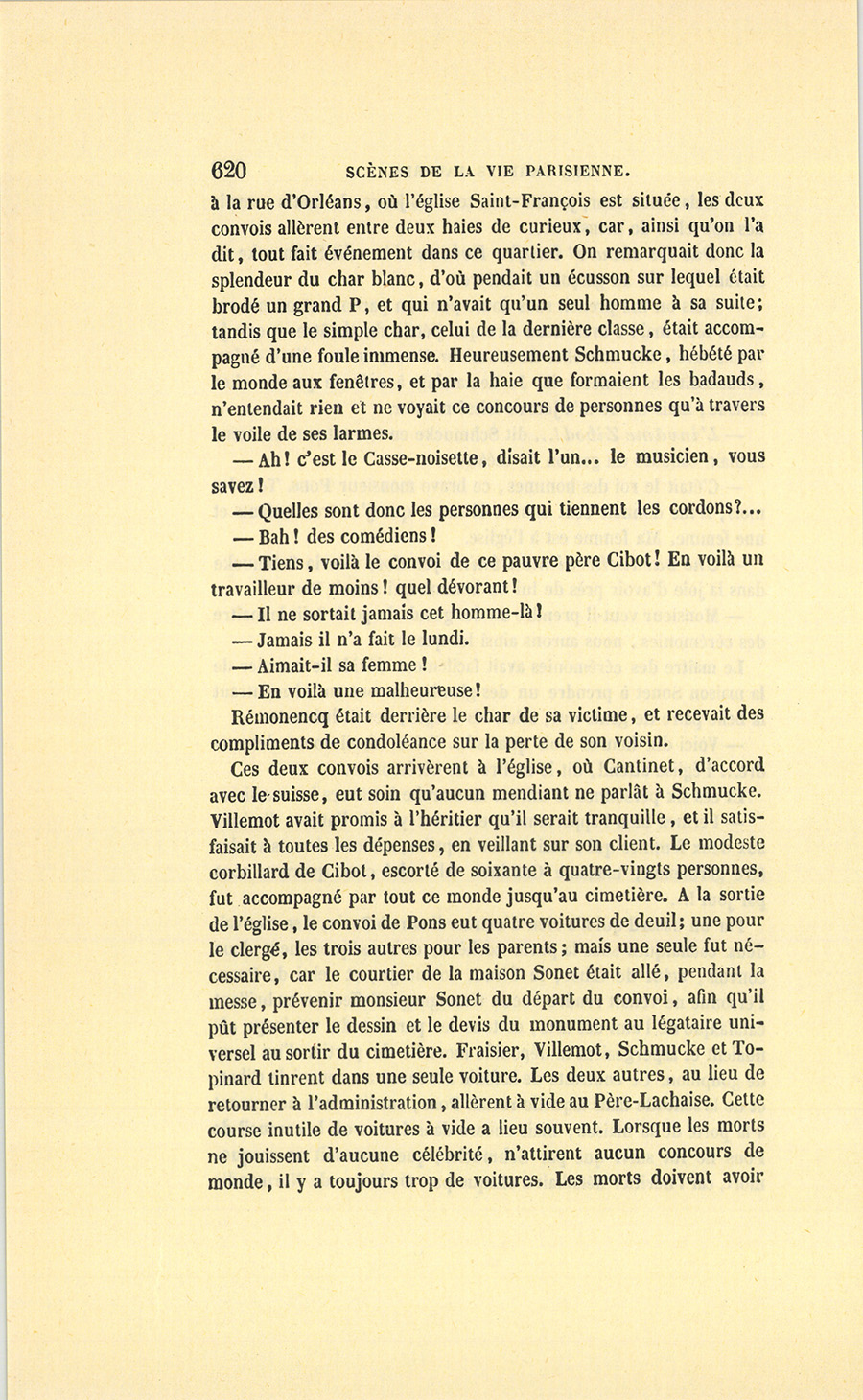 D’après le galbe de cet homme osseux, et malgré son hardi spencer, vous l’eussiez difficilement classé parmi les artistes parisiens, nature de convention dont le privilége assez semblable à celui du gamin de Paris, est de réveiller dans les imaginations bourgeoises les jovialités les plus mirobolantes, puisqu’on a remis en honneur ce vieux mot drôlatique. Ce passant était pourtant un grand prix, l’auteur de la première cantate couronnée à l’Institut, lors du rétablissement de l’Académie de Rome, enfin monsieur Sylvain Pons !… l’auteur de célèbres romances roucoulées par nos mères, de deux ou trois opéras joués en 1815 et 1816, puis de quelques partitions inédites. Ce digne homme finissait chef {p. 384} d’orchestre à un théâtre des boulevards. Il était, grâce à sa figure, professeur dans quelques pensionnats de demoiselles, et n’avait pas d’autres revenus que ses appointements et ses cachets. Courir le cachet à cet âge !… Combien de mystères dans cette situation peu romanesque !