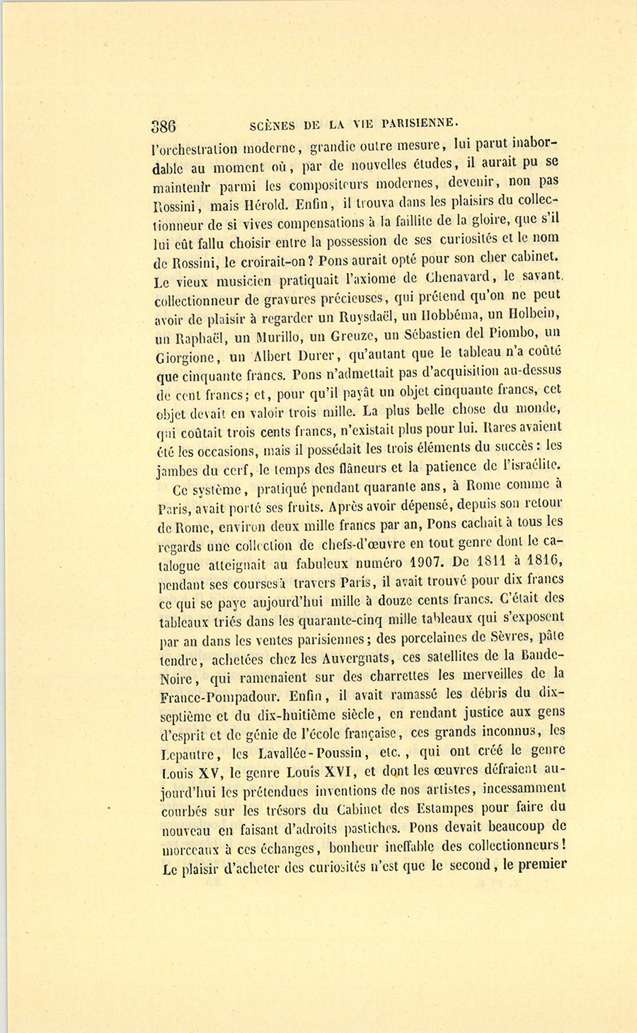 Ce bonhomme rendait d’ailleurs justice aux fameux maîtres de notre époque ; une belle exécution de quelques morceaux d’élite le faisait pleurer ; mais sa religion n’arrivait pas à ce point où elle frise la manie, comme chez les Kreisler d’Hoffmann ; il n’en laissait rien paraître, il jouissait en lui-même à la façon des Hatchischins ou des Tériaskis. Le génie de l’admiration, de la compréhension, la seule faculté par laquelle un homme ordinaire devient le frère d’un grand poëte, est si rare à Paris, où toutes les idées ressemblent à des voyageurs passant dans une hôtellerie, que l’on doit accorder à Pons une respectueuse estime. Le fait de l’insuccès du bonhomme peut sembler exorbitant, mais il avouait naïvement sa faiblesse relativement à l’harmonie : il avait négligé l’étude du Contrepoint ; et {p. 386} l’orchestration moderne, grandie outre mesure, lui parut inabordable au moment où, par de nouvelles études, il aurait pu se maintenir parmi les compositeurs modernes, devenir, non pas Rossini, mais Hérold. Enfin, il trouva dans les plaisirs du collectionneur de si vives compensations à la faillite de la gloire, que s’il lui eût fallu choisir entre la possession de ses curiosités et le nom de Rossini, le croirait-on ? Pons aurait opté pour son cher cabinet. Le vieux musicien pratiquait l’axiome de Chenavard, le savant collectionneur de gravures précieuses, qui prétend qu’on ne peut avoir de plaisir à regarder un Ruysdaël, un Hobbéma, un Holbein, un Raphaël, un Murillo, un Greuze, un Sébastien del Piombo, un Giorgione, un Albert Durer, qu’autant que le tableau n’a coûté que cinquante francs. Pons n’admettait pas d’acquisition au-dessus de cent francs ; et, pour qu’il payât un objet cinquante francs, cet objet devait en valoir trois mille. La plus belle chose du monde, qui coûtait trois cents francs, n’existait plus pour lui. Rares avaient été les occasions, mais il possédait les trois éléments du succès : les jambes du cerf, le temps des flâneurs et la patience de l’israélite.