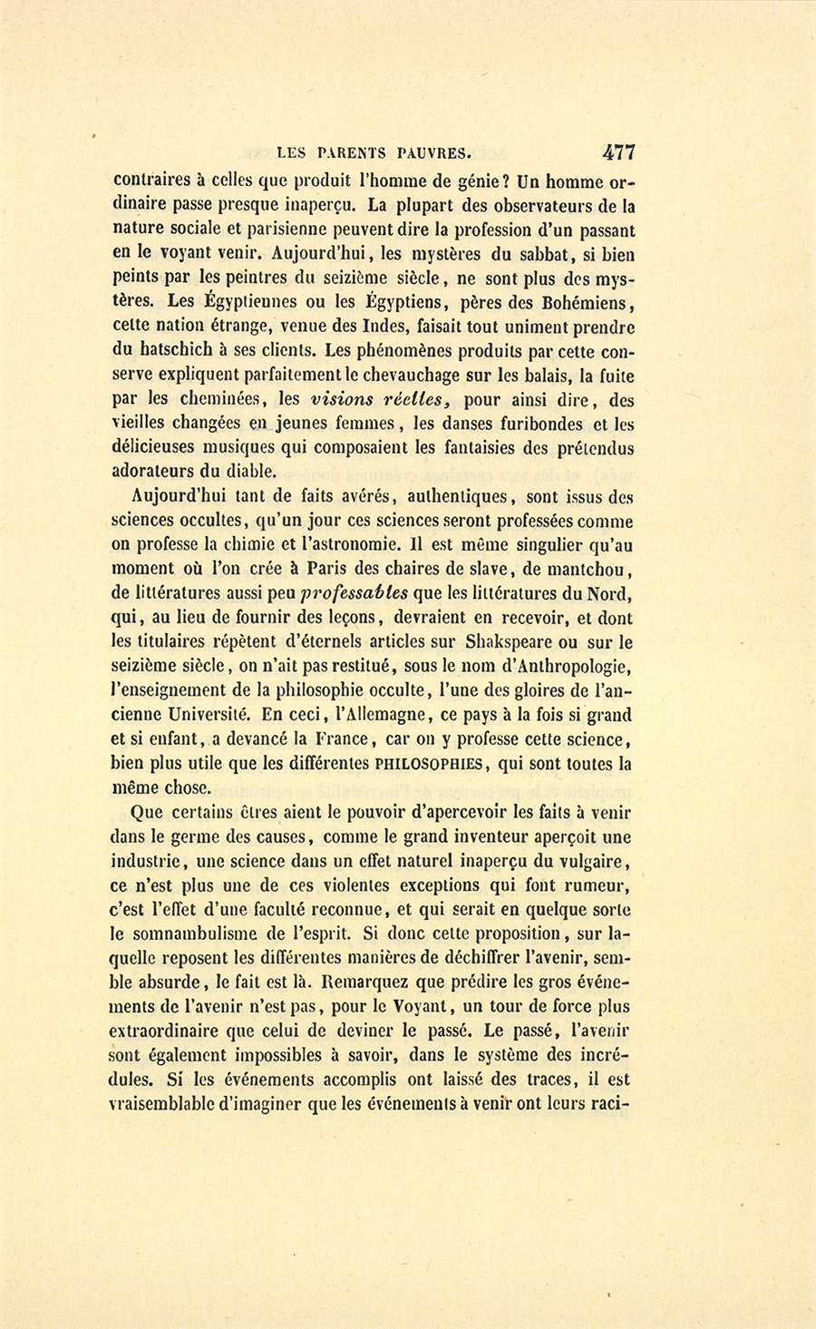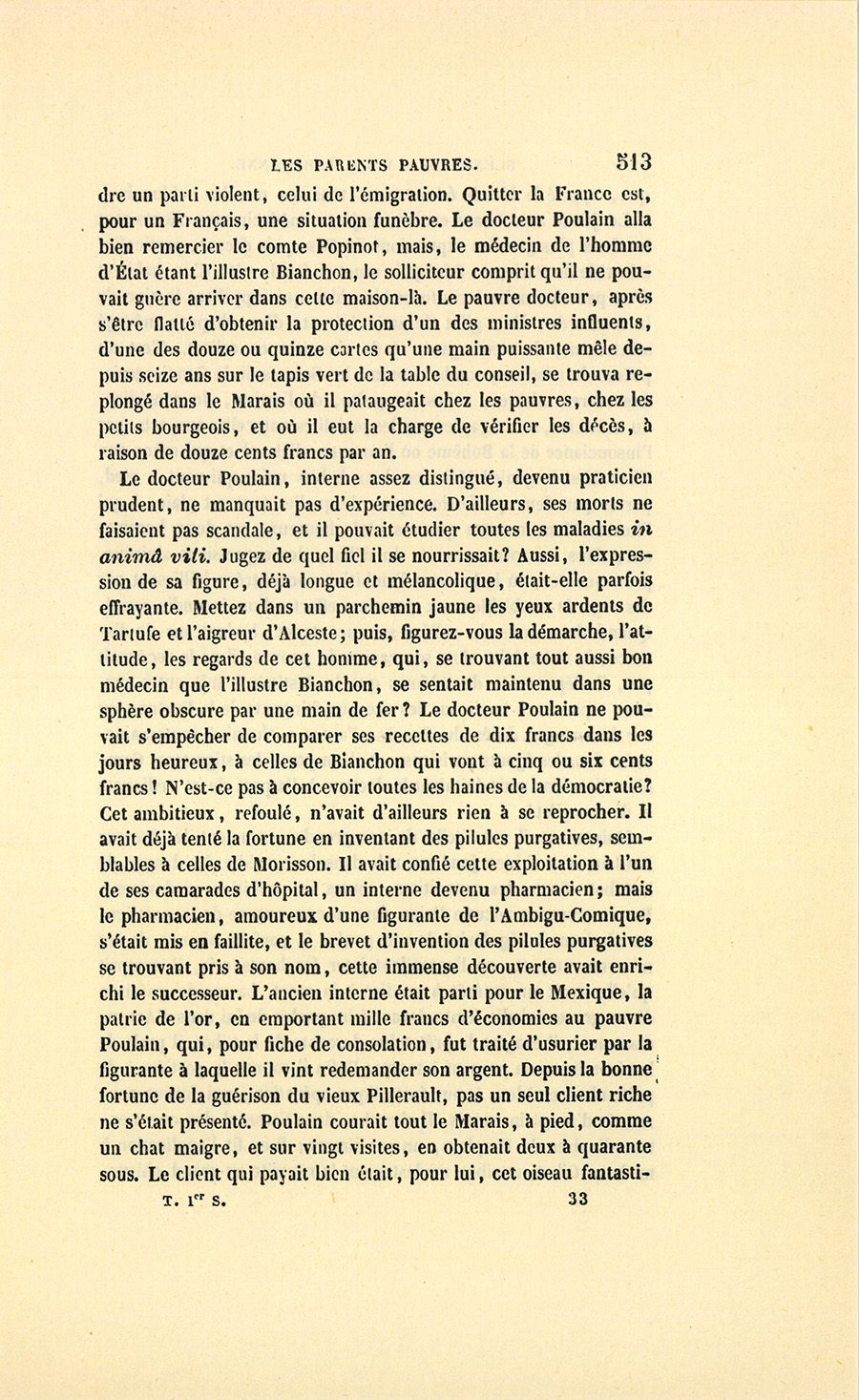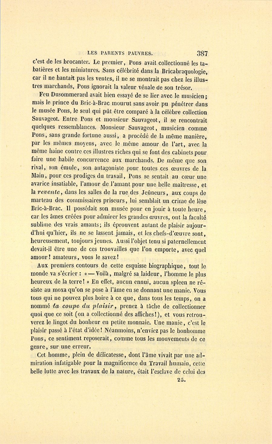 Aux premiers contours de cette esquisse biographique, tout le monde va s’écrier : « – Voilà, malgré sa laideur, l’homme le plus heureux de la terre ! » En effet, aucun ennui, aucun spleen ne résiste au moxa qu’on se pose à l’âme en se donnant une manie. Vous tous qui ne pouvez plus boire à ce que, dans tous les temps, on a nommé la coupe du plaisir, prenez à tâche de collectionner quoi que ce soit (on a collectionné des affiches !), et vous retrouverez le lingot du bonheur en petite monnaie. Une manie, c’est le plaisir passé à l’état d’idée ! Néanmoins, n’enviez pas le bonhomme Pons, ce sentiment reposerait, comme tous les mouvements de ce genre, sur une erreur.