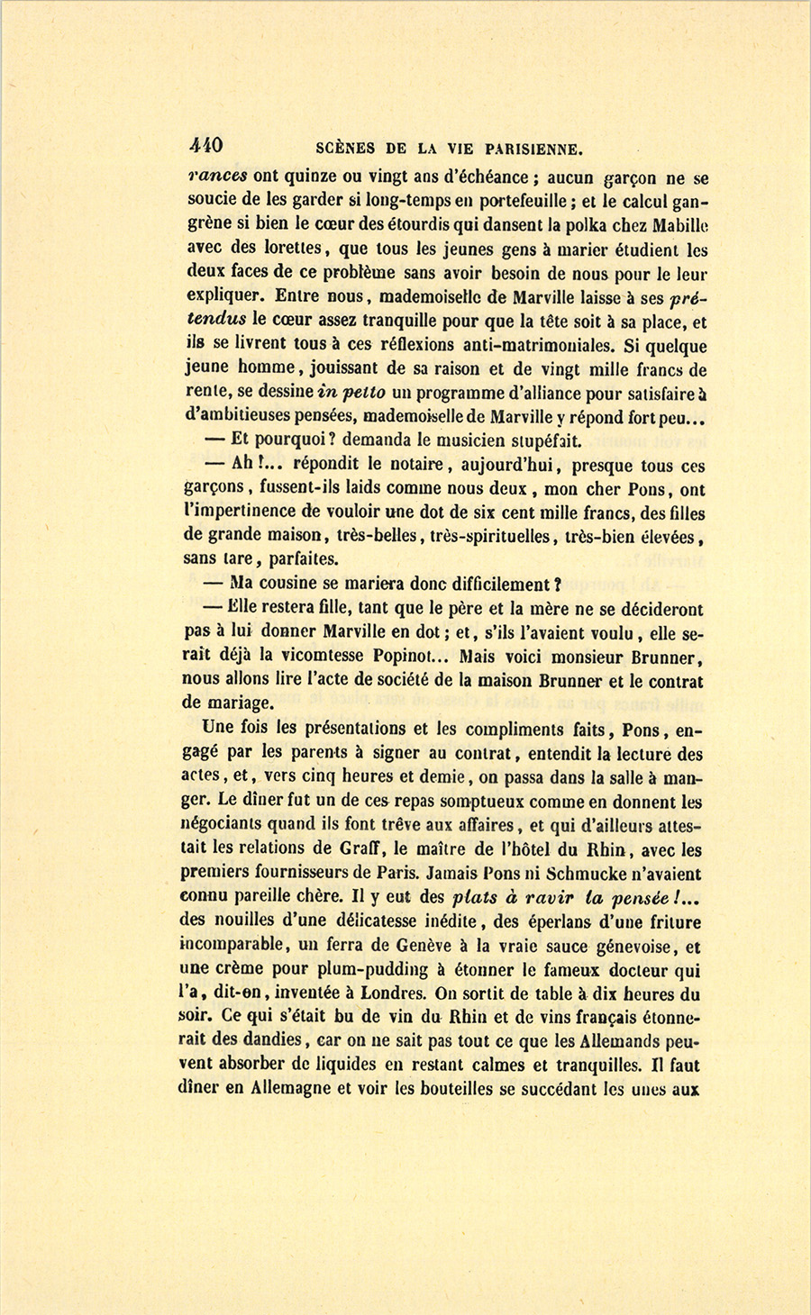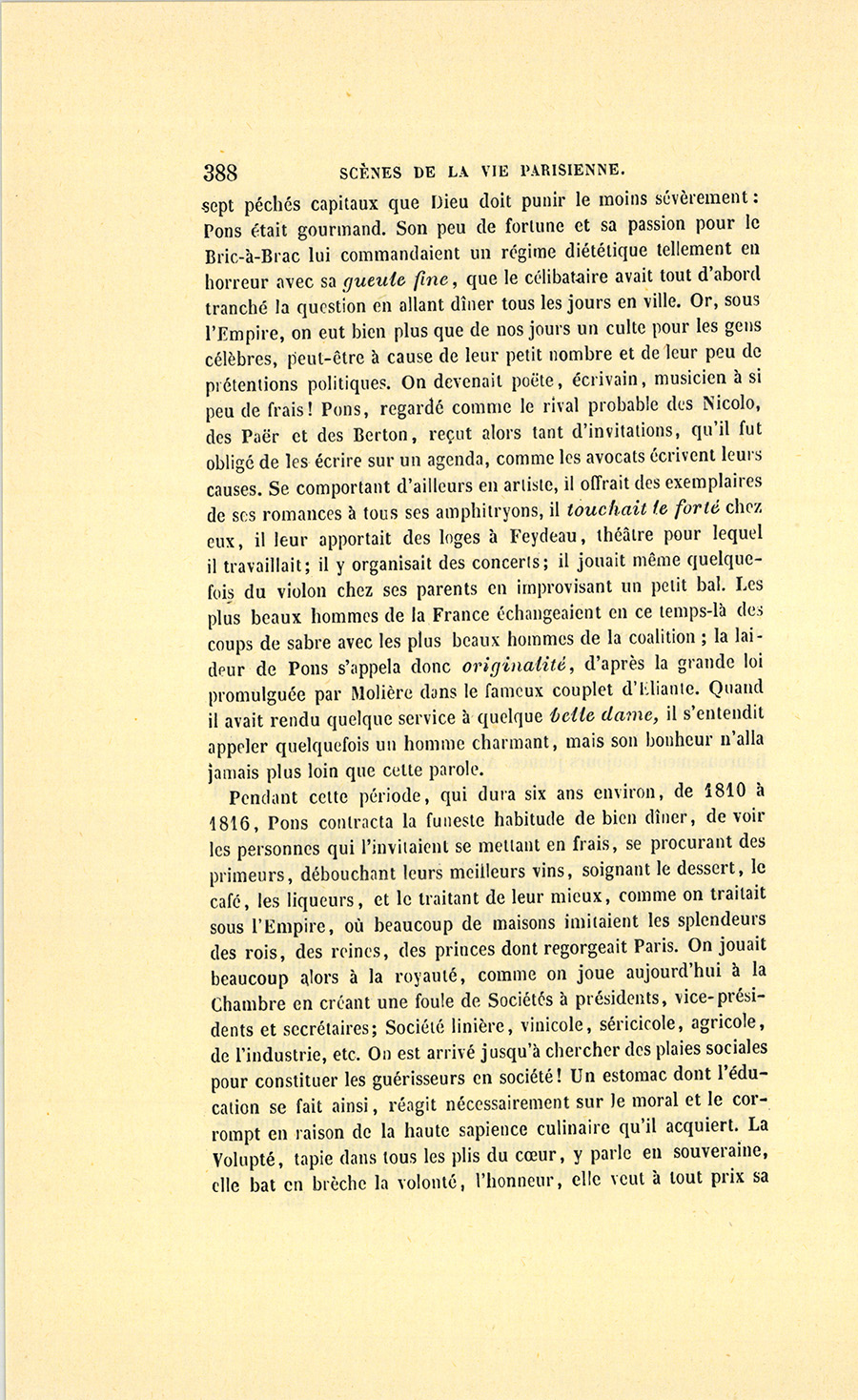 Cet homme, plein de délicatesse, dont l’âme vivait par une admiration infatigable pour la magnificence du Travail humain, cette belle lutte avec les travaux de la nature, était l’esclave de celui des {p. 388} sept péchés capitaux que Dieu doit punir le moins sévèrement : Pons était gourmand. Son peu de fortune et sa passion pour le Bric-à-Brac lui commandaient un régime diététique tellement en horreur avec sa gueule fine, que le célibataire avait tout d’abord tranché la question en allant dîner tous les jours en ville. Or, sous l’Empire, on eut bien plus que de nos jours un culte pour les gens célèbres, peut-être à cause de leur petit nombre et de leur peu de prétentions politiques. On devenait poëte, écrivain, musicien à si peu de frais ! Pons, regardé comme le rival probable des Nicolo, des Paër et des Berton, reçut alors tant d’invitations, qu’il fut obligé de les écrire sur un agenda, comme les avocats écrivent leurs causes. Se comportant d’ailleurs en artiste, il offrait des exemplaires de ses romances à tous ses amphitryons, il touchait le forté chez eux, il leur apportait des loges à Feydeau, théâtre pour lequel il travaillait ; il y organisait des concerts ; il jouait même quelquefois du violon chez ses parents en improvisant un petit bal. Les plus beaux hommes de la France échangeaient en ce temps-là des coups de sabre avec les plus beaux hommes de la coalition ; la laideur de Pons s’appela donc originalité, d’après la grande loi promulguée par Molière dans le fameux couplet d’Éliante. Quand il avait rendu quelque service à quelque belle dame, il s’entendit appeler quelquefois un homme charmant, mais son bonheur n’alla jamais plus loin que cette parole.