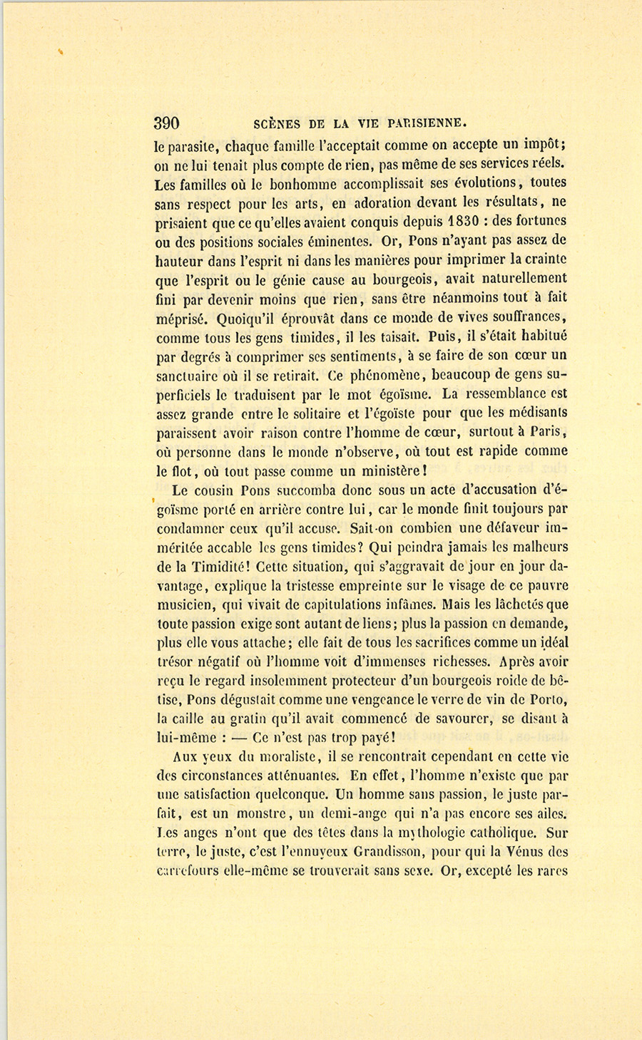 De 1836 à 1843, Pons se vit invité rarement. Loin de rechercher {p. 390} le parasite, chaque famille l’acceptait comme on accepte un impôt ; on ne lui tenait plus compte de rien, pas même de ses services réels. Les familles où le bonhomme accomplissait ses évolutions, toutes sans respect pour les arts, en adoration devant les résultats, ne prisaient que ce qu’elles avaient conquis depuis 1830 : des fortunes ou des positions sociales éminentes. Or, Pons n’ayant pas assez de hauteur dans l’esprit ni dans les manières pour imprimer la crainte que l’esprit ou le génie cause au bourgeois, avait naturellement fini par devenir moins que rien, sans être néanmoins tout à fait méprisé. Quoiqu’il éprouvât dans ce monde de vives souffrances, comme tous les gens timides, il les taisait. Puis, il s’était habitué par degrés à comprimer ses sentiments, à se faire de son cœur un sanctuaire où il se retirait. Ce phénomène, beaucoup de gens superficiels le traduisent par le mot égoïsme. La ressemblance est assez grande entre le solitaire et l’égoïste pour que les médisants paraissent avoir raison contre l’homme de cœur, surtout à Paris, où personne dans le monde n’observe, où tout est rapide comme le flot, où tout passe comme un ministère !