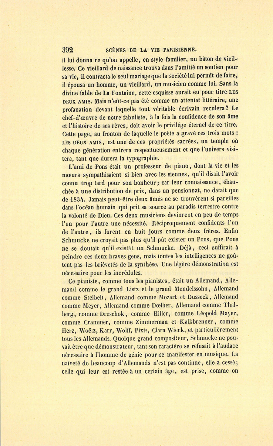 En 1835, le hasard vengea Pons de l’indifférence du beau sexe, {p. 392} il lui donna ce qu’on appelle, en style familier, un bâton de vieillesse. Ce vieillard de naissance trouva dans l’amitié un soutien pour sa vie, il contracta le seul mariage que la société lui permît de faire, il épousa un homme, un vieillard, un musicien comme lui. Sans la divine fable de La Fontaine, cette esquisse aurait eu pour titre les deux amis. Mais n’eût-ce pas été comme un attentat littéraire, une profanation devant laquelle tout véritable écrivain reculera ? Le chef-d’œuvre de notre fabuliste, à la fois la confidence de son âme et l’histoire de ses rêves, doit avoir le privilége éternel de ce titre. Cette page, au fronton de laquelle le poète a gravé ces trois mots : les deux amis, est une de ces propriétés sacrées, un temple où chaque génération entrera respectueusement et que l’univers visitera, tant que durera la typographie.