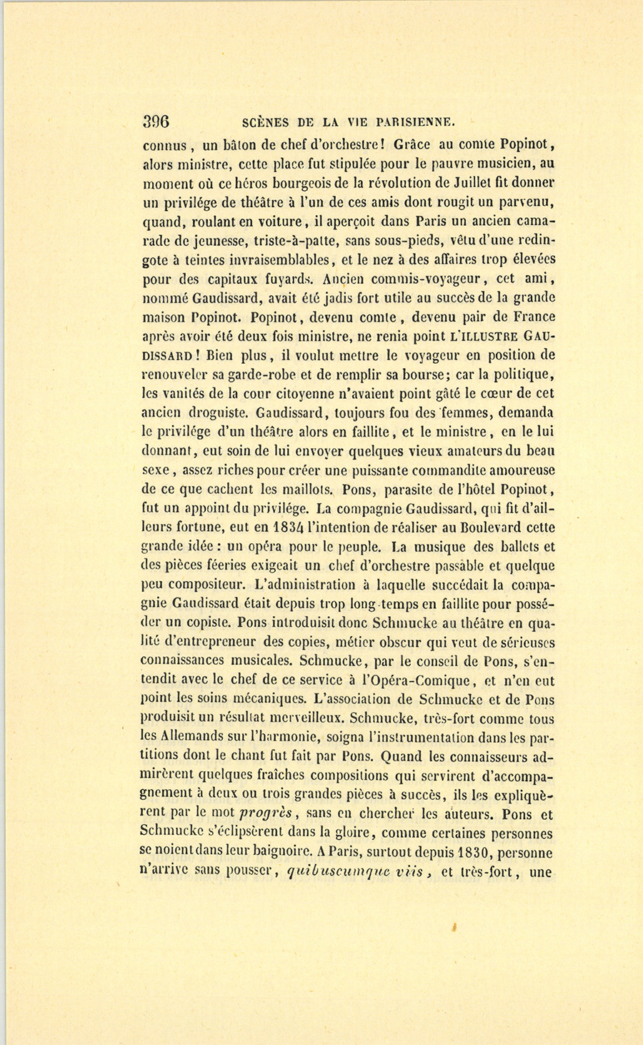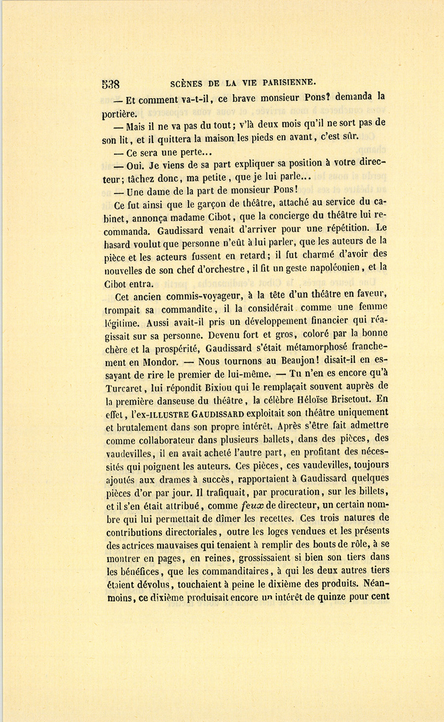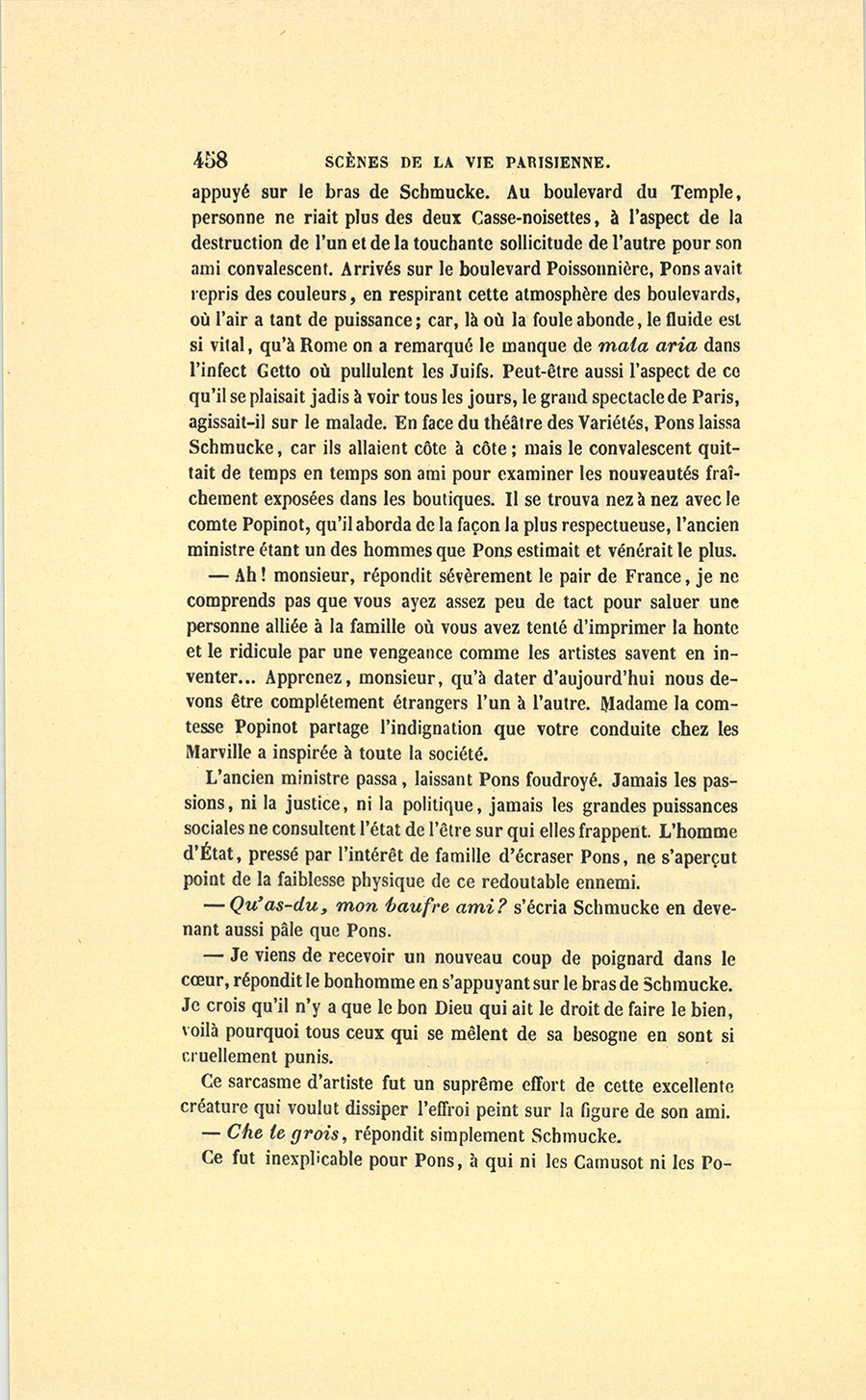 Au moment où Pons rencontra Schmucke, il venait d’obtenir, sans l’avoir demandé, le bâton de maréchal des compositeurs {p. 396} inconnus, un bâton de chef d’orchestre ! Grâce au comte Popinot, alors ministre, cette place fut stipulée pour le pauvre musicien, au moment où ce héros bourgeois de la révolution de Juillet fit donner un privilége de théâtre à l’un de ces amis dont rougit un parvenu, quand, roulant en voiture, il aperçoit dans Paris un ancien camarade de jeunesse, triste-à-patte, sans sous-pieds, vêtu d’une redingote à teintes invraisemblables, et le nez à des affaires trop élevées pour des capitaux fuyards. Ancien commis-voyageur, cet ami, nommé Gaudissard, avait été jadis fort utile au succès de la grande maison Popinot. Popinot, devenu comte, devenu pair de France après avoir été deux fois ministre, ne renia point l’illustre Gaudissard ! Bien plus, il voulut mettre le voyageur en position de renouveler sa garde-robe et de remplir sa bourse ; car la politique, les vanités de la cour citoyenne n’avaient point gâté le cœur de cet ancien droguiste. Gaudissard, toujours fou des femmes, demanda le privilége d’un théâtre alors en faillite, et le ministre, en le lui donnant, eut soin de lui envoyer quelques vieux amateurs du beau sexe, assez riches pour créer une puissante commandite amoureuse de ce que cachent les maillots. Pons, parasite de l’hôtel Popinot, fut un appoint du privilége. La compagnie Gaudissard, qui fit d’ailleurs fortune, eut en 1834 l’intention de réaliser au Boulevard cette grande idée : un opéra pour le peuple. La musique des ballets et des pièces féeries exigeait un chef d’orchestre passable et quelque peu compositeur. L’administration à laquelle succédait la compagnie Gaudissard était depuis trop long-temps en faillite pour posséder un copiste. Pons introduisit donc Schmucke au théâtre en qualité d’entrepreneur des copies, métier obscur qui veut de sérieuses connaissances musicales. Schmucke, par le conseil de Pons, s’entendit avec le chef de ce service à l’Opéra-Comique, et n’en eut point les soins mécaniques. L’association de Schmucke et de Pons produisit un résultat merveilleux. Schmucke, très-fort comme tous les Allemands sur l’harmonie, soigna l’instrumentation dans les partitions dont le chant fut fait par Pons. Quand les connaisseurs admirèrent quelques fraîches compositions qui servirent d’accompagnement à deux ou trois grandes pièces à succès, ils les expliquèrent par le mot progrès, sans en chercher les auteurs. Pons et Schmucke s’éclipsèrent dans la gloire, comme certaines personnes se noient dans leur baignoire. À Paris, surtout depuis 1830, personne n’arrive sans pousser, quibuscumque viis, et très-fort, une {p. 397} masse effrayante de concurrents ; il faut alors beaucoup trop de force dans les reins, et les deux amis avaient cette gravelle au cœur, qui gêne tous les mouvements ambitieux.