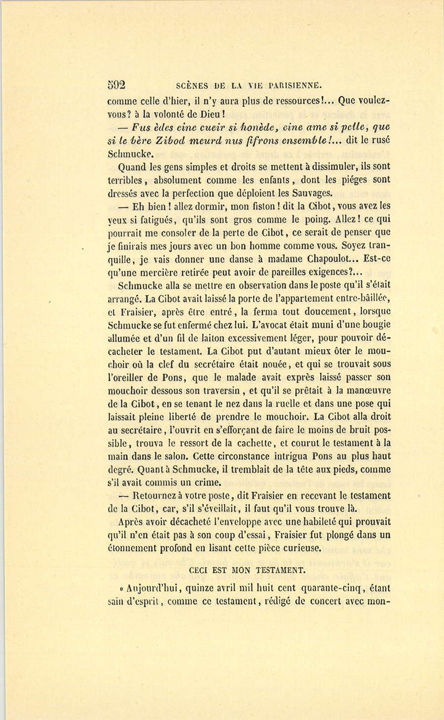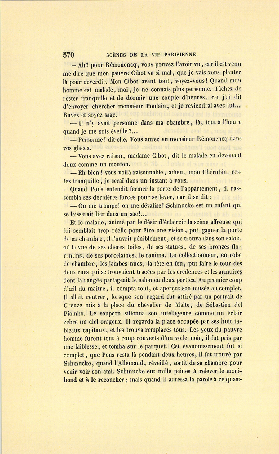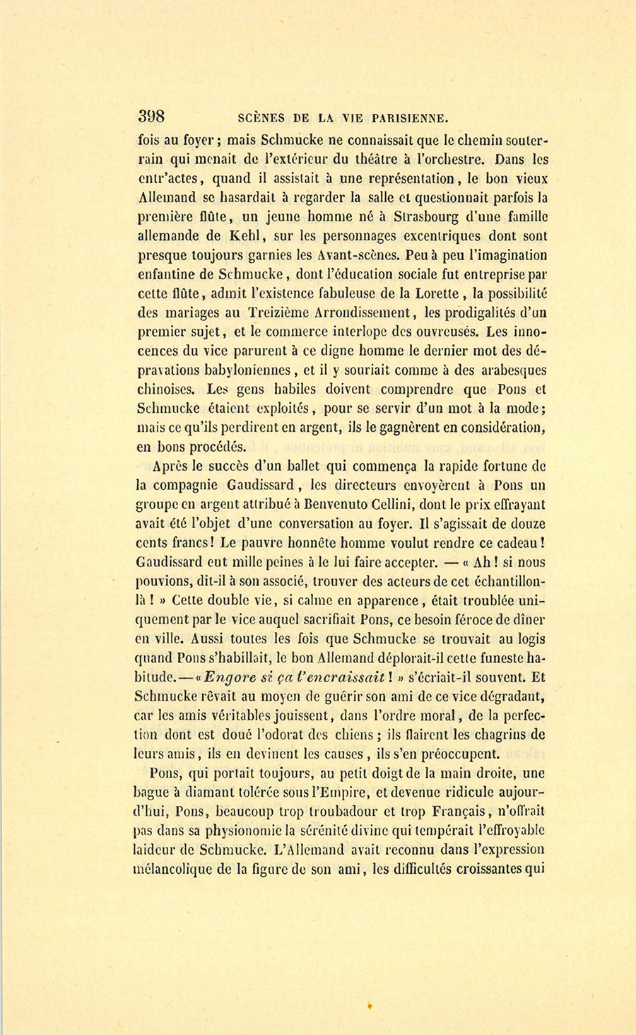 Ce pianiste, comme tous les pianistes, était un Allemand, Allemand comme le grand Listz et le grand Mendelssohn, Allemand comme Steibelt, Allemand comme Mozart et Dusseck, Allemand comme Meyer, Allemand comme Dœlher, Allemand comme Thalberg, comme Dreschok, comme Hiller, comme Léopold Mayer, comme Crammer, comme Zimmerman et Kalkbrenner, comme Herz, Woëtz, Karr, Wolff, Pixis, Clara Wieck, et particulièrement tous les Allemands. Quoique grand compositeur, Schmucke ne pouvait être que démonstrateur, tant son caractère se refusait à l’audace nécessaire à l’homme de génie pour se manifester en musique. La naïveté de beaucoup d’Allemands n’est pas continue, elle a cessé ; celle qui leur est restée à un certain âge, est prise, comme on {p. 393} prend l’eau d’un canal, à la source de leur jeunesse, et ils s’en servent pour fertiliser leur succès en toute chose, science, art ou argent, en écartant d’eux la défiance. En France, quelques gens fins remplacent cette naïveté d’Allemagne par la bêtise de l’épicier parisien. Mais Schmucke avait gardé toute sa naïveté d’enfant, comme Pons gardait sur lui les reliques de l’Empire, sans s’en douter. Ce véritable et noble Allemand était à la fois le spectacle et les spectateurs, il se faisait de la musique à lui-même. Il habitait Paris, comme un rossignol habite sa forêt, et il y chantait seul de son espèce, depuis vingt ans, jusqu’au moment où il rencontra dans Pons un autre lui-même. (Voir Une fille d’Ève.)