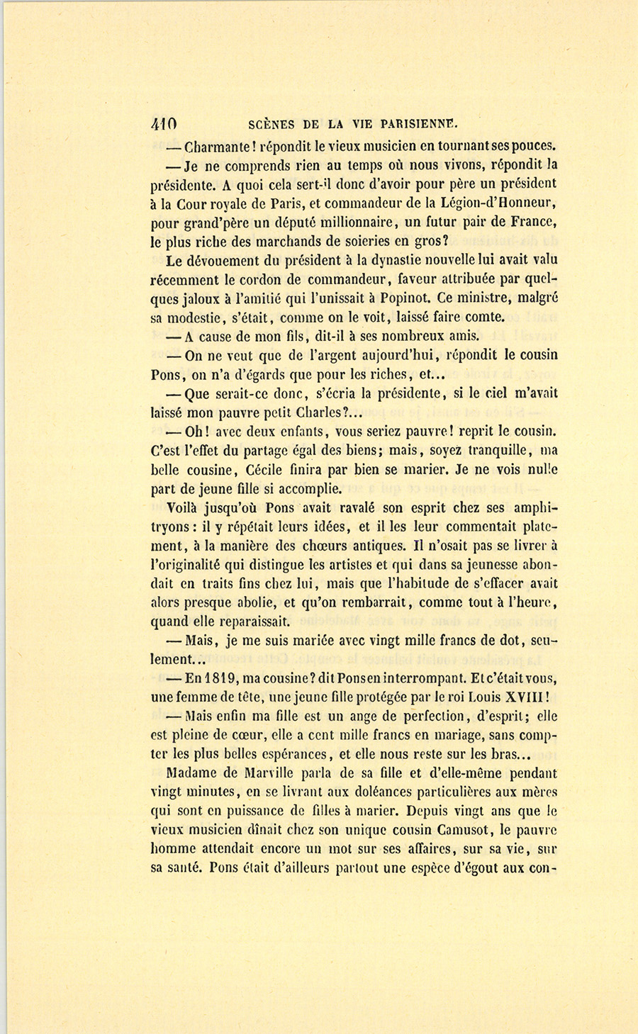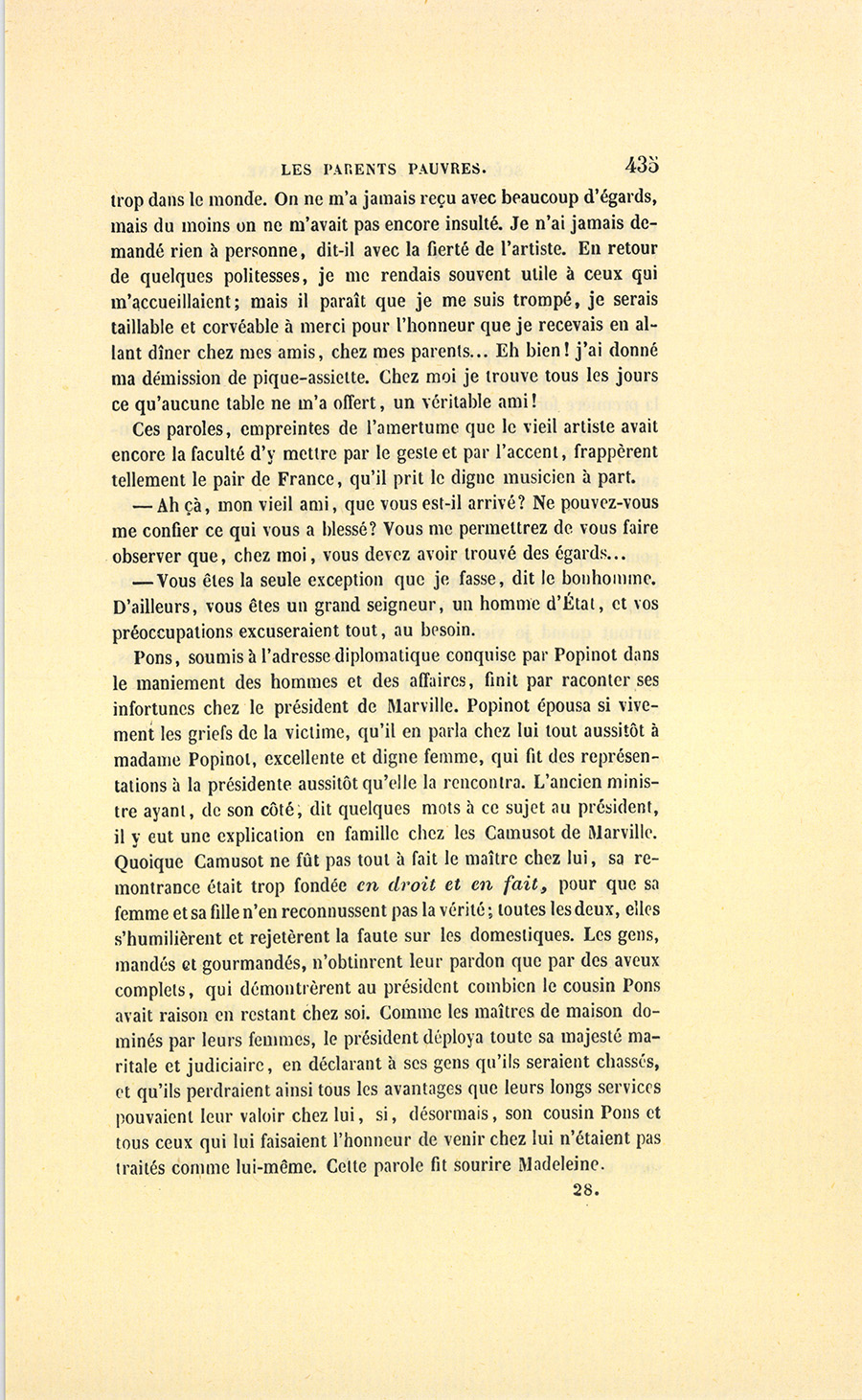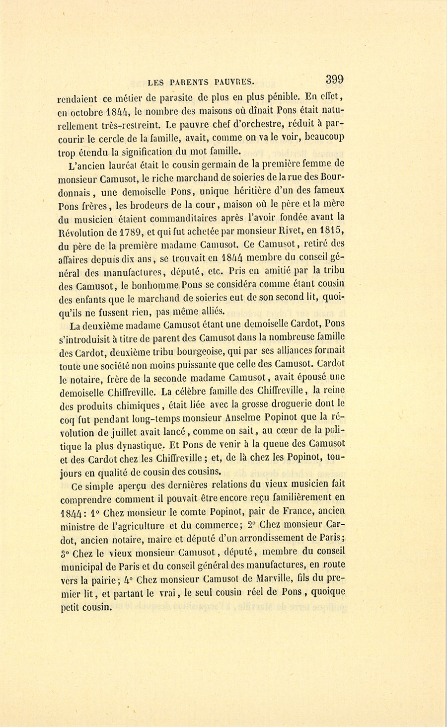Ce simple aperçu des dernières relations du vieux musicien fait comprendre comment il pouvait être encore reçu familièrement en 1844 : 1º Chez monsieur le comte Popinot, pair de France, ancien ministre de l’agriculture et du commerce ; 2º Chez monsieur Cardot, ancien notaire, maire et député d’un arrondissement de Paris ; 3º Chez le vieux monsieur Camusot, député, membre du conseil municipal de Paris et du conseil général des manufactures, en route vers la pairie ; 4º Chez monsieur Camusot de Marville, fils du premier lit, et partant le vrai, le seul cousin réel de Pons, quoique petit cousin.