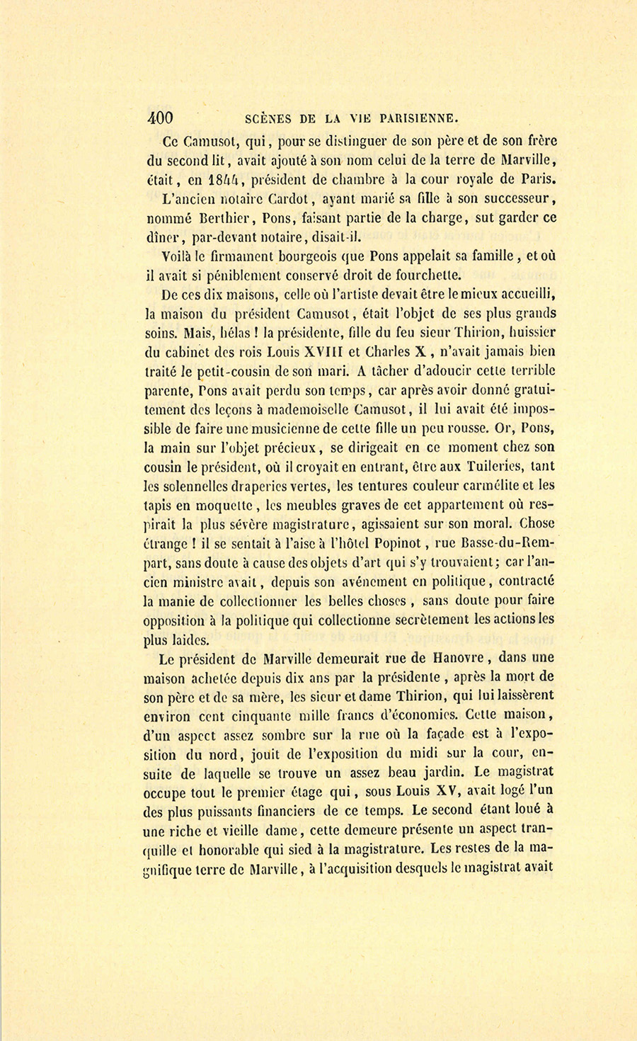 {p. 400} Ce Camusot, qui, pour se distinguer de son père et de son frère du second lit, avait ajouté à son nom celui de la terre de Marville, était, en 1844, président de chambre à la cour royale de Paris.