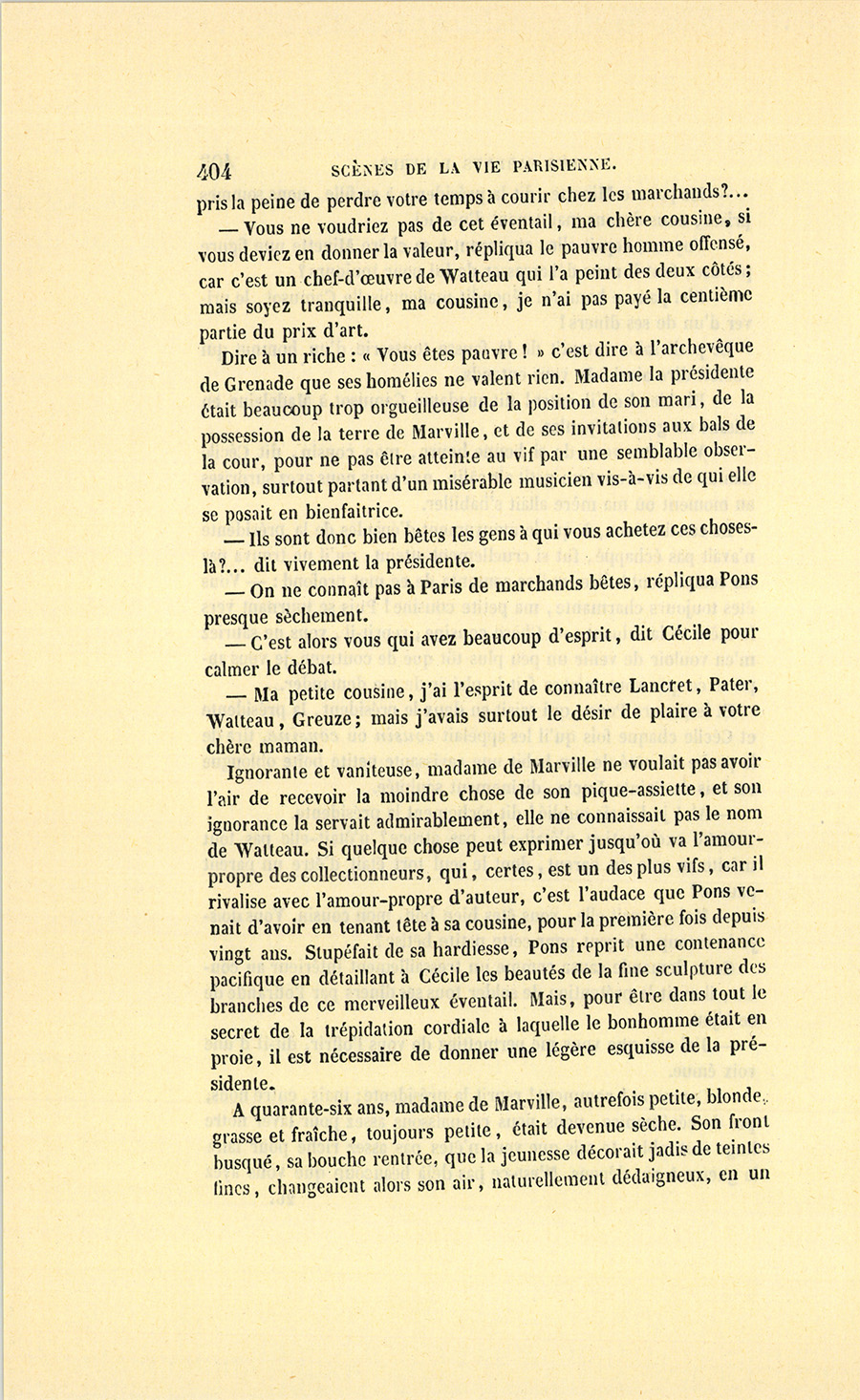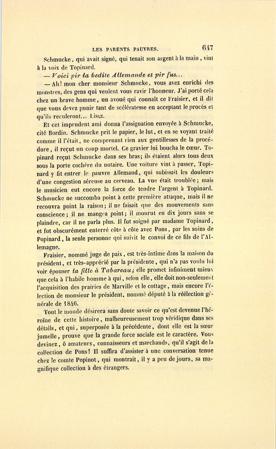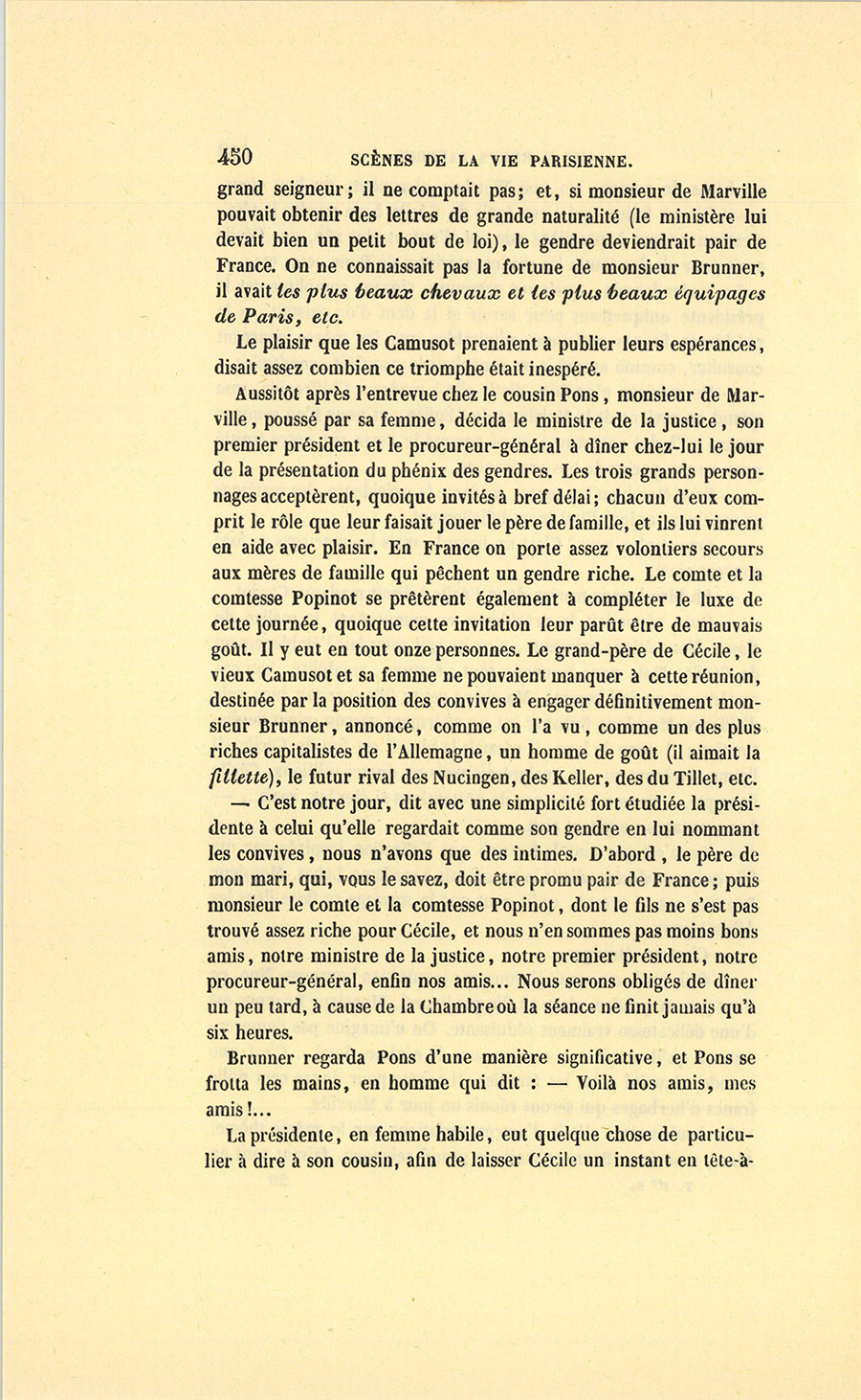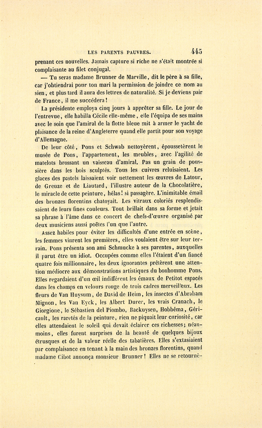 Tout le monde désirera sans doute savoir ce qu’est devenue l’héroïne de cette histoire, malheureusement trop véridique dans ses détails, et qui, superposée à la précédente, dont elle est la sœur jumelle, prouve que la grande force sociale est le caractère. Vous devinez, ô amateurs, connaisseurs et marchands, qu’il s’agit de la collection de Pons ! Il suffira d’assister à une conversation tenue chez le comte Popinot, qui montrait, il y a peu de jours, sa magnifique collection à des étrangers.