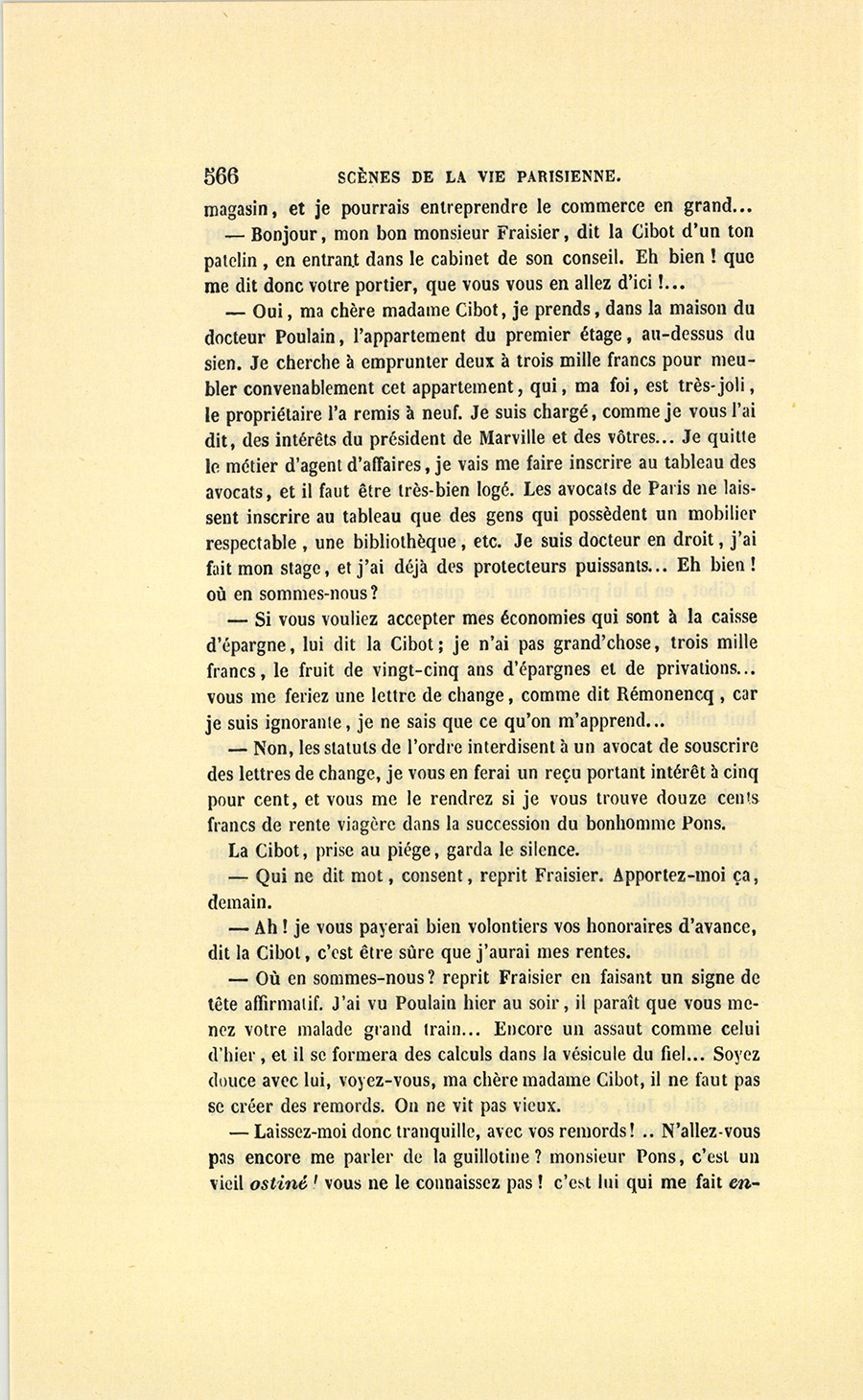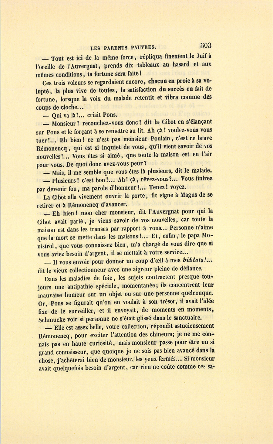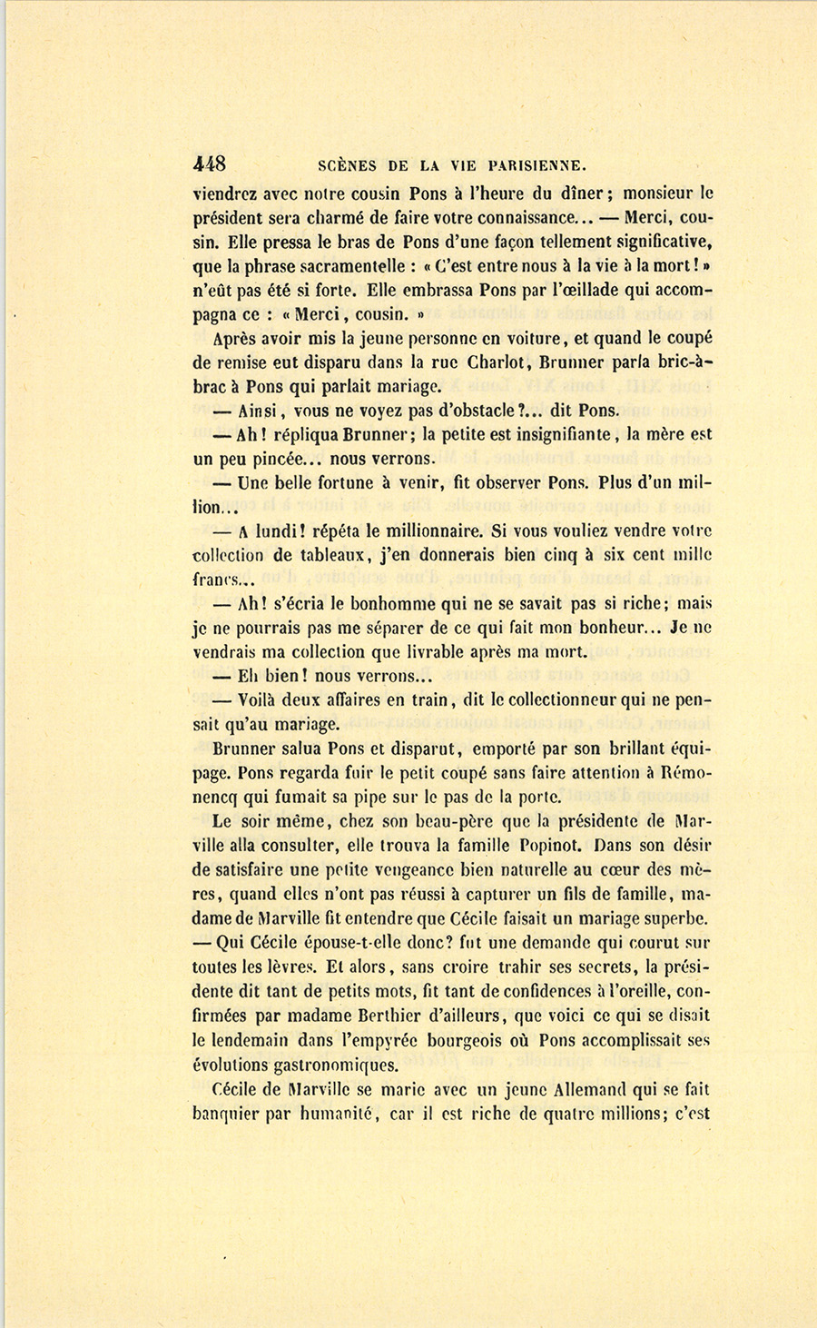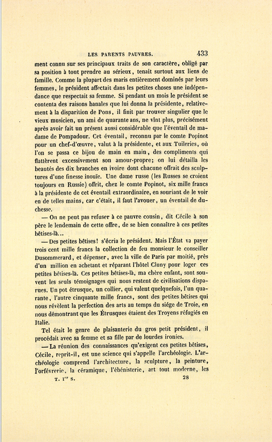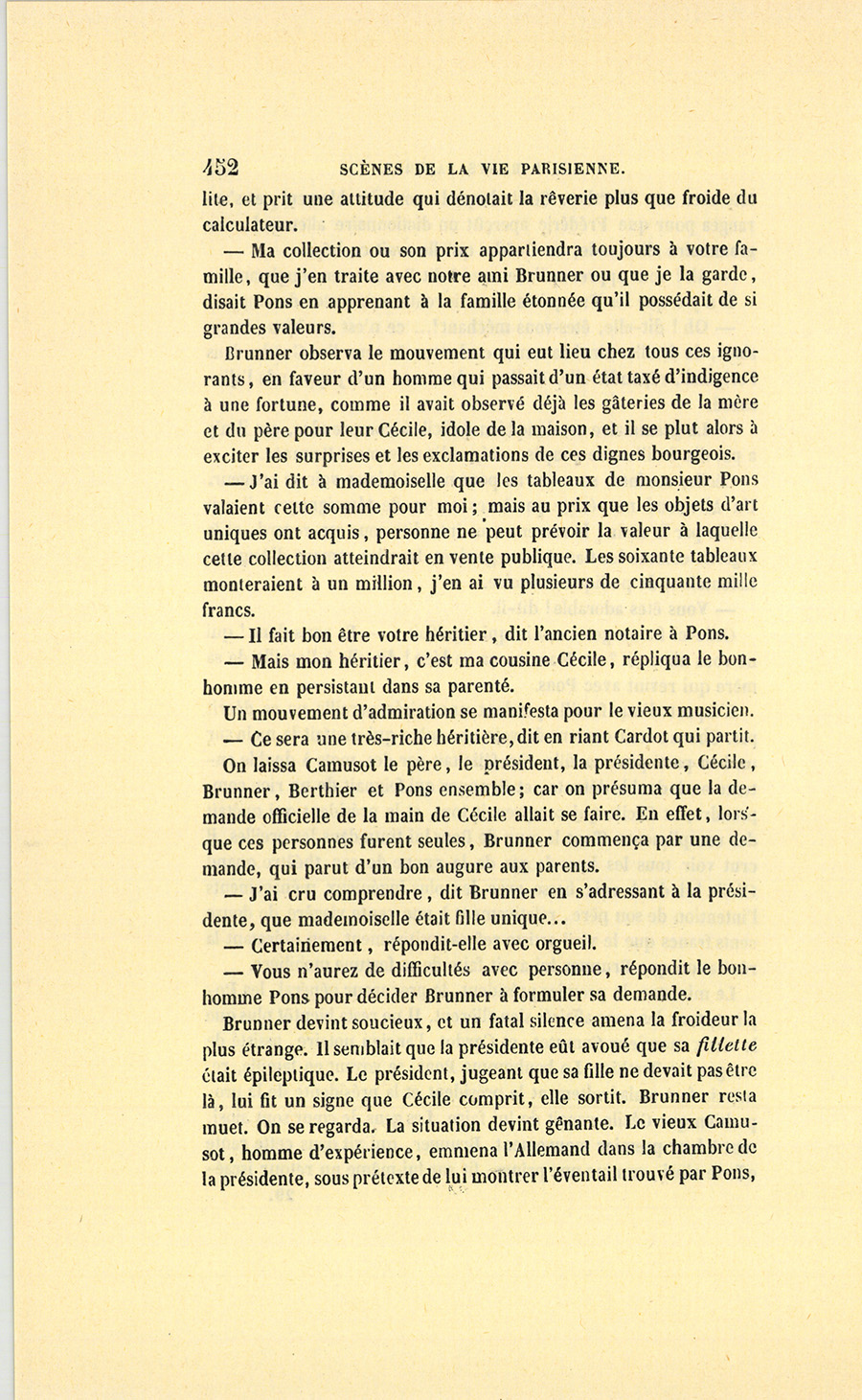Tout le monde désirera sans doute savoir ce qu’est devenue l’héroïne de cette histoire, malheureusement trop véridique dans ses détails, et qui, superposée à la précédente, dont elle est la sœur jumelle, prouve que la grande force sociale est le caractère. Vous devinez, ô amateurs, connaisseurs et marchands, qu’il s’agit de la collection de Pons ! Il suffira d’assister à une conversation tenue chez le comte Popinot, qui montrait, il y a peu de jours, sa magnifique collection à des étrangers.