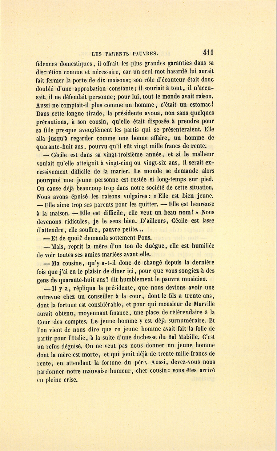 Le président de Marville demeurait rue de Hanovre, dans une maison achetée depuis dix ans par la présidente, après la mort de son père et de sa mère, les sieur et dame Thirion, qui lui laissèrent environ cent cinquante mille francs d’économies. Cette maison, d’un aspect assez sombre sur la rue où la façade est à l’exposition du nord, jouit de l’exposition du midi sur la cour, ensuite de laquelle se trouve un assez beau jardin. Le magistrat occupe tout le premier étage qui, sous Louis XV, avait logé l’un des plus puissants financiers de ce temps. Le second étant loué à une riche et vieille dame, cette demeure présente un aspect tranquille et honorable qui sied à la magistrature. Les restes de la magnifique terre de Marville, à l’acquisition desquels le magistrat avait {p. 401} employé ses économies de vingt ans ainsi que l’héritage de sa mère, se composent du château, splendide monument comme il s’en rencontre encore en Normandie, et d’une bonne ferme de douze mille francs. Un parc de cent hectares entoure le château. Ce luxe, aujourd’hui princier, coûte un millier d’écus au président, en sorte que la terre ne rapporte guère que neuf mille francs en sac, comme on dit. Ces neuf mille francs et son traitement donnaient alors au président une fortune d’environ vingt mille francs de rente, en apparence suffisante, surtout en attendant la moitié qui devait lui revenir dans la succession de son père, où il représentait à lui seul le premier lit ; mais la vie de Paris et les convenances de leur position avaient obligé monsieur et madame de Marville à dépenser la presque totalité de leurs revenus. Jusqu’en 1834, ils s’étaient trouvés gênés.