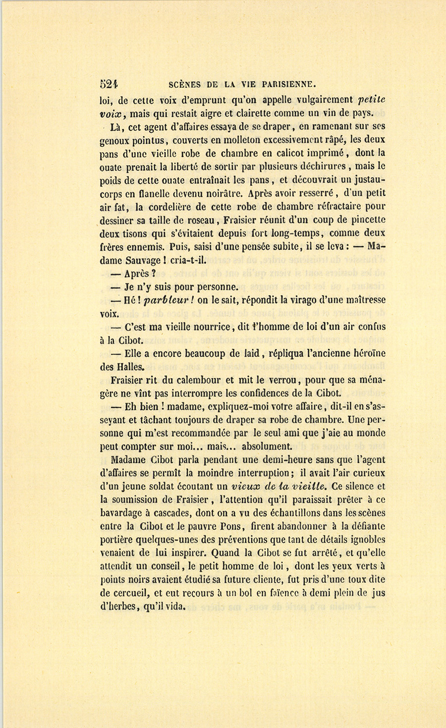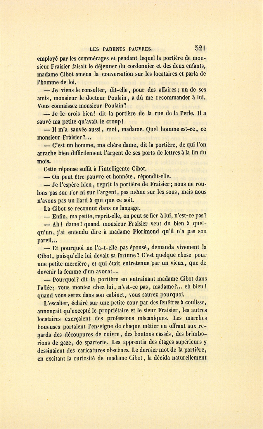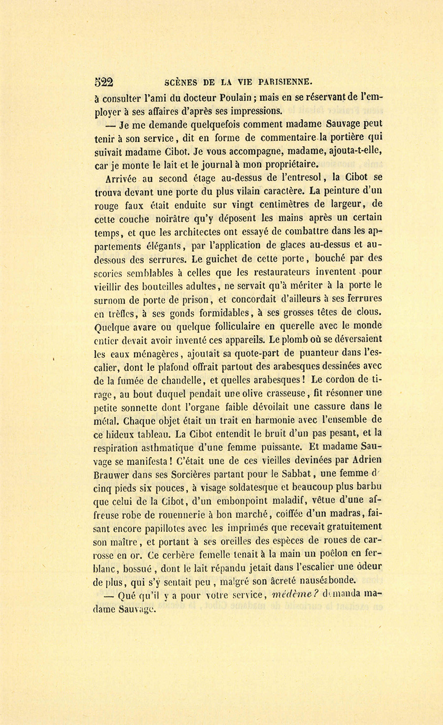 Madame Cibot, la portière de cette maison, était le pivot sur lequel roulait le ménage des deux casse-noisettes ; mais elle joue un {p. 395} si grand rôle dans le drame qui dénoua cette double existence, qu’il convient de réserver son portrait au moment de son entrée dans cette Scène.