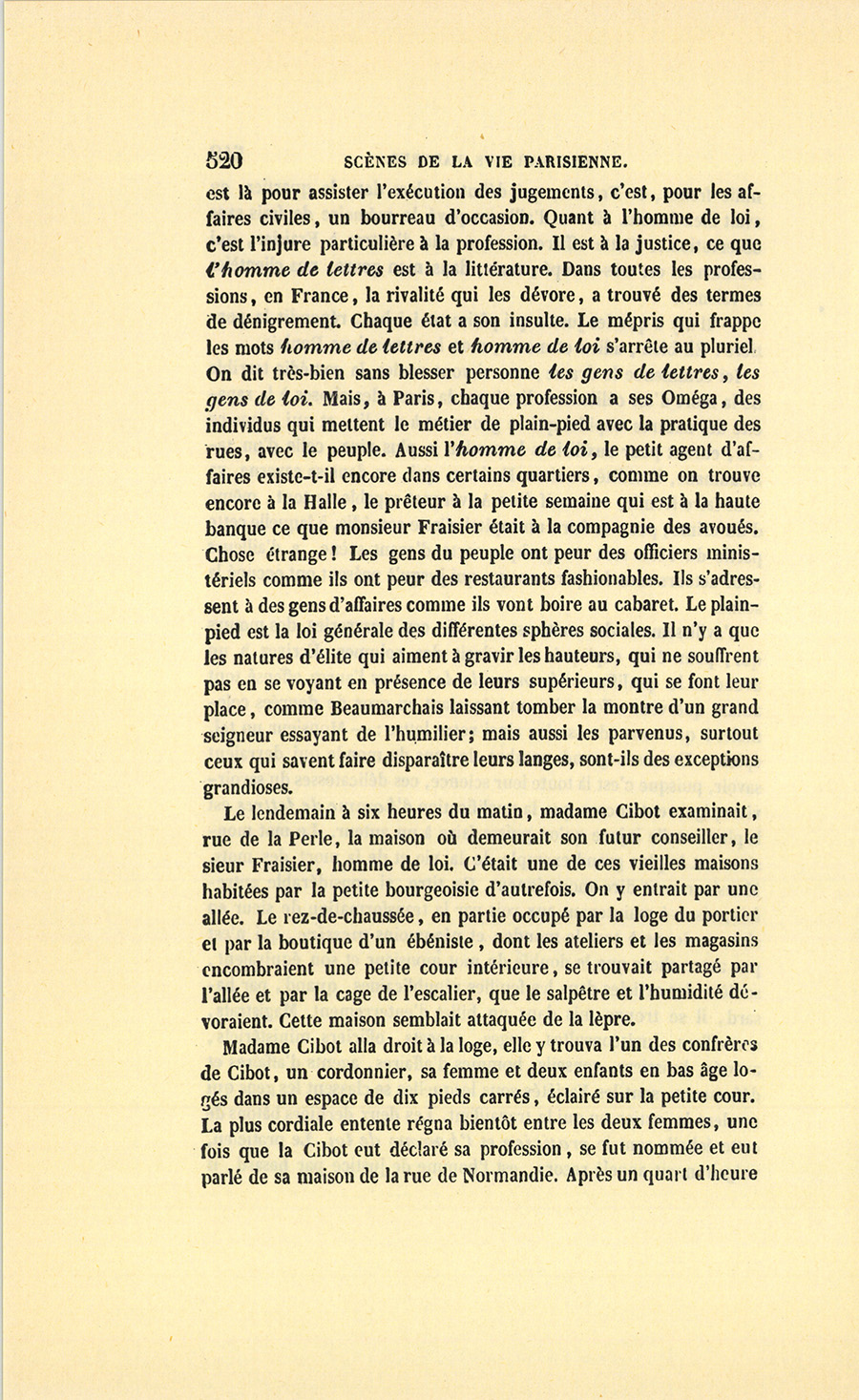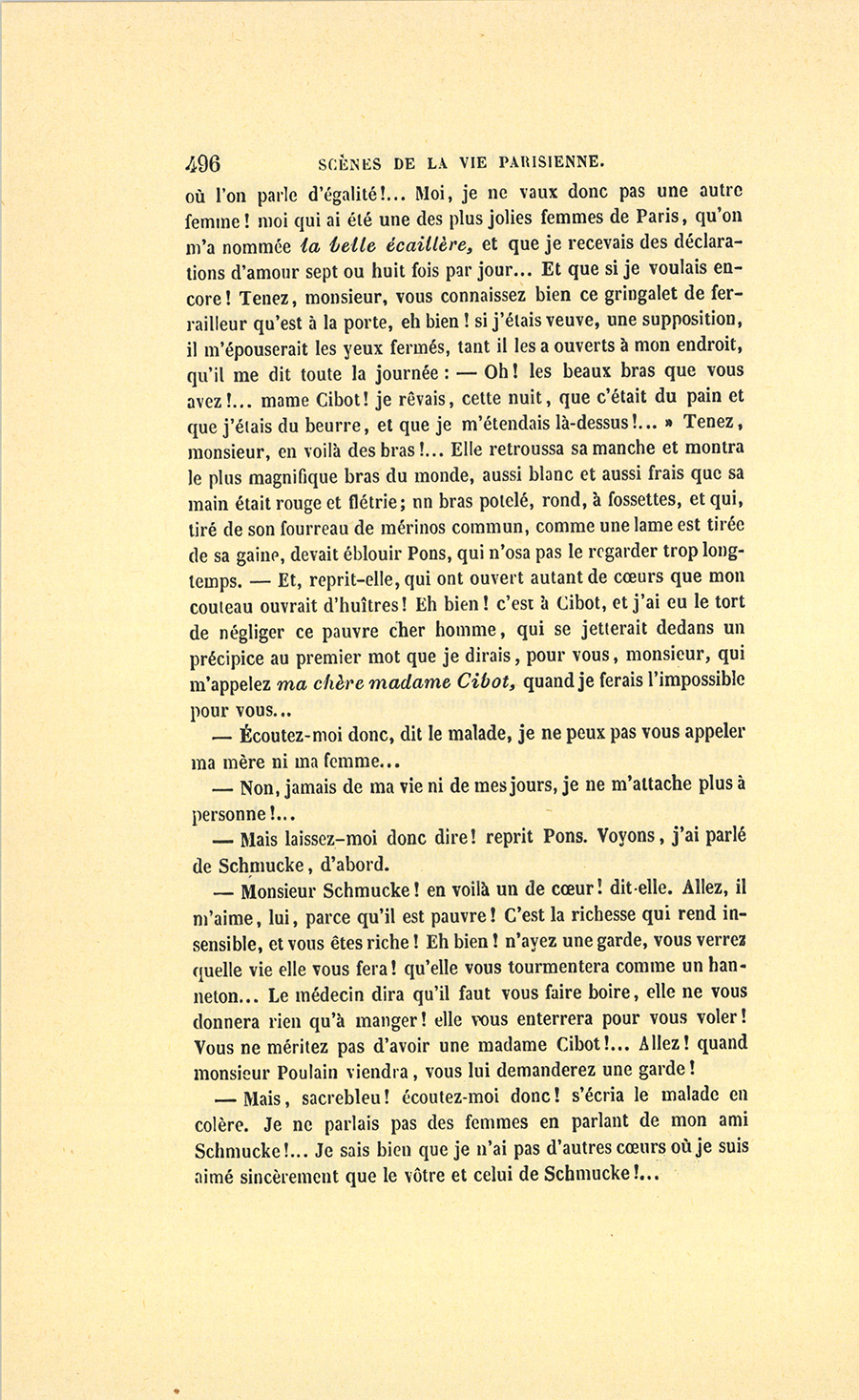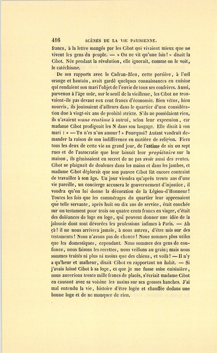 Madame Cibot, la portière de cette maison, était le pivot sur lequel roulait le ménage des deux casse-noisettes ; mais elle joue un {p. 395} si grand rôle dans le drame qui dénoua cette double existence, qu’il convient de réserver son portrait au moment de son entrée dans cette Scène.