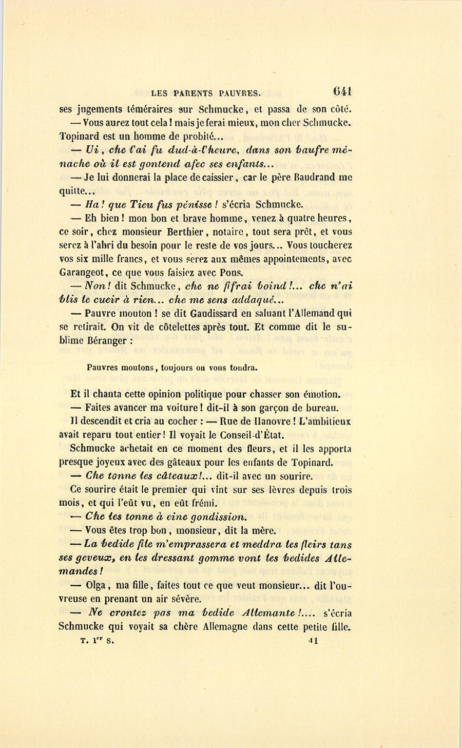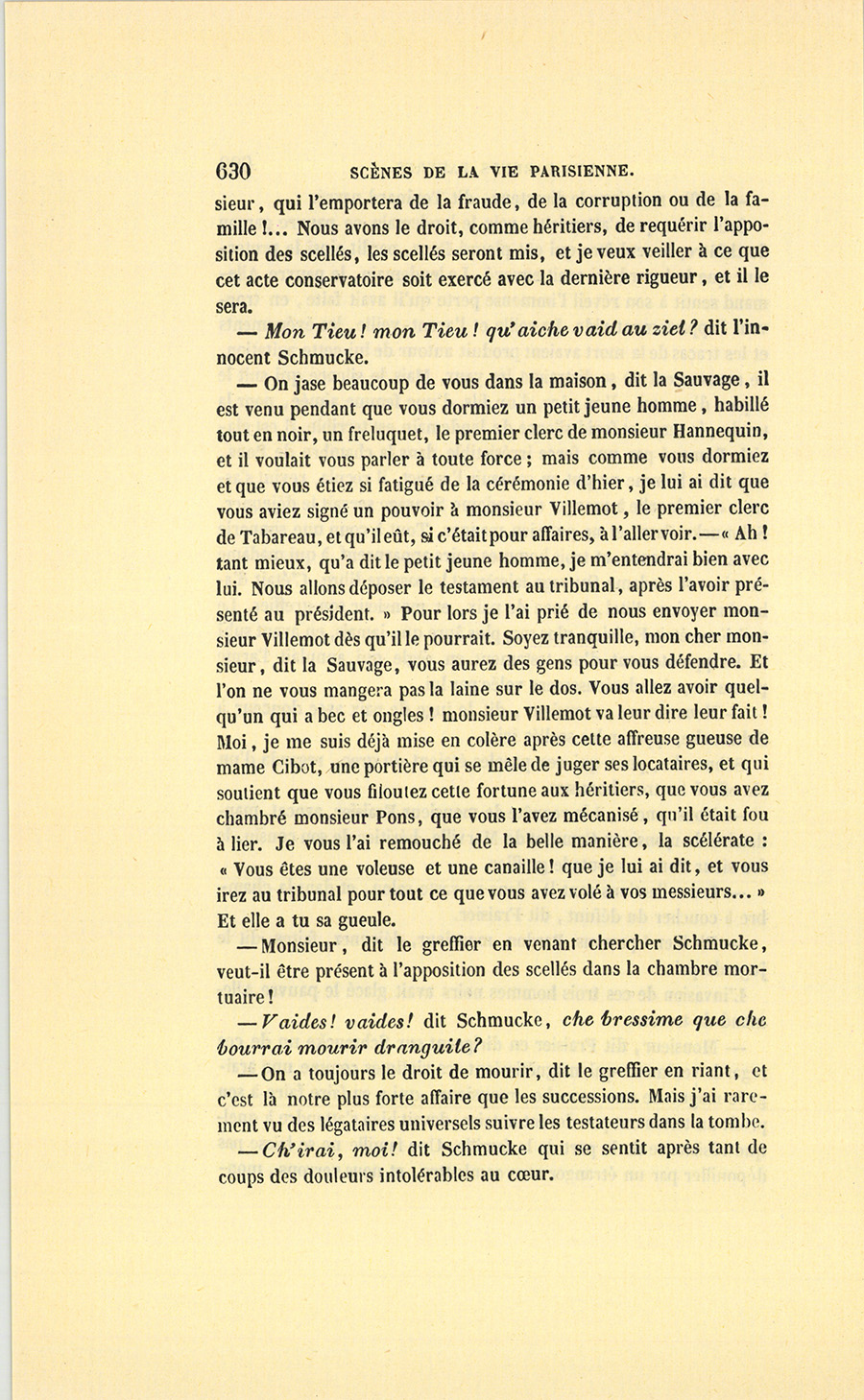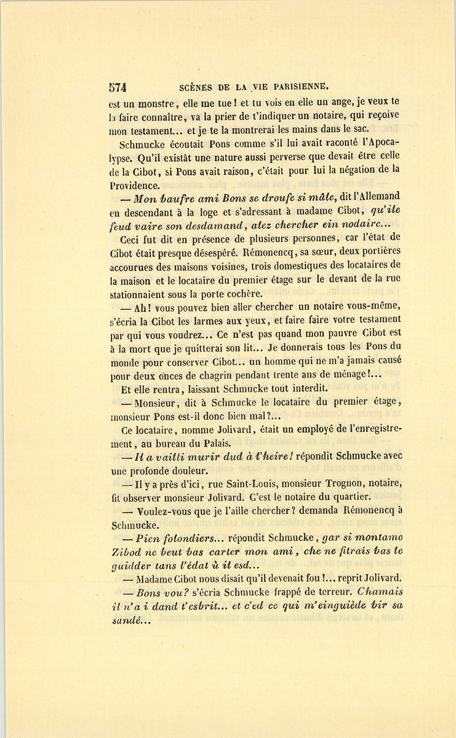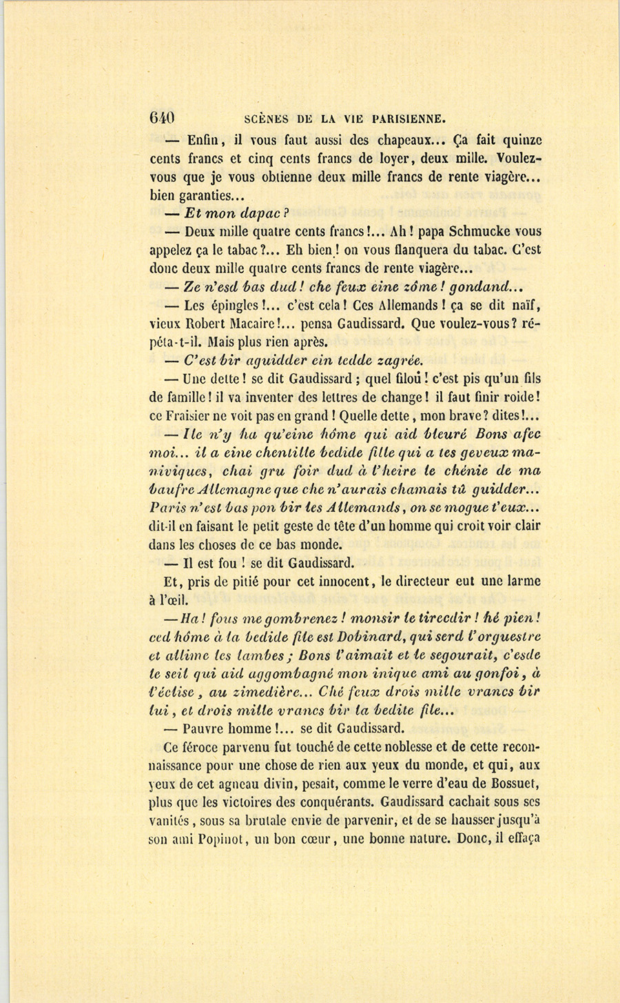 – Ha ! fit l’Allemand, mon ami, foici teux sante vrancs pir dud payer… Mais vous afez une chantile femme, fus l’épiserez, n’est-ce bas ? Che fus donne mille écus… La bedide file aura eine tode te mile écus que fus blacerez en son nom. Ed fus ne serez plis cachisde… fus allez êdre le gaissier du théâdre…