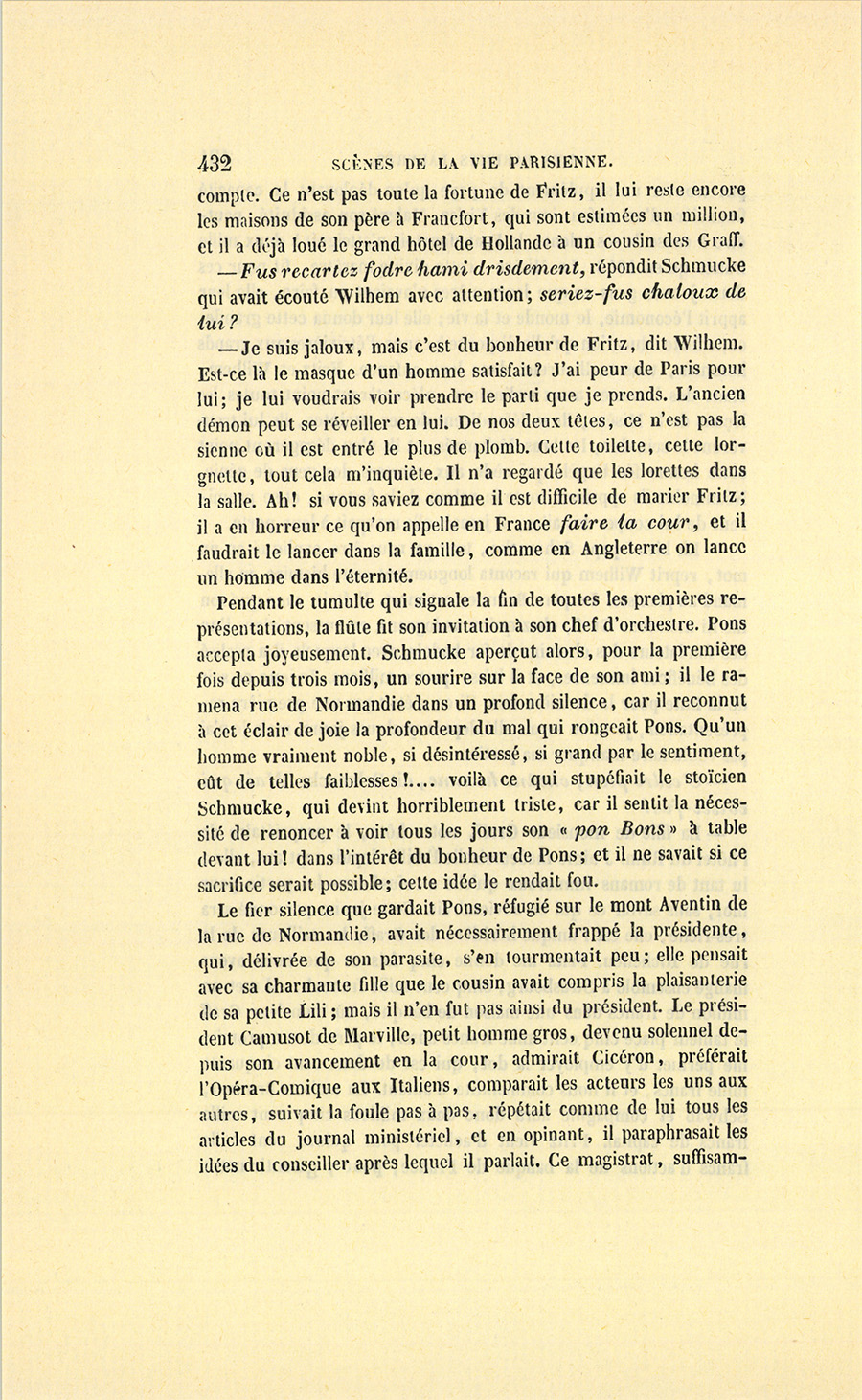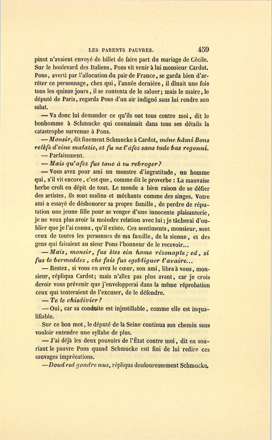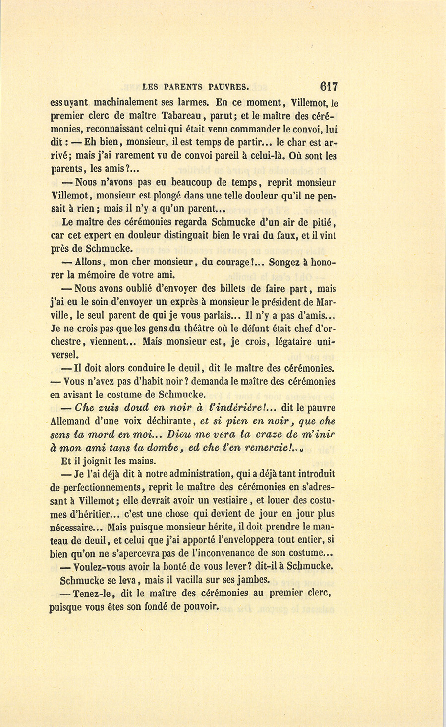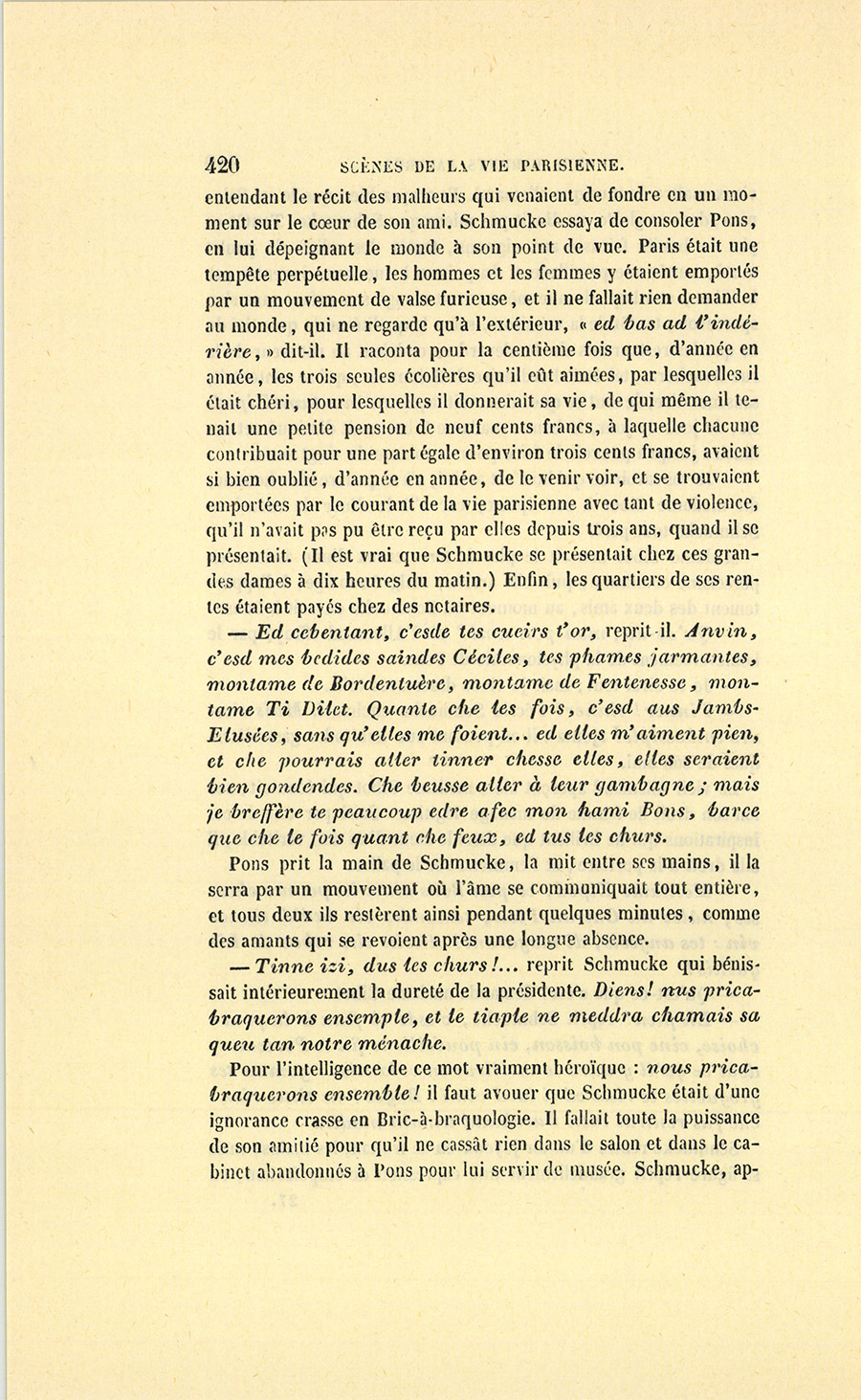 – Ha ! fit l’Allemand, mon ami, foici teux sante vrancs pir dud payer… Mais vous afez une chantile femme, fus l’épiserez, n’est-ce bas ? Che fus donne mille écus… La bedide file aura eine tode te mile écus que fus blacerez en son nom. Ed fus ne serez plis cachisde… fus allez êdre le gaissier du théâdre…