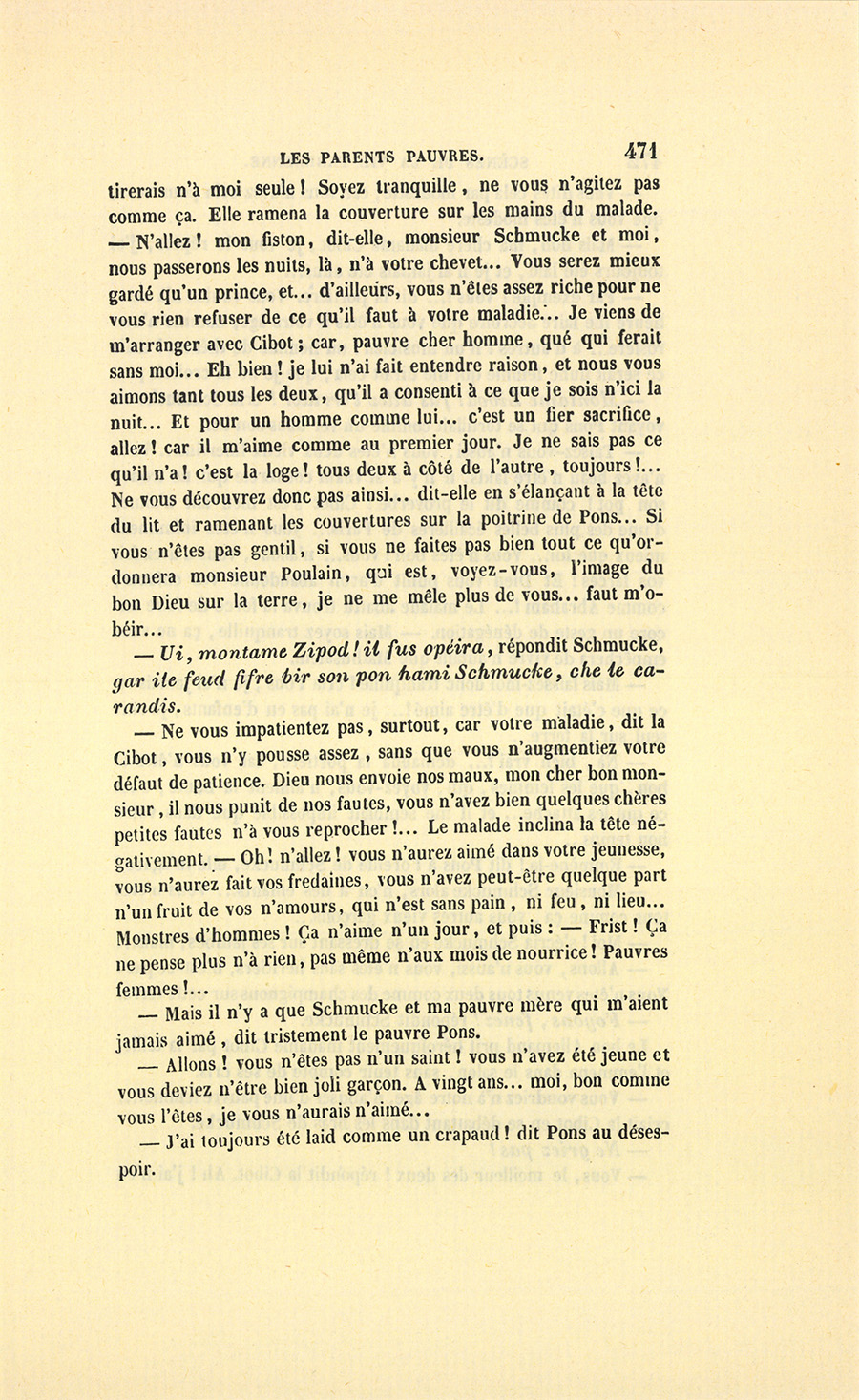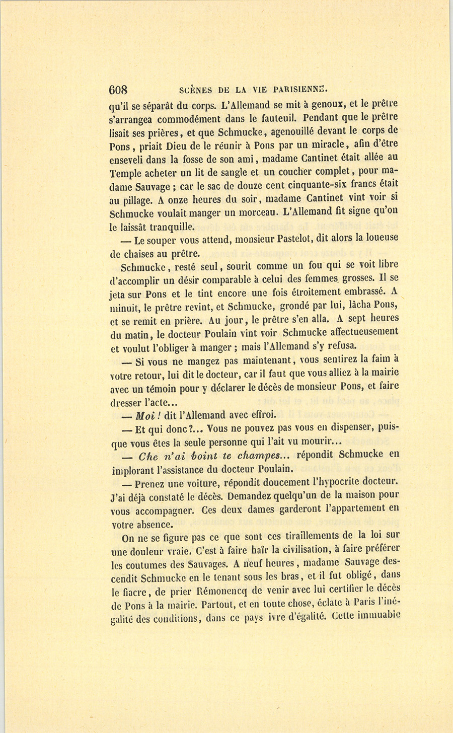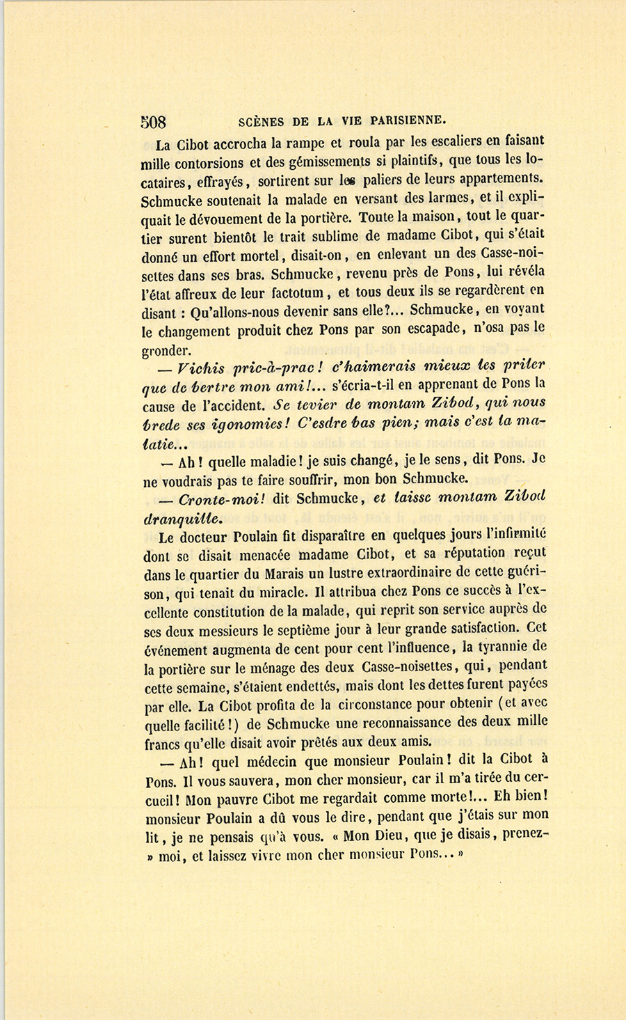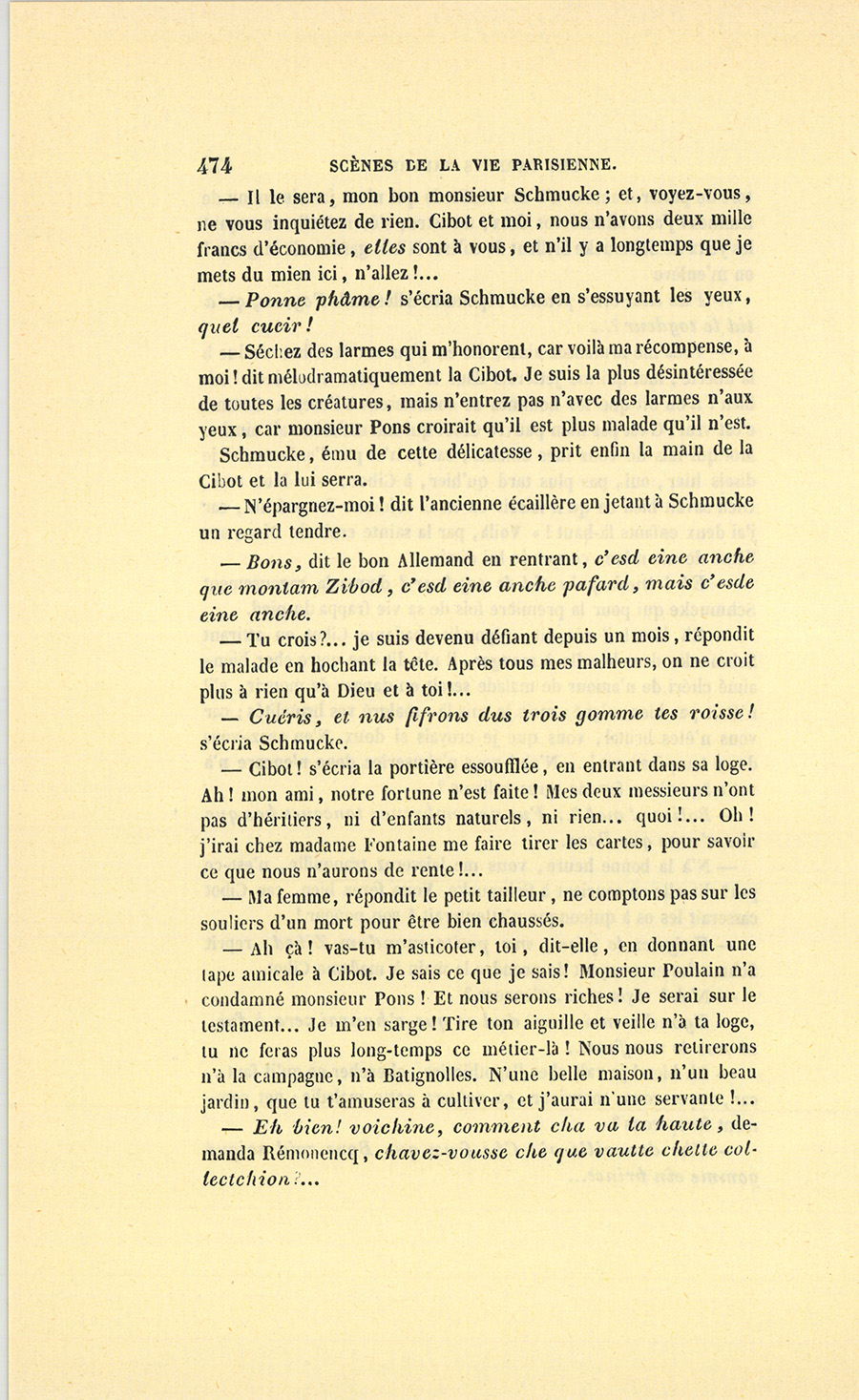 – Ha ! fit l’Allemand, mon ami, foici teux sante vrancs pir dud payer… Mais vous afez une chantile femme, fus l’épiserez, n’est-ce bas ? Che fus donne mille écus… La bedide file aura eine tode te mile écus que fus blacerez en son nom. Ed fus ne serez plis cachisde… fus allez êdre le gaissier du théâdre…