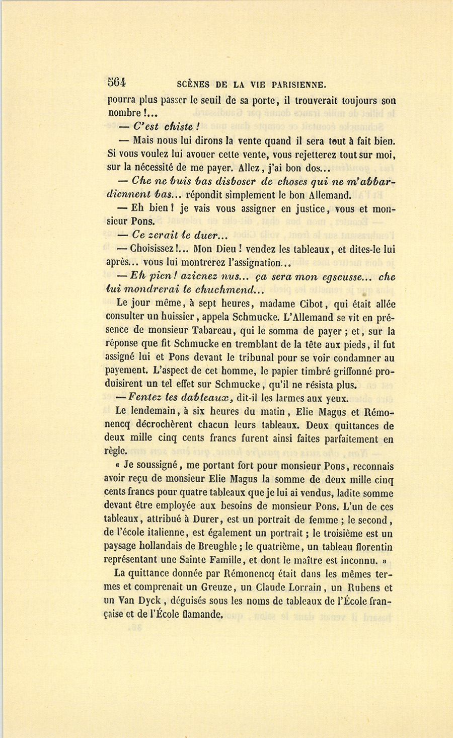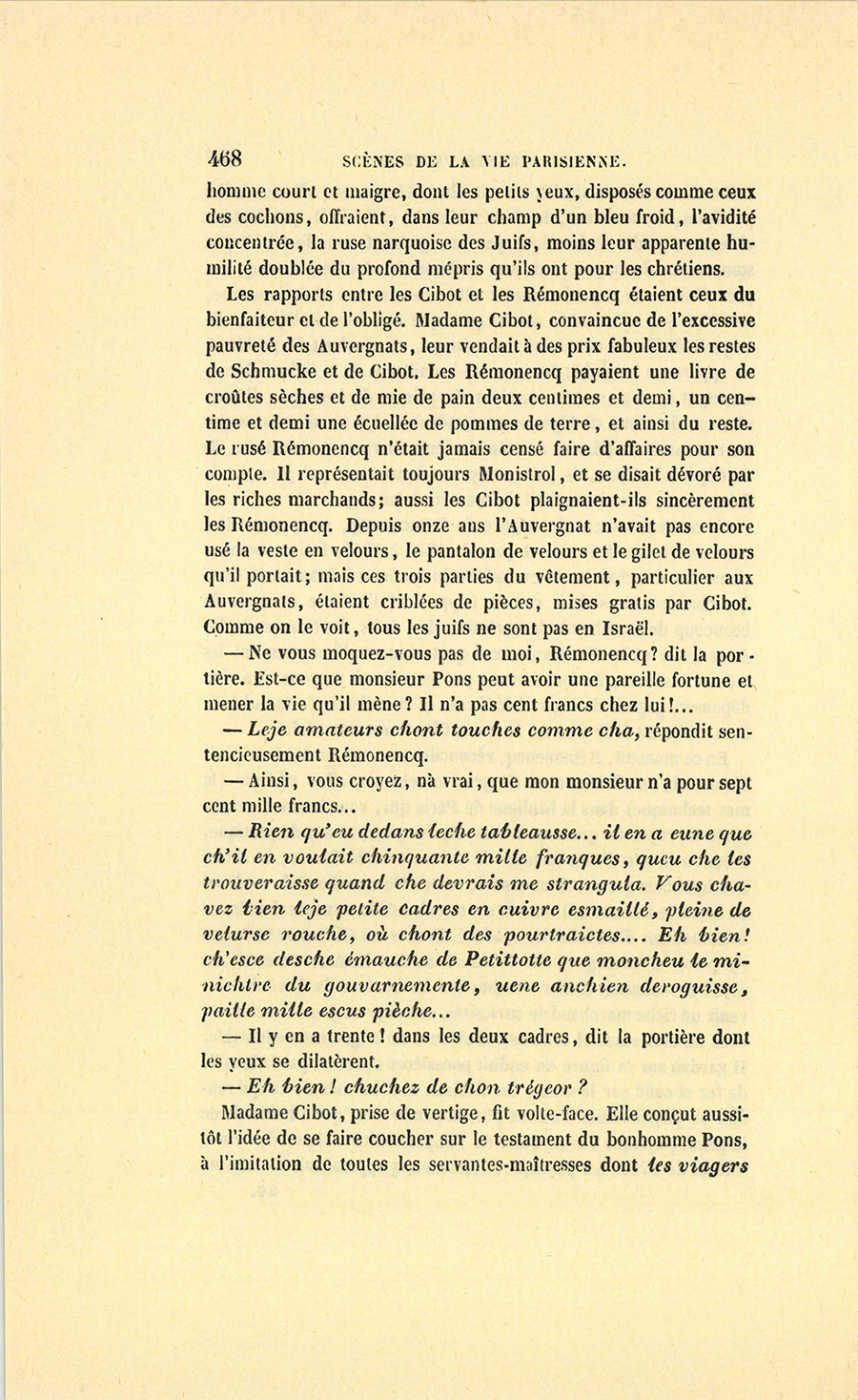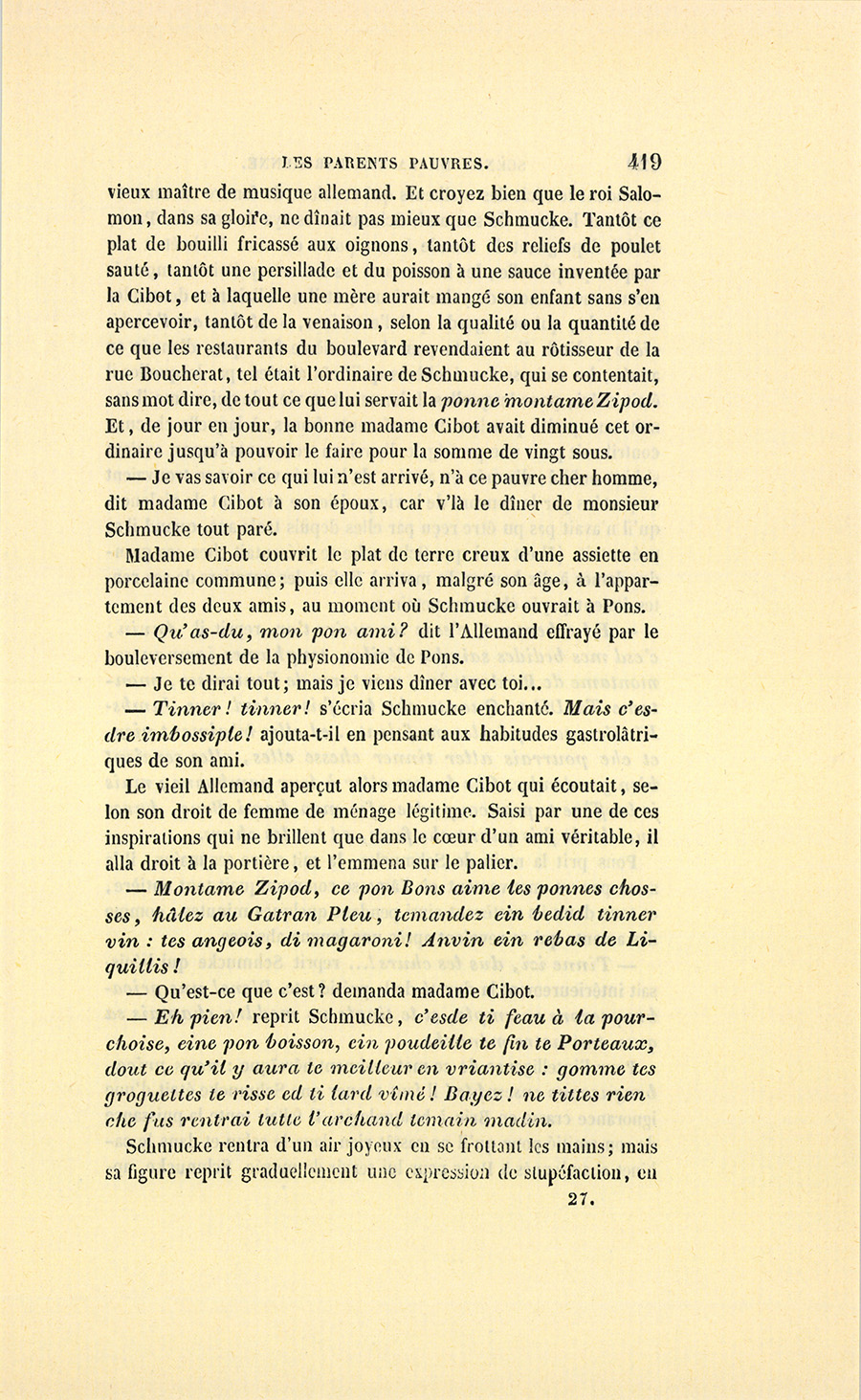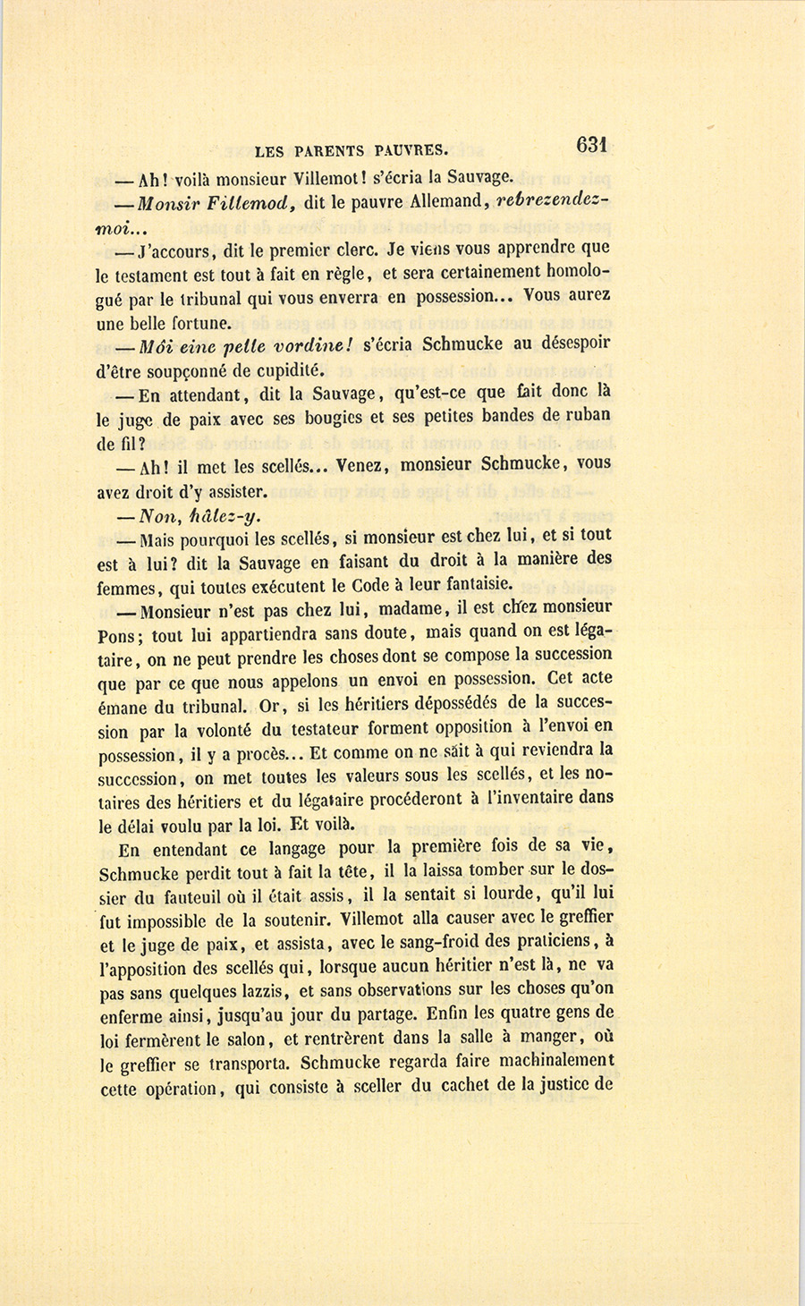 – Ha ! fit l’Allemand, mon ami, foici teux sante vrancs pir dud payer… Mais vous afez une chantile femme, fus l’épiserez, n’est-ce bas ? Che fus donne mille écus… La bedide file aura eine tode te mile écus que fus blacerez en son nom. Ed fus ne serez plis cachisde… fus allez êdre le gaissier du théâdre…