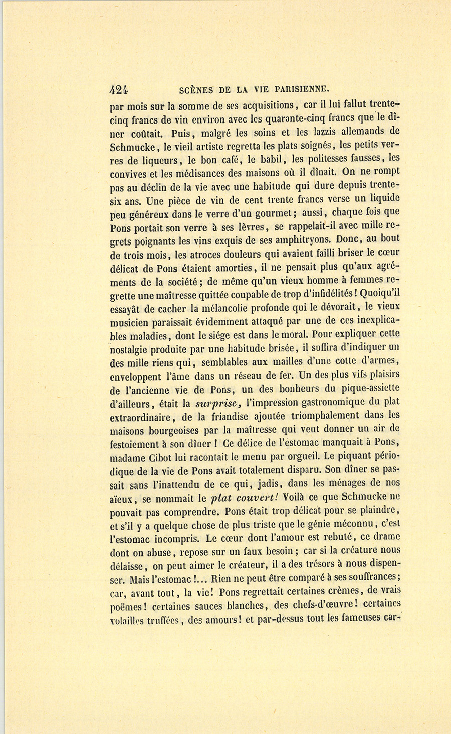 Pendant cette période, qui dura six ans environ, de 1810 à 1816, Pons contracta la funeste habitude de bien dîner, de voir les personnes qui l’invitaient se mettant en frais, se procurant des primeurs, débouchant leurs meilleurs vins, soignant le dessert, le café, les liqueurs, et le traitant de leur mieux, comme on traitait sous l’Empire, où beaucoup de maisons imitaient les splendeurs des rois, des reines, des princes dont regorgeait Paris. On jouait beaucoup alors à la royauté, comme on joue aujourd’hui à la Chambre en créant une foule de Sociétés à présidents, vice-présidents et secrétaires ; Société linière, vinicole, séricicole, agricole, de l’industrie, etc. On est arrivé jusqu’à chercher des plaies sociales pour constituer les guérisseurs en société ! Un estomac dont l’éducation se fait ainsi, réagit nécessairement sur le moral et le corrompt en raison de la haute sapience culinaire qu’il acquiert. La Volupté, tapie dans tous les plis du cœur, y parle en souveraine, elle bat en brèche la volonté, l’honneur, elle veut à tout prix sa {p. 389} satisfaction. On n’a jamais peint les exigences de la Gueule, elles échappent à la critique littéraire par la nécessité de vivre ; mais on ne se figure pas le nombre des gens que la Table a ruinés. La Table est, à Paris, sous ce rapport, l’émule de la courtisane ; c’est, d’ailleurs, la Recette dont celle-ci est la Dépense. Lorsque, d’invité perpétuel, Pons arriva, par sa décadence comme artiste, à l’état de pique-assiette, il lui fut impossible de passer de ces tables si bien servies au brouet lacédémonien d’un restaurant à quarante sous. Hélas ! il lui prit des frissons en pensant que son indépendance tenait à de si grands sacrifices, et il se sentit capable des plus grandes lâchetés pour continuer à bien vivre, à savourer toutes les primeurs à leur date, enfin à gobichonner (mot populaire, mais expressif) de bons petits plats soignés. Oiseau picoreur, s’enfuyant le gosier plein, et gazouillant un air pour tout remercîment, Pons éprouvait d’ailleurs un certain plaisir à bien vivre aux dépens de la société qui lui demandait, quoi ? de la monnaie de singe. Habitué, comme tous les célibataires qui ont le chez soi en horreur et qui vivent chez les autres, à ces formules, à ces grimaces sociales par lesquelles on remplace les sentiments dans le monde, il se servait des compliments comme de menue monnaie ; et, à l’égard des personnes, il se contentait des étiquettes sans plonger une main curieuse dans les sacs.