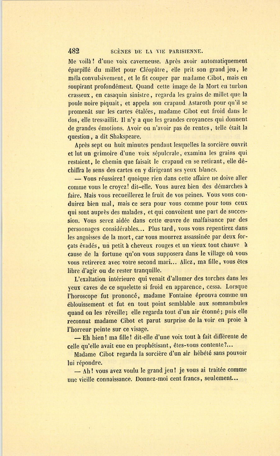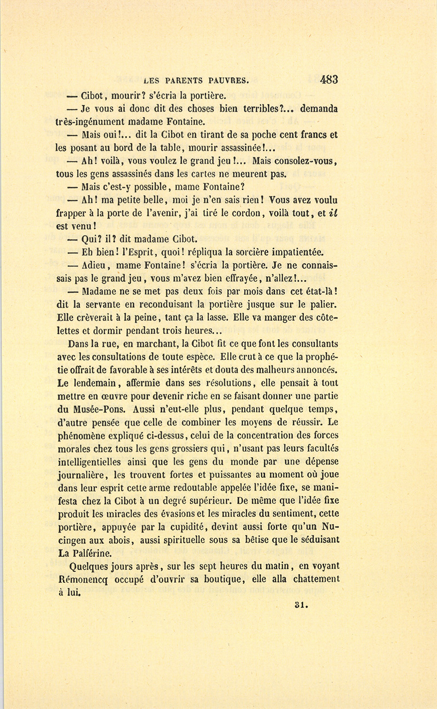 Madame Rémonencq, frappée de la prédiction de madame Fontaine, ne veut pas se retirer à la campagne, elle reste dans son magnifique magasin du boulevard de la Madeleine, encore une fois veuve. En effet, l’Auvergnat, après s’être fait donner par contrat de mariage les biens au dernier vivant, avait mis à portée de sa femme un petit verre de vitriol, comptant sur une erreur, et sa femme, dans une intention excellente, ayant mis ailleurs le petit verre, Rémonencq l’avala. Cette fin, digne de ce scélérat, prouve {p. 650} en faveur de la Providence que les peintres de mœurs sont accusés d’oublier, peut-être à cause des dénoûments de drames qui en abusent.