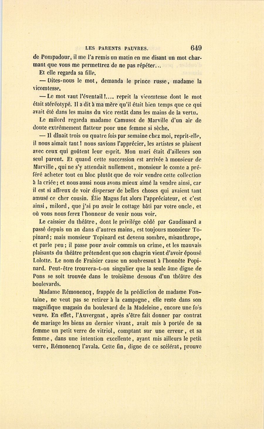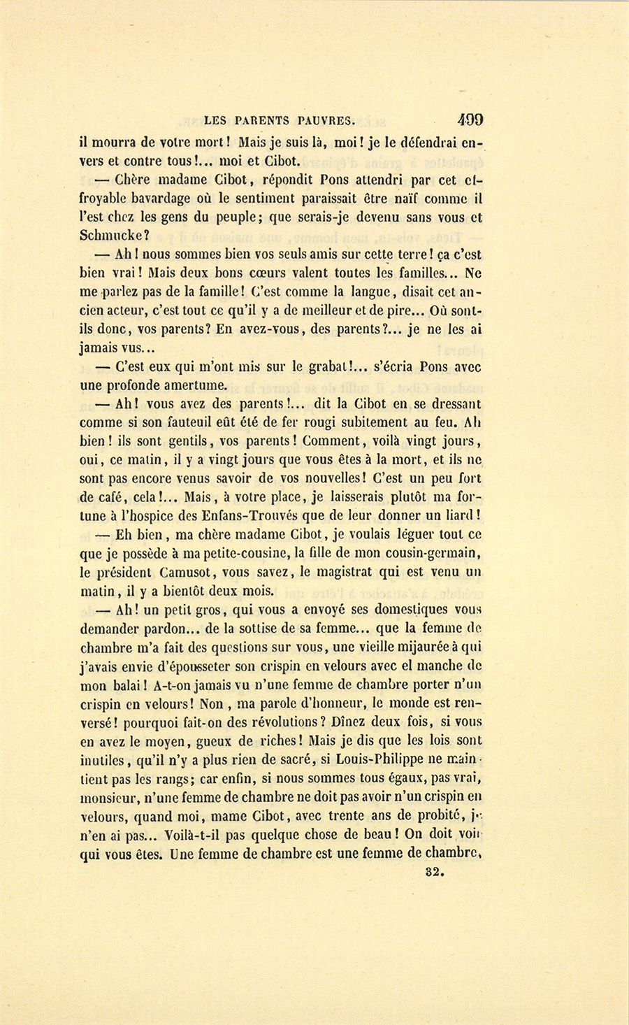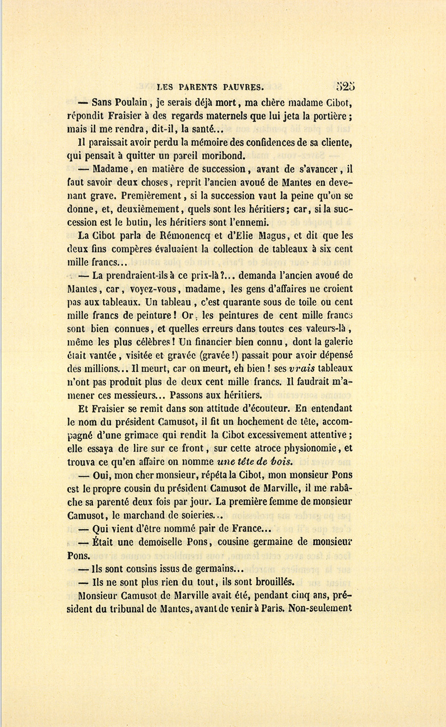 L’ancien lauréat était le cousin germain de la première femme de monsieur Camusot, le riche marchand de soieries de la rue des Bourdonnais, une demoiselle Pons, unique héritière d’un des fameux Pons frères, les brodeurs de la cour, maison où le père et la mère du musicien étaient commanditaires après l’avoir fondée avant la Révolution de 1789, et qui fut achetée par monsieur Rivet, en 1815, du père de la première madame Camusot. Ce Camusot, retiré des affaires depuis dix ans, se trouvait en 1844 membre du conseil général des manufactures, député, etc. Pris en amitié par la tribu des Camusot, le bonhomme Pons se considéra comme étant cousin des enfants que le marchand de soieries eut de son second lit, quoiqu’ils ne fussent rien, pas même alliés.
