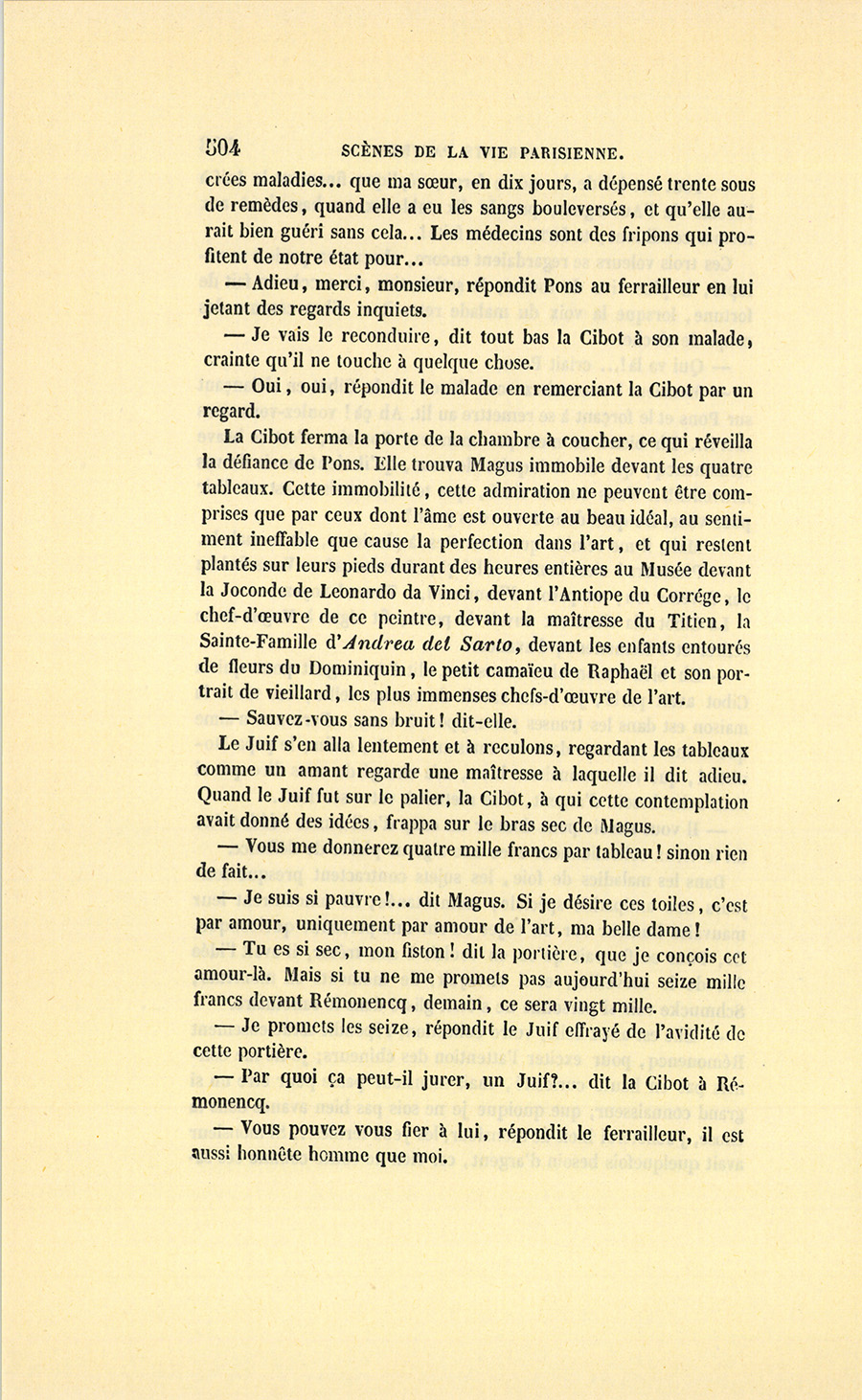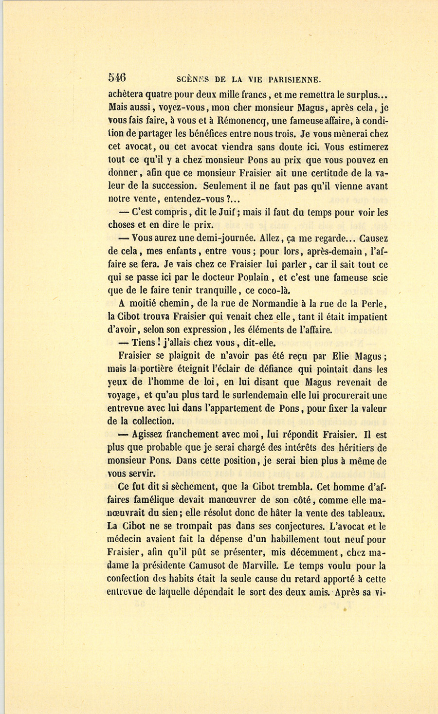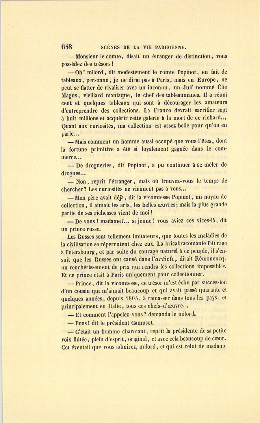 – Oh ! milord, dit modestement le comte Popinot, en fait de tableaux, personne, je ne dirai pas à Paris, mais en Europe, ne peut se flatter de rivaliser avec un inconnu, un Juif nommé Élie Magus, vieillard maniaque, le chef des tableaumanes. Il a réuni cent et quelques tableaux qui sont à décourager les amateurs d’entreprendre des collections. La France devrait sacrifier sept à huit millions et acquérir cette galerie à la mort de ce richard… Quant aux curiosités, ma collection est assez belle pour qu’on en parle…