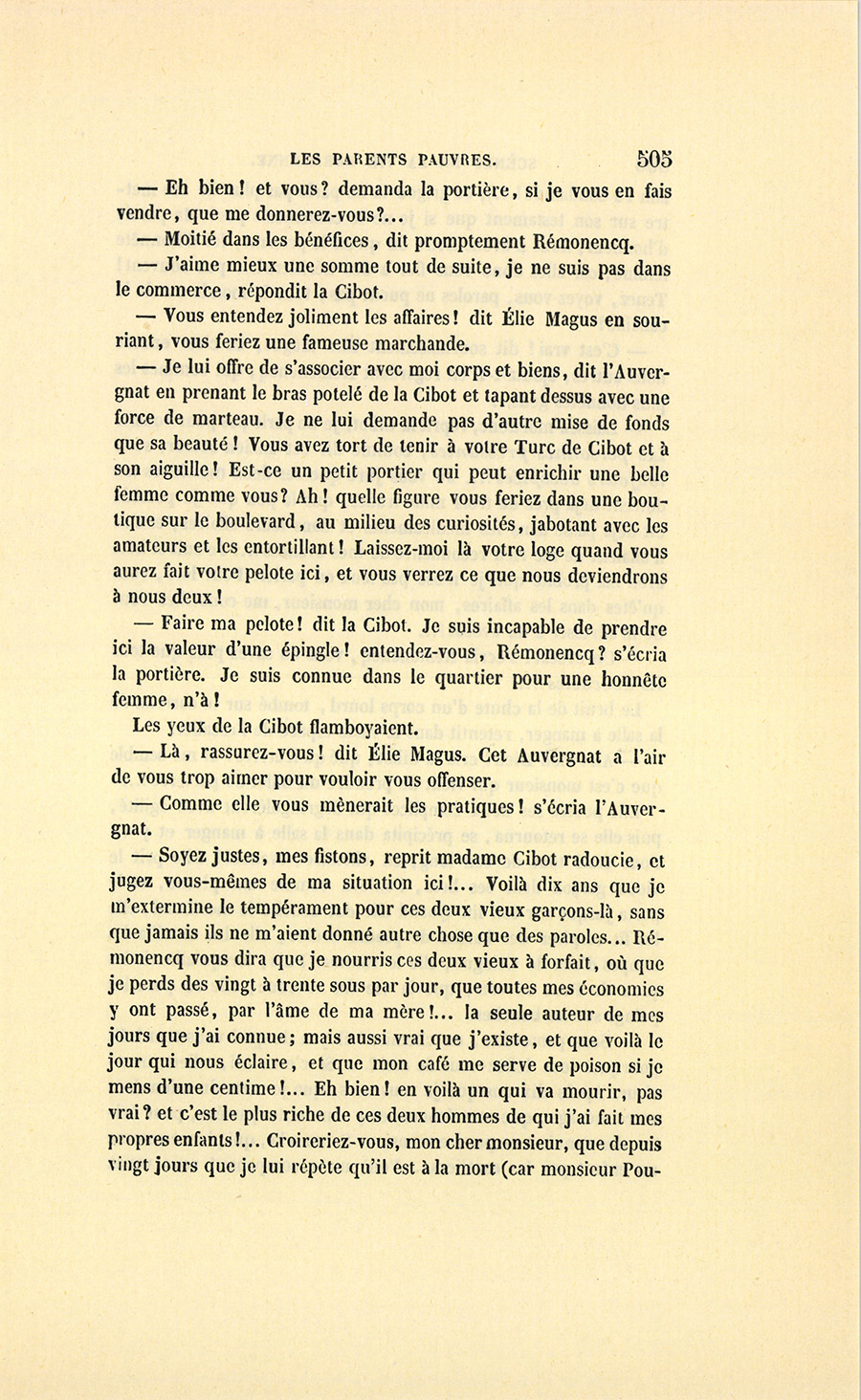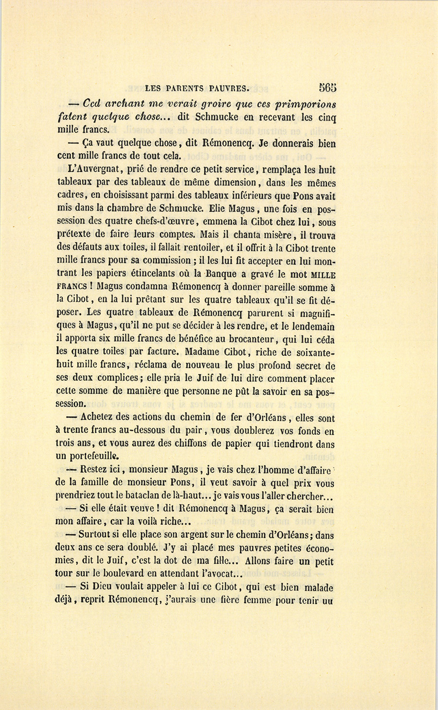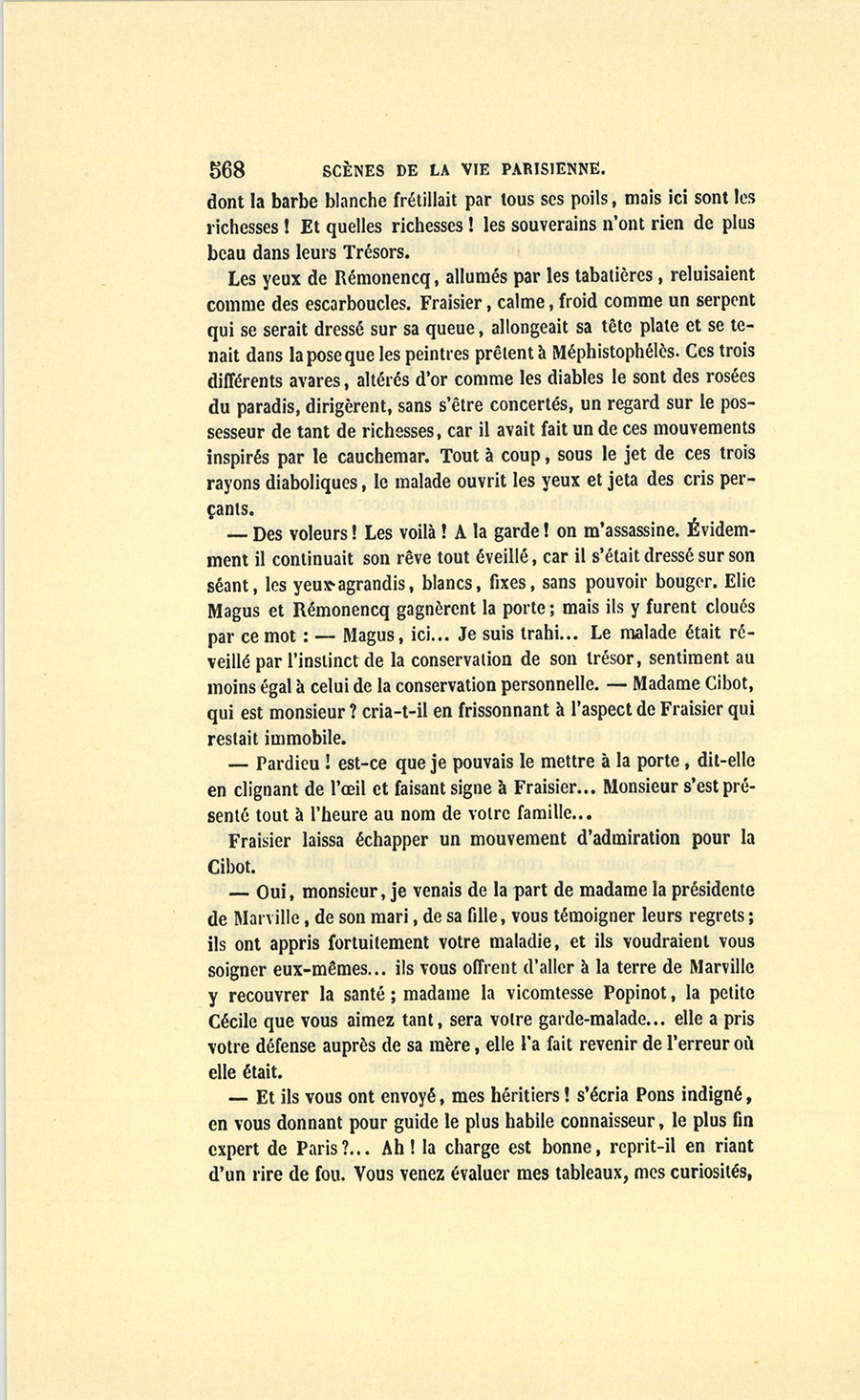 – Oh ! milord, dit modestement le comte Popinot, en fait de tableaux, personne, je ne dirai pas à Paris, mais en Europe, ne peut se flatter de rivaliser avec un inconnu, un Juif nommé Élie Magus, vieillard maniaque, le chef des tableaumanes. Il a réuni cent et quelques tableaux qui sont à décourager les amateurs d’entreprendre des collections. La France devrait sacrifier sept à huit millions et acquérir cette galerie à la mort de ce richard… Quant aux curiosités, ma collection est assez belle pour qu’on en parle…