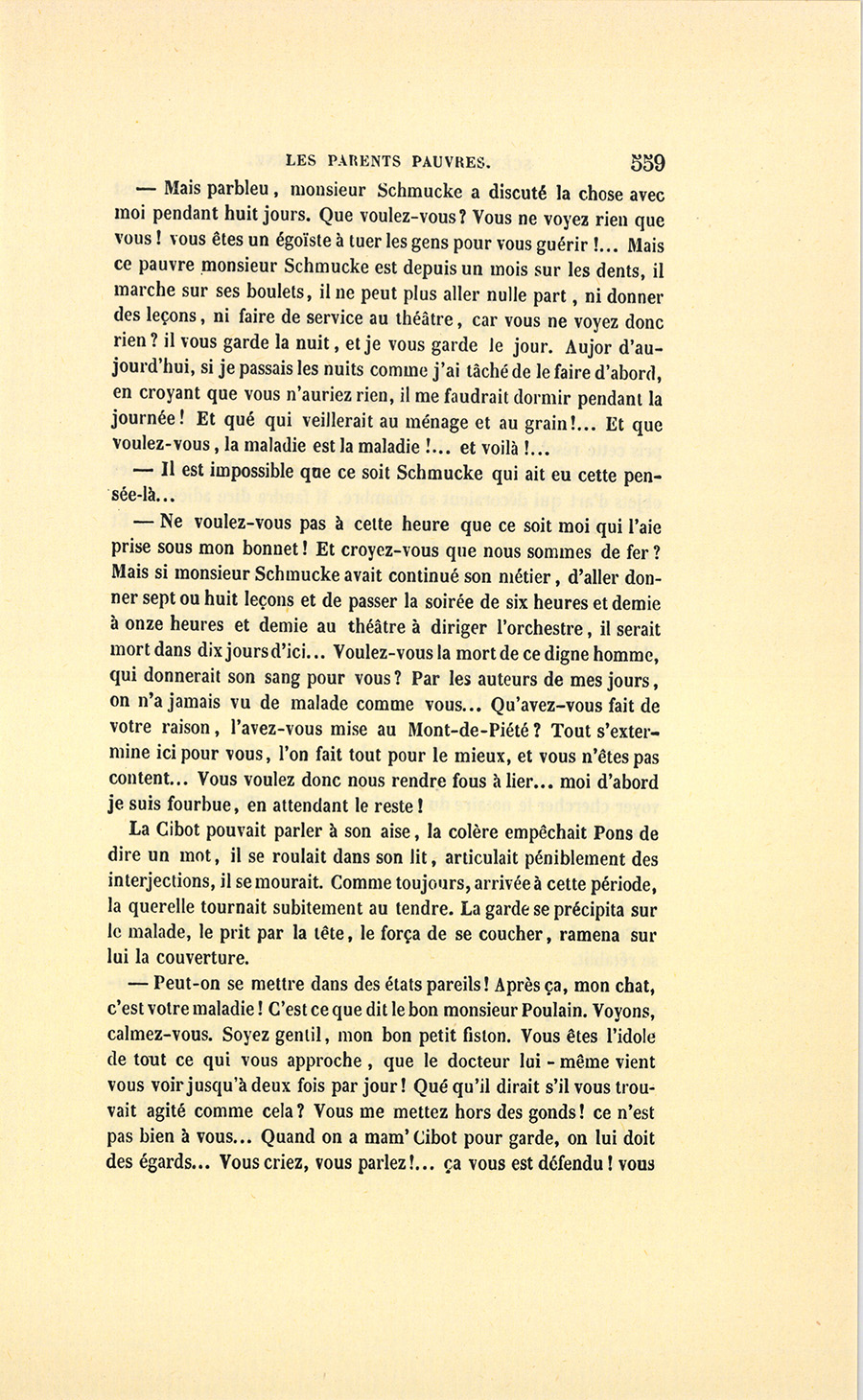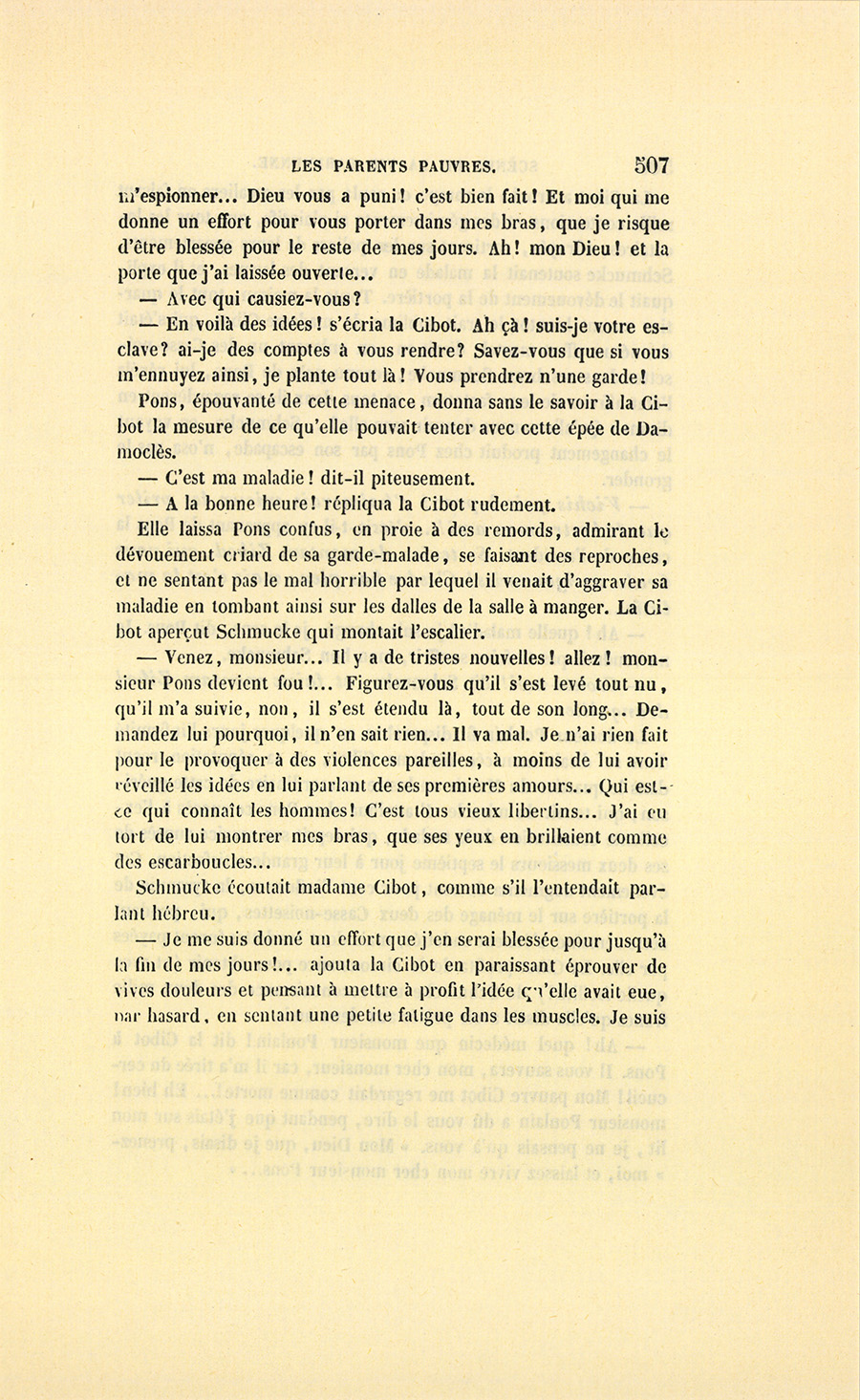 Pons, qui portait toujours, au petit doigt de la main droite, une bague à diamant tolérée sous l’Empire, et devenue ridicule aujourd’hui, Pons, beaucoup trop troubadour et trop Français, n’offrait pas dans sa physionomie la sérénité divine qui tempérait l’effroyable laideur de Schmucke. L’Allemand avait reconnu dans l’expression mélancolique de la figure de son ami, les difficultés croissantes qui {p. 399} rendaient ce métier de parasite de plus en plus pénible. En effet, en octobre 1844, le nombre des maisons où dînait Pons était naturellement très-restreint. Le pauvre chef d’orchestre, réduit à parcourir le cercle de la famille, avait, comme on va le voir, beaucoup trop étendu la signification du mot famille.