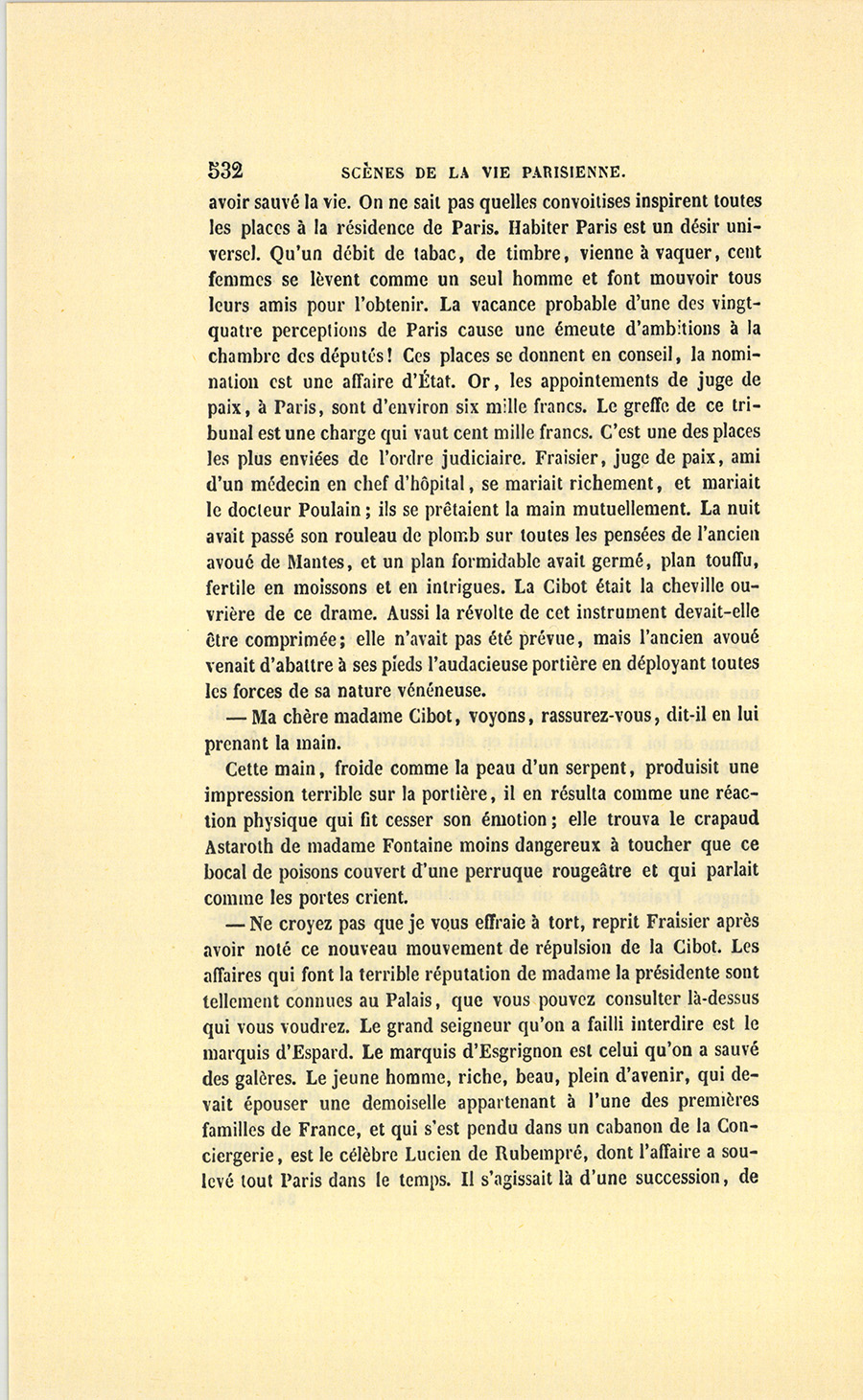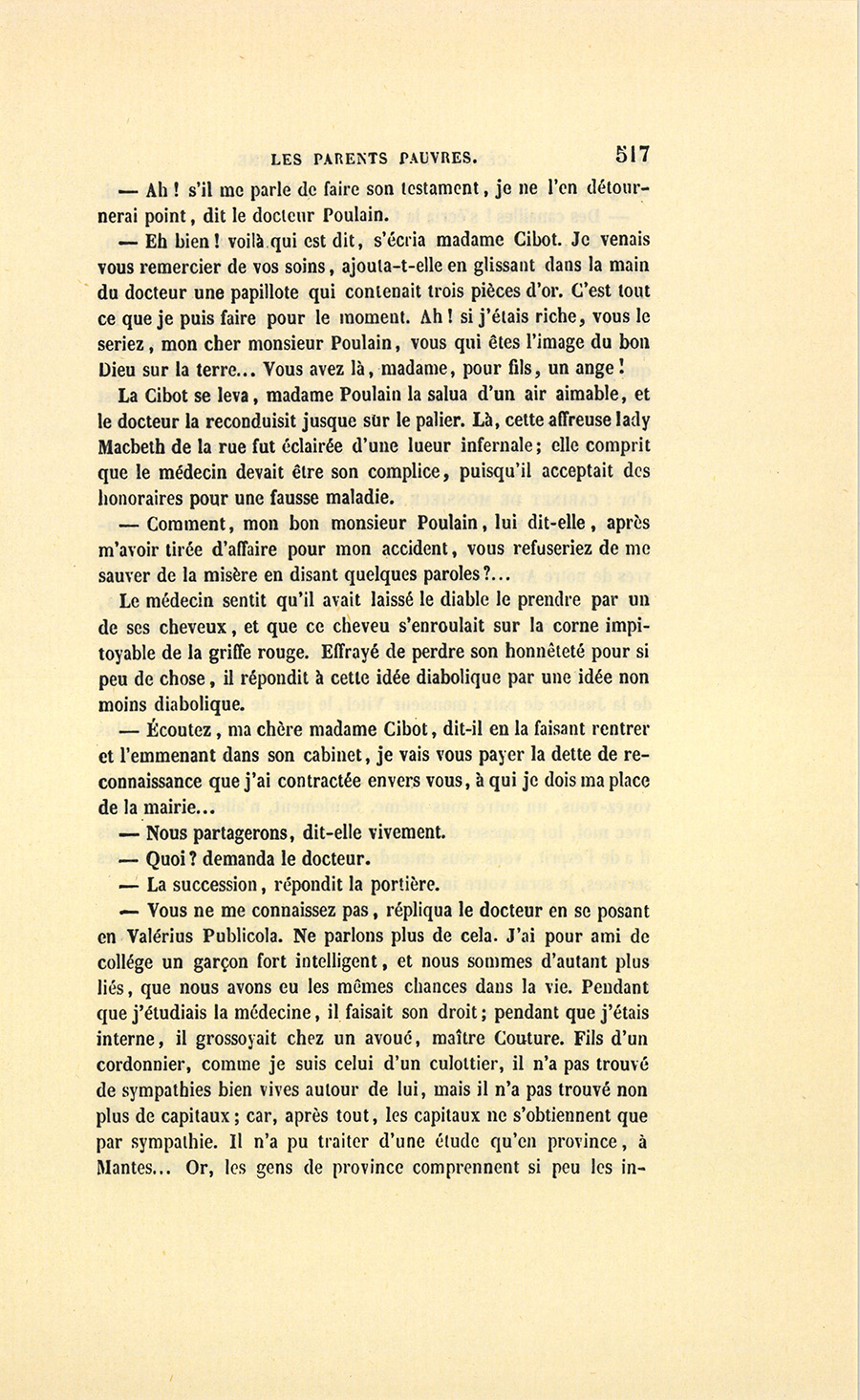 – Eh bien ! madame, je vous ai déjà débarrassée des soixante mille francs que je calculais devoir être donnés à cette ignoble portière, cette madame Cibot. Mais je tiens toujours à avoir le débit de tabac pour la femme Sauvage, et la nomination de mon ami Poulain à la place vacante de médecin en chef des Quinze-Vingts.