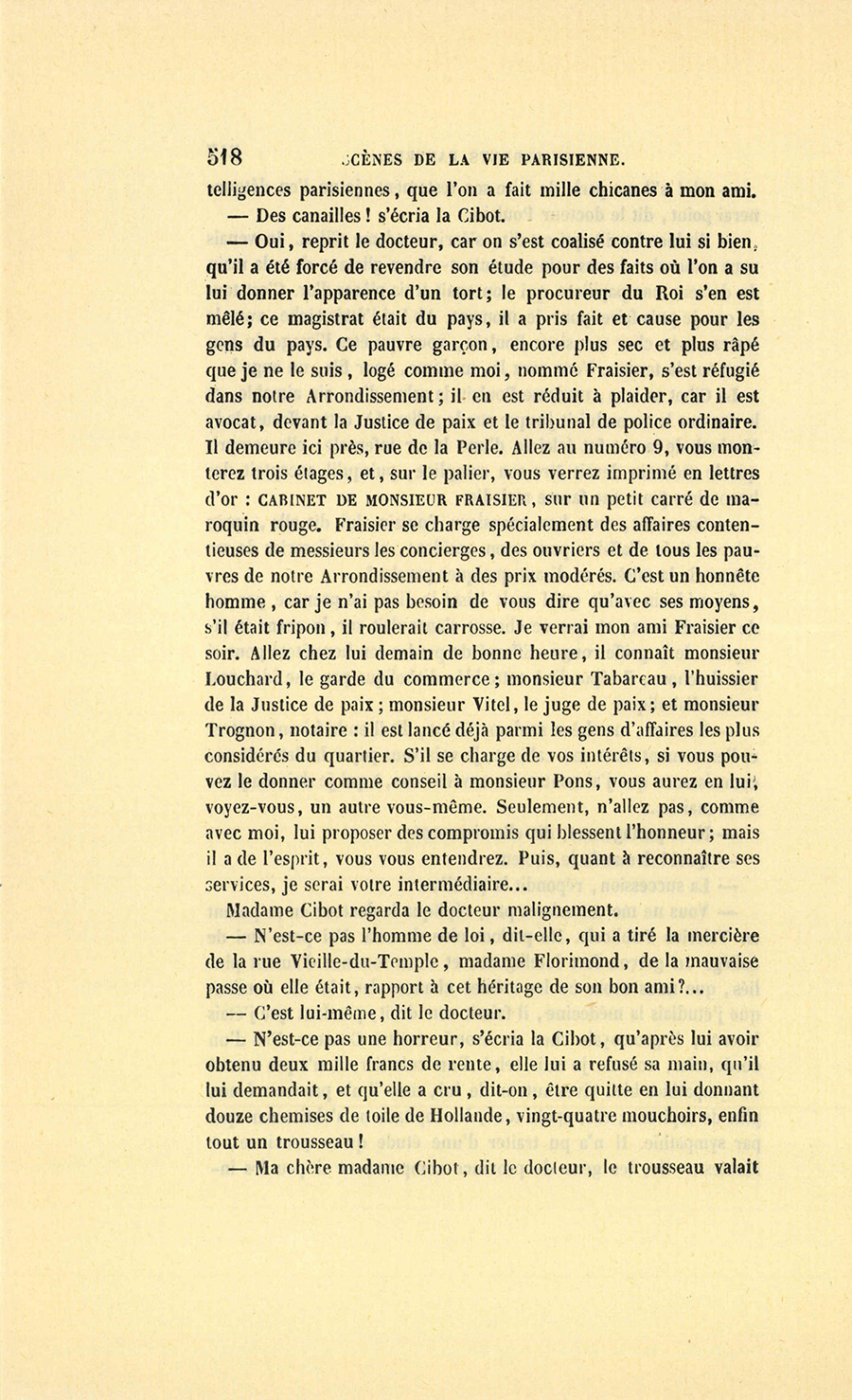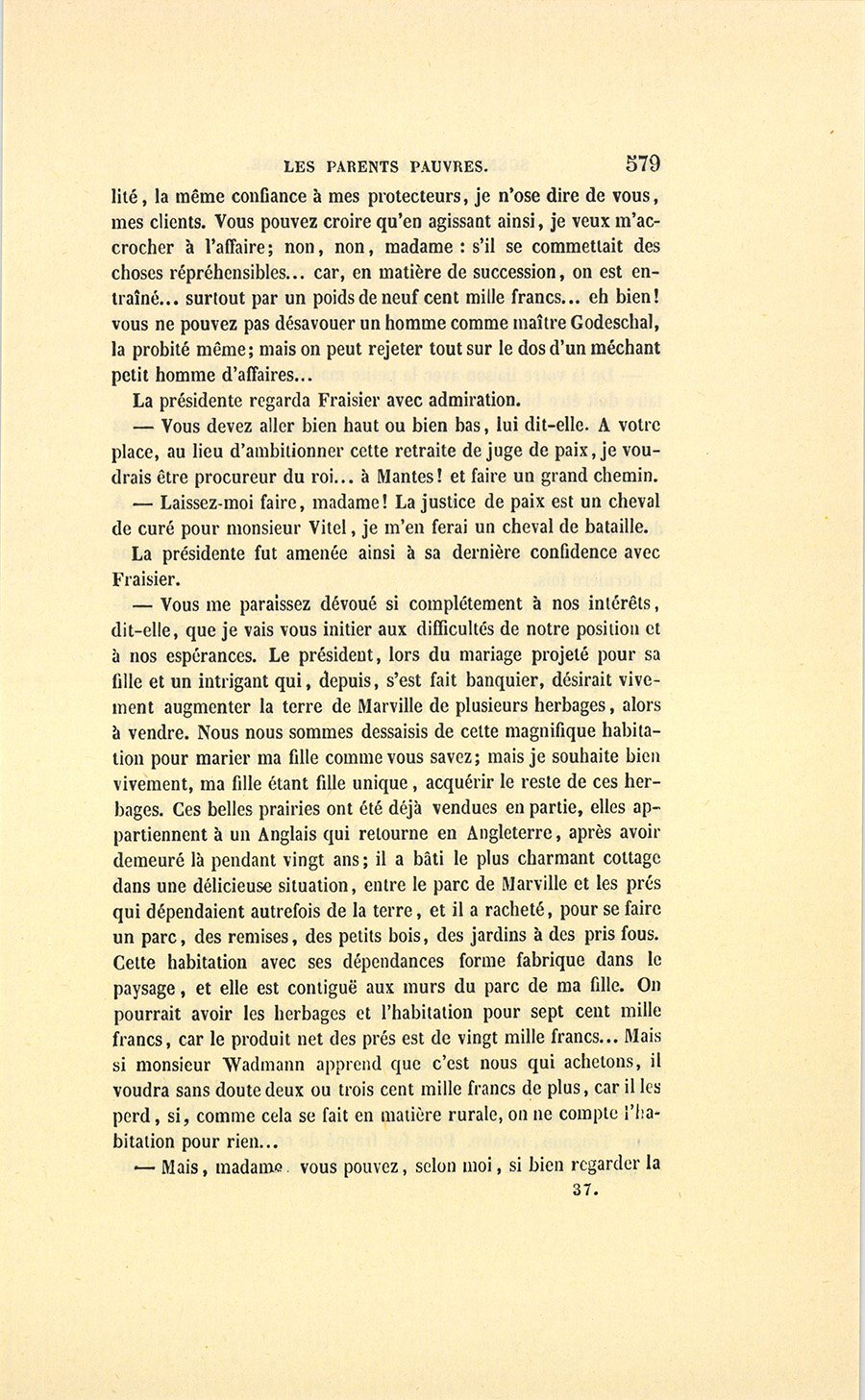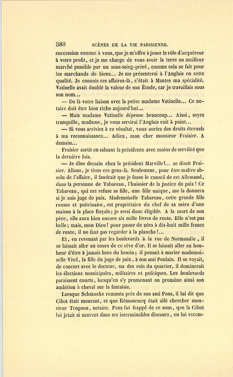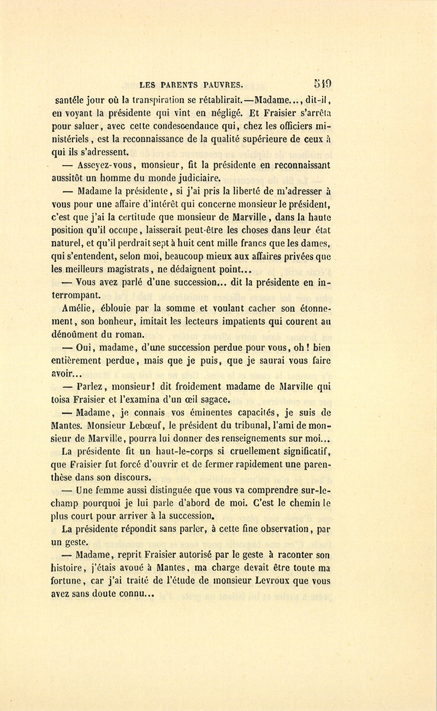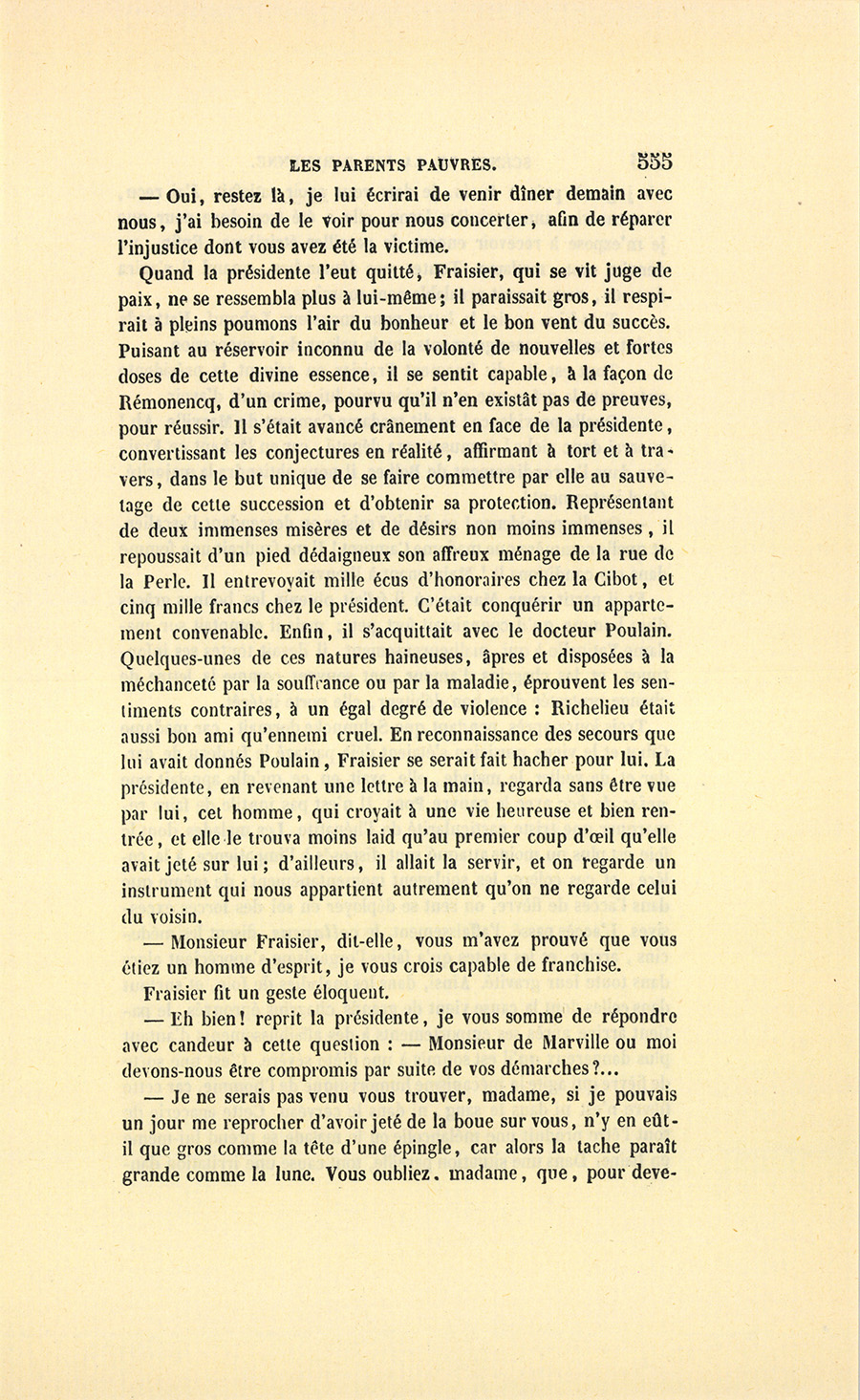 Fraisier, nommé juge de paix, est très-intime dans la maison du président, et très-apprécié par la présidente, qui n’a pas voulu lui voir épouser la fille à Tabareau ; elle promet infiniment mieux que cela à l’habile homme à qui, selon elle, elle doit non-seulement l’acquisition des prairies de Marville et le cottage, mais encore l’élection de monsieur le président, nommé député à la réélection générale de 1846.