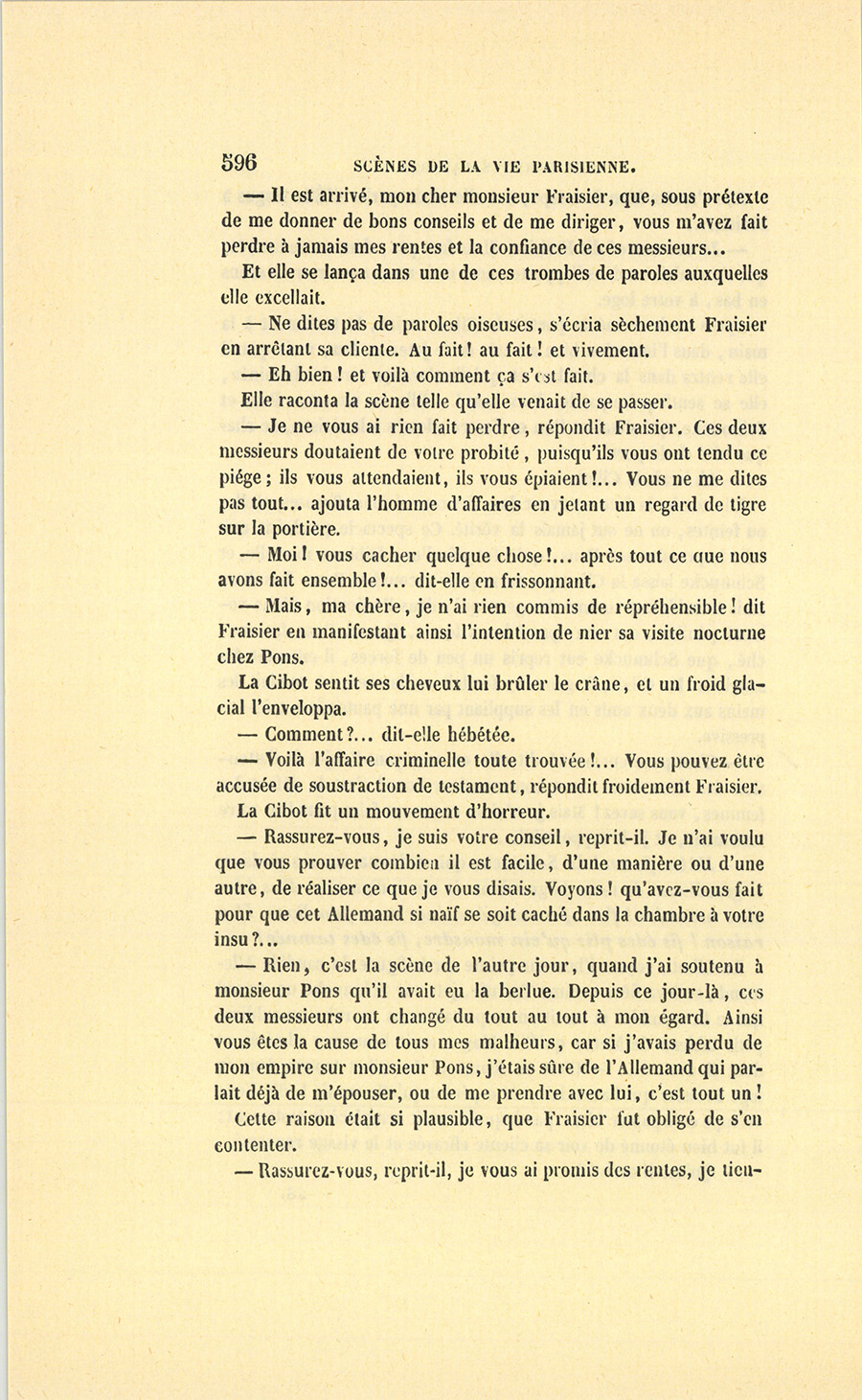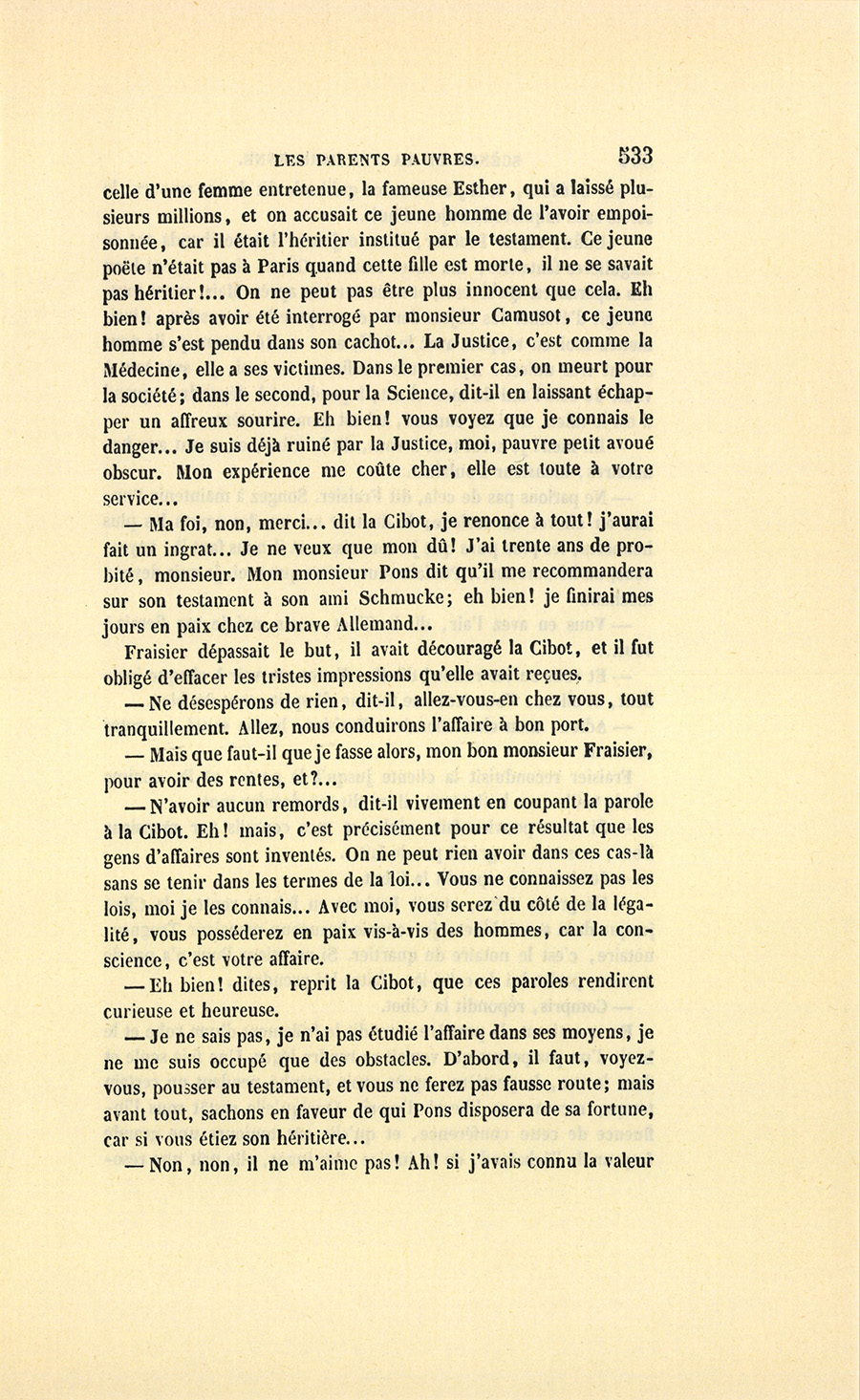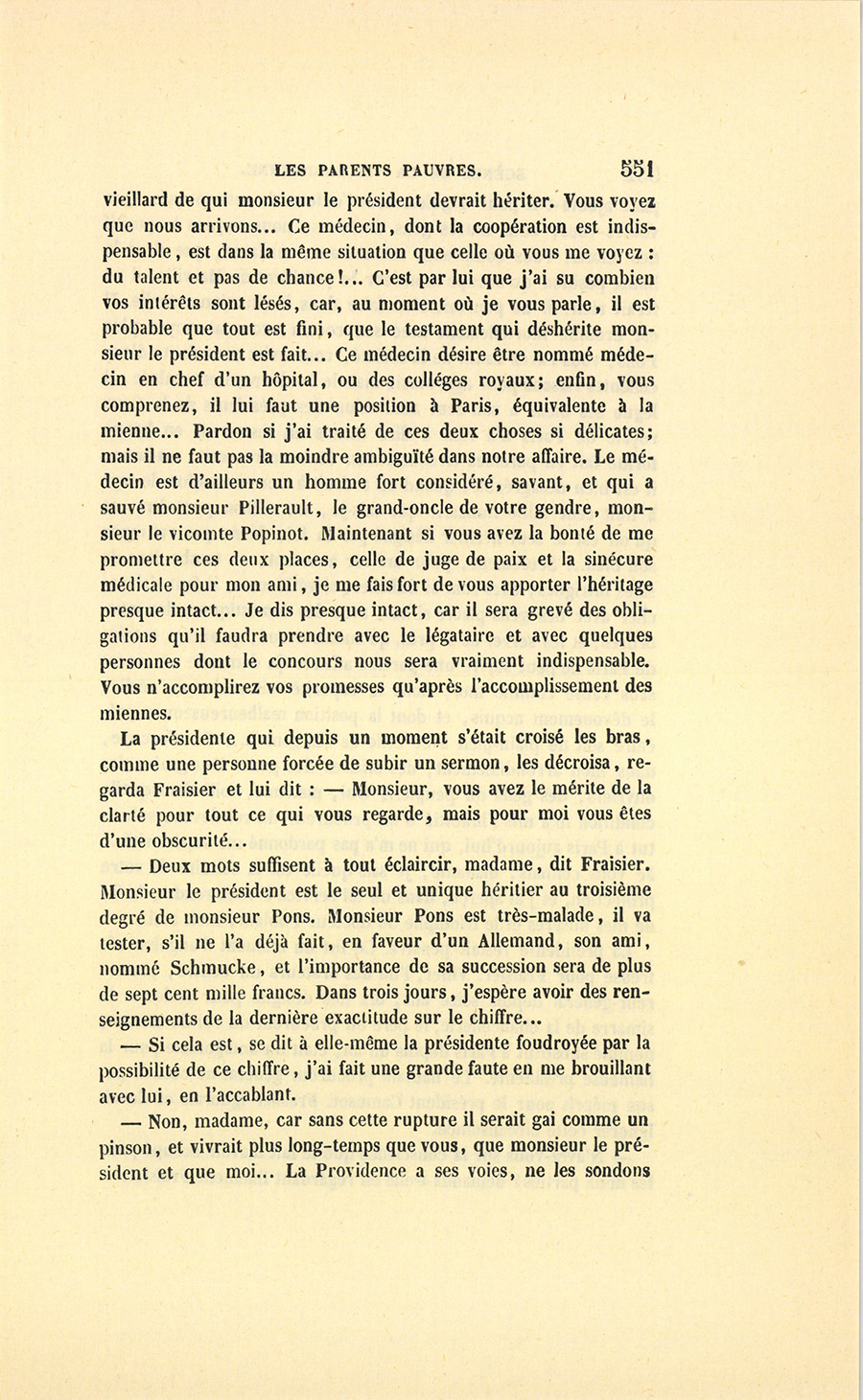 {p. 645} Tous les gens cupides comprendront, autant que les gens honnêtes l’exécreront, la joie de la présidente à qui, vingt minutes après le départ de Fraisier, Gaudissard vint apprendre sa conversation avec le pauvre Schmucke. La présidente approuva tout, elle sut un gré infini au directeur du théâtre de lui enlever tous ses scrupules par des observations qu’elle trouva pleines de justesse.