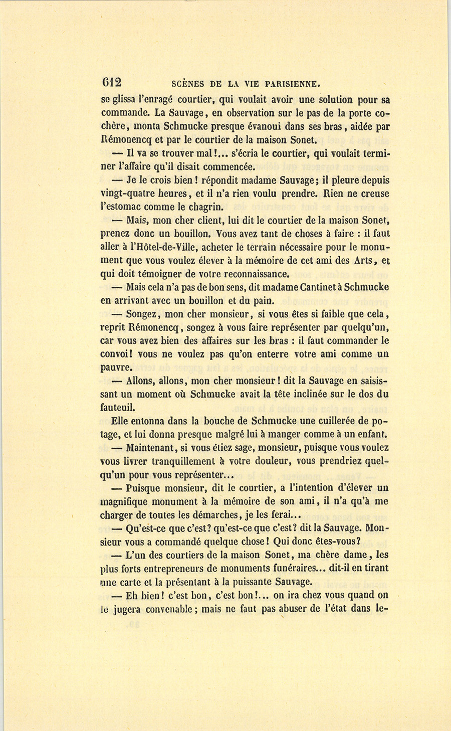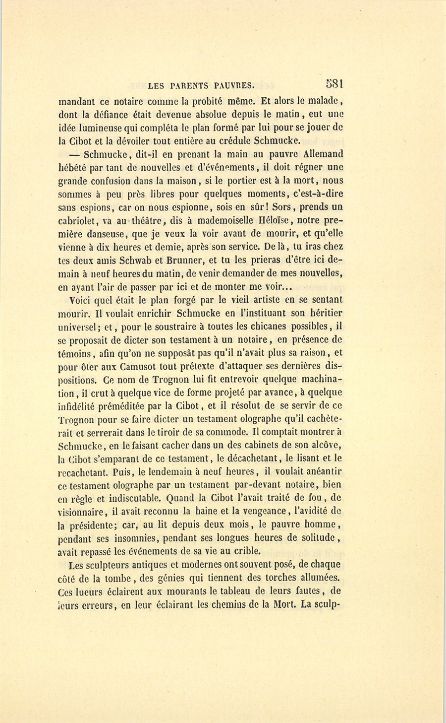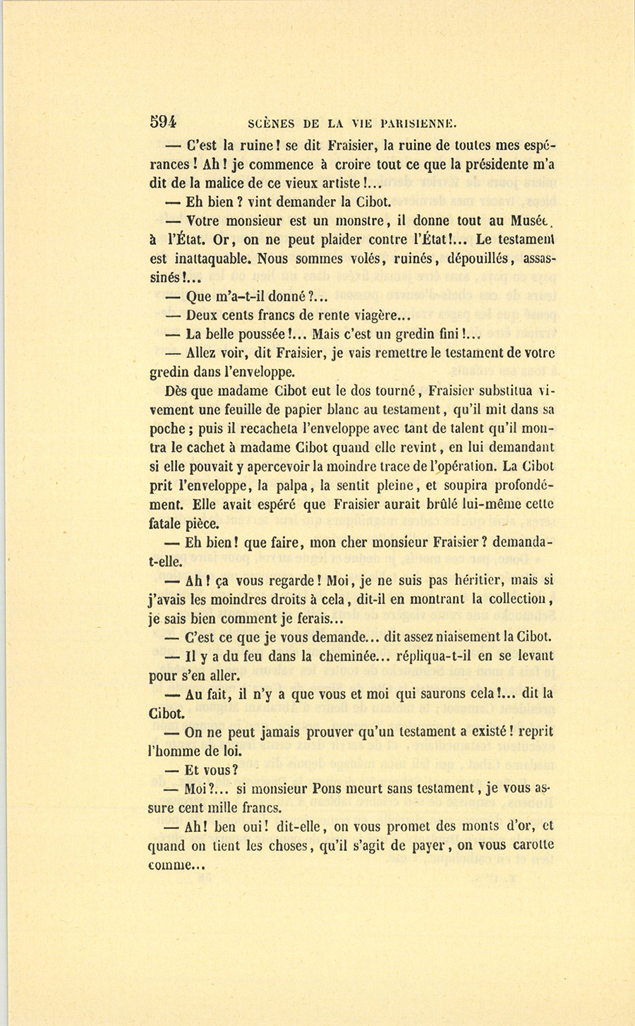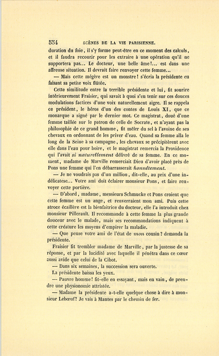 {p. 645} Tous les gens cupides comprendront, autant que les gens honnêtes l’exécreront, la joie de la présidente à qui, vingt minutes après le départ de Fraisier, Gaudissard vint apprendre sa conversation avec le pauvre Schmucke. La présidente approuva tout, elle sut un gré infini au directeur du théâtre de lui enlever tous ses scrupules par des observations qu’elle trouva pleines de justesse.