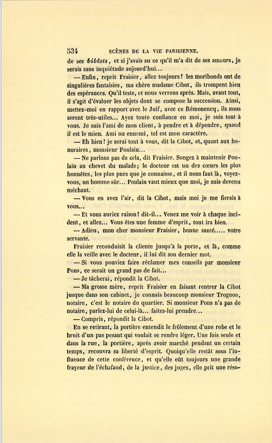 – Eh bien ! mon bon et brave homme, venez à quatre heures, ce soir, chez monsieur Berthier, notaire, tout sera prêt, et vous serez à l’abri du besoin pour le reste de vos jours… Vous toucherez vos six mille francs, et vous serez aux mêmes appointements, avec Garangeot, ce que vous faisiez avec Pons.