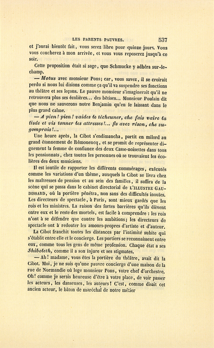 Ordinairement Pons se rendait à l’orchestre de son théâtre vers huit heures, heure à laquelle se donnent les pièces en faveur, et dont les ouvertures et les accompagnements exigeaient la tyrannie du bâton. Cette tolérance existe dans la plupart des petits théâtres ; mais Pons était à cet égard d’autant plus à l’aise, qu’il mettait dans ses rapports avec l’administration un grand désintéressement. Schmucke suppléait d’ailleurs Pons au besoin. Avec le temps, la position de Schmucke à l’orchestre s’était consolidée. L’illustre Gaudissard avait reconnu, sans en rien dire, et la valeur et l’utilité du collaborateur de Pons. On avait été obligé d’introduire à l’orchestre un piano comme aux grands théâtres. Le piano, touché gratis par Schmucke, fut établi auprès du pupitre du chef d’orchestre, où se plaçait le surnuméraire volontaire. Quand on connut ce bon Allemand, sans ambition ni prétention, il fut accepté par tous les musiciens. L’administration, pour un modique traitement, chargea Schmucke des instruments qui ne sont pas représentés dans l’orchestre des théâtres du Boulevard, et qui sont souvent nécessaires, comme le piano, la viole d’amour, le cor anglais, le violoncelle, la harpe, les castagnettes de la cachucha, les sonnettes et les inventions de Sax, etc. Les Allemands, s’ils ne savent pas jouer des grands instruments de la Liberté, savent jouer naturellement de tous les instruments de musique.