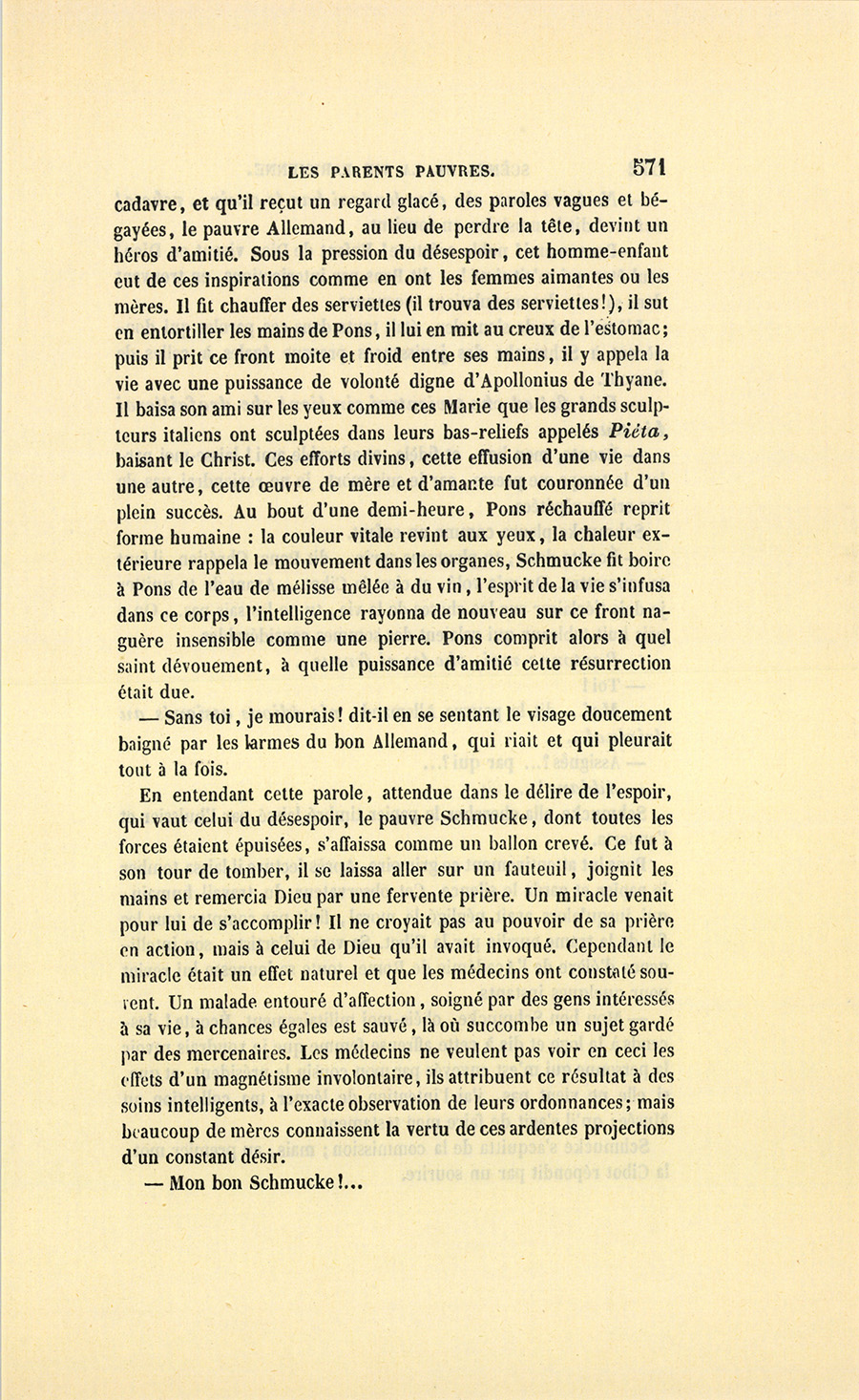 Et cet imprudent ami donna l’assignation envoyée à Schmucke, cité Bordin. Schmucke prit le papier, le lut, et en se voyant traité comme il l’était, ne comprenant rien aux gentillesses de la procédure, il reçut un coup mortel. Ce gravier lui boucha le cœur. Topinard reçut Schmucke dans ses bras ; ils étaient alors tous deux sous la porte cochère du notaire. Une voiture vint à passer, Topinard y fit entrer le pauvre Allemand, qui subissait les douleurs d’une congestion séreuse au cerveau. La vue était troublée ; mais le musicien eut encore la force de tendre l’argent à Topinard. Schmucke ne succomba point à cette première attaque, mais il ne recouvra point la raison ; il ne faisait que des mouvements sans conscience ; il ne mangea point ; il mourut en dix jours sans se plaindre, car il ne parla plus. Il fut soigné par madame Topinard, et fut obscurément enterré côte à côte avec Pons, par les soins de Topinard, la seule personne qui suivit le convoi de ce fils de l’Allemagne.