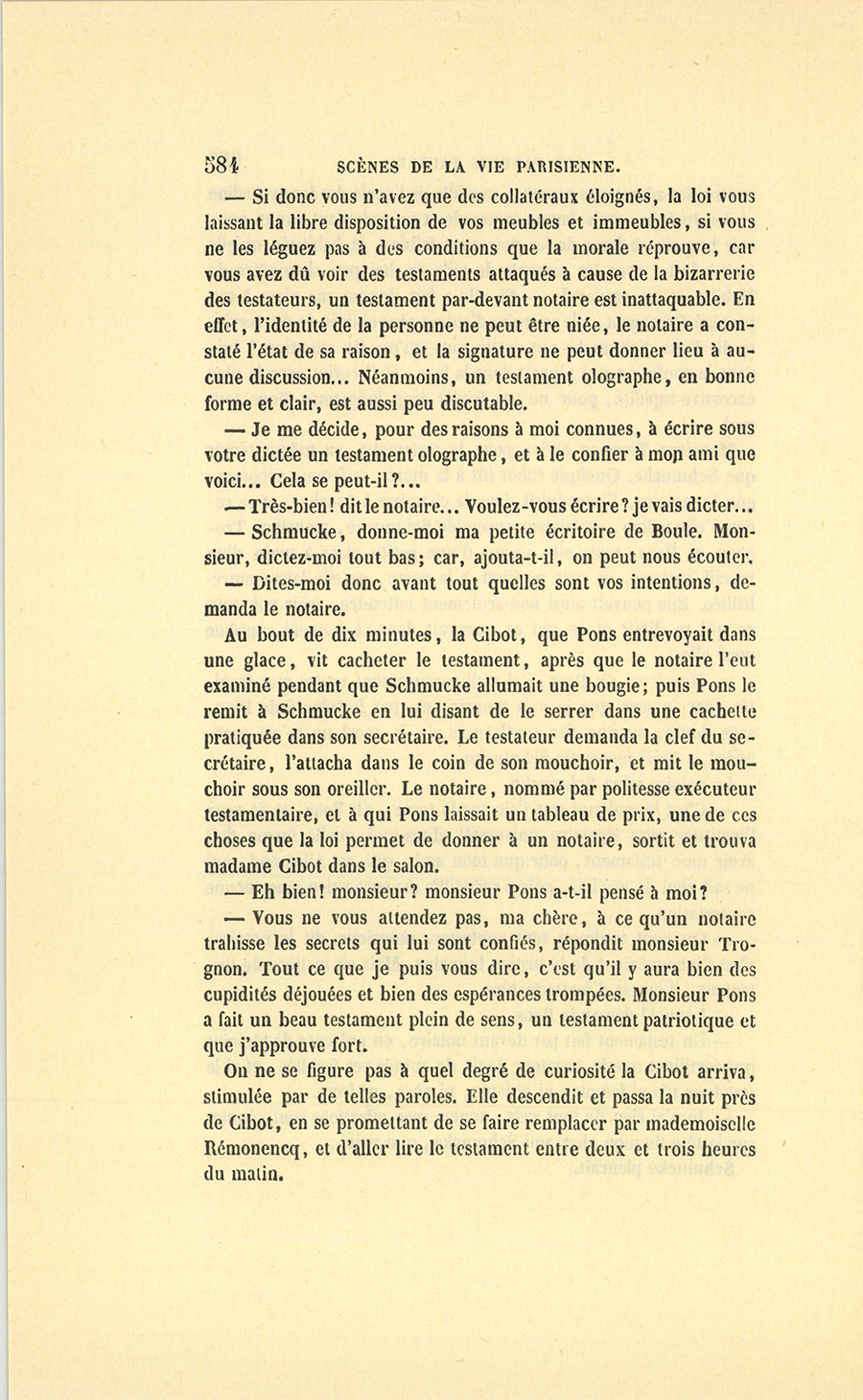 Attendu qu’il a été déposé entre les mains de monsieur le président du tribunal de première instance, un testament reçu par maître Léopold Hannequin et Alexandre Crottat, notaires à Paris, accompagnés de deux témoins, les sieurs Brunner et Schwab, étrangers domiciliés à Paris, par lequel testament le sieur Pons, décédé, a disposé de sa fortune au préjudice du requérant, son héritier naturel et légal, au profit d’un sieur Schmucke, Allemand ;