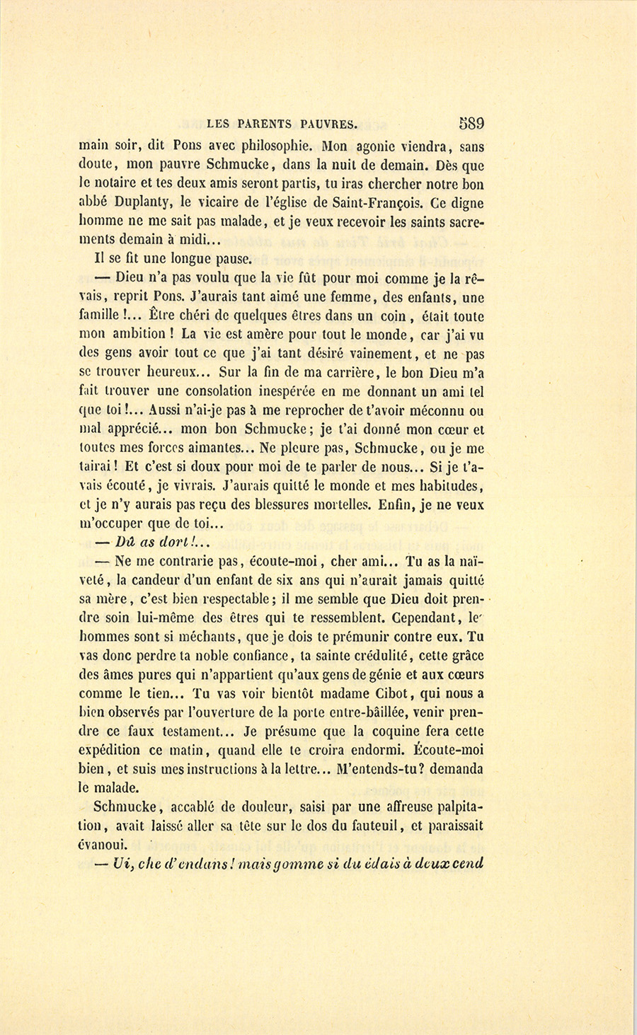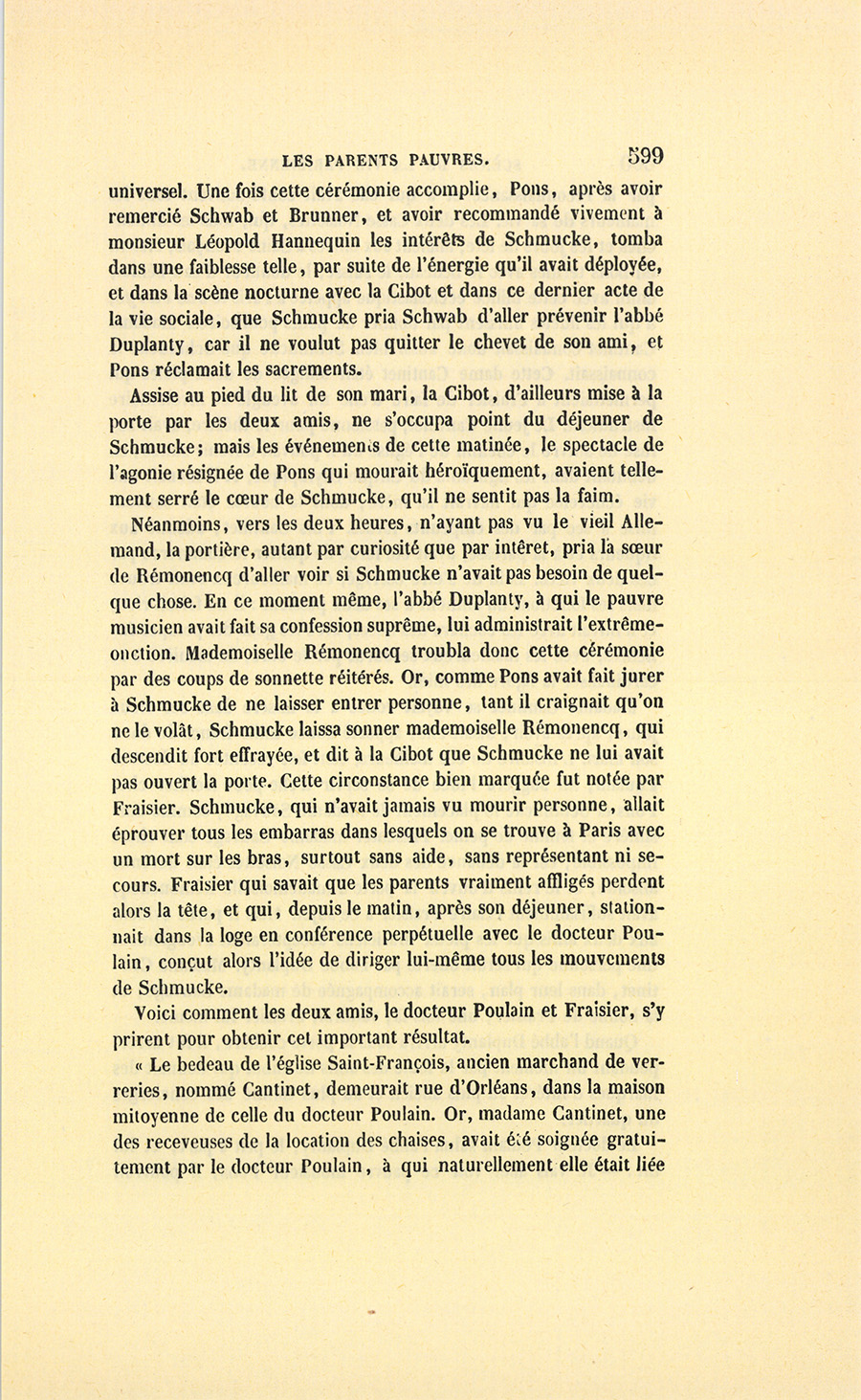 L’ami de Pons était un professeur de piano, dont la vie et les mœurs sympathisaient si bien avec les siennes, qu’il disait l’avoir connu trop tard pour son bonheur ; car leur connaissance, ébauchée à une distribution de prix, dans un pensionnat, ne datait que de 1834. Jamais peut-être deux âmes ne se trouvèrent si pareilles dans l’océan humain qui prit sa source au paradis terrestre contre la volonté de Dieu. Ces deux musiciens devinrent en peu de temps l’un pour l’autre une nécessité. Réciproquement confidents l’un de l’autre, ils furent en huit jours comme deux frères. Enfin Schmucke ne croyait pas plus qu’il pût exister un Pons, que Pons ne se doutait qu’il existât un Schmucke. Déjà, ceci suffirait à peindre ces deux braves gens, mais toutes les intelligences ne goûtent pas les brièvetés de la synthèse. Une légère démonstration est nécessaire pour les incrédules.