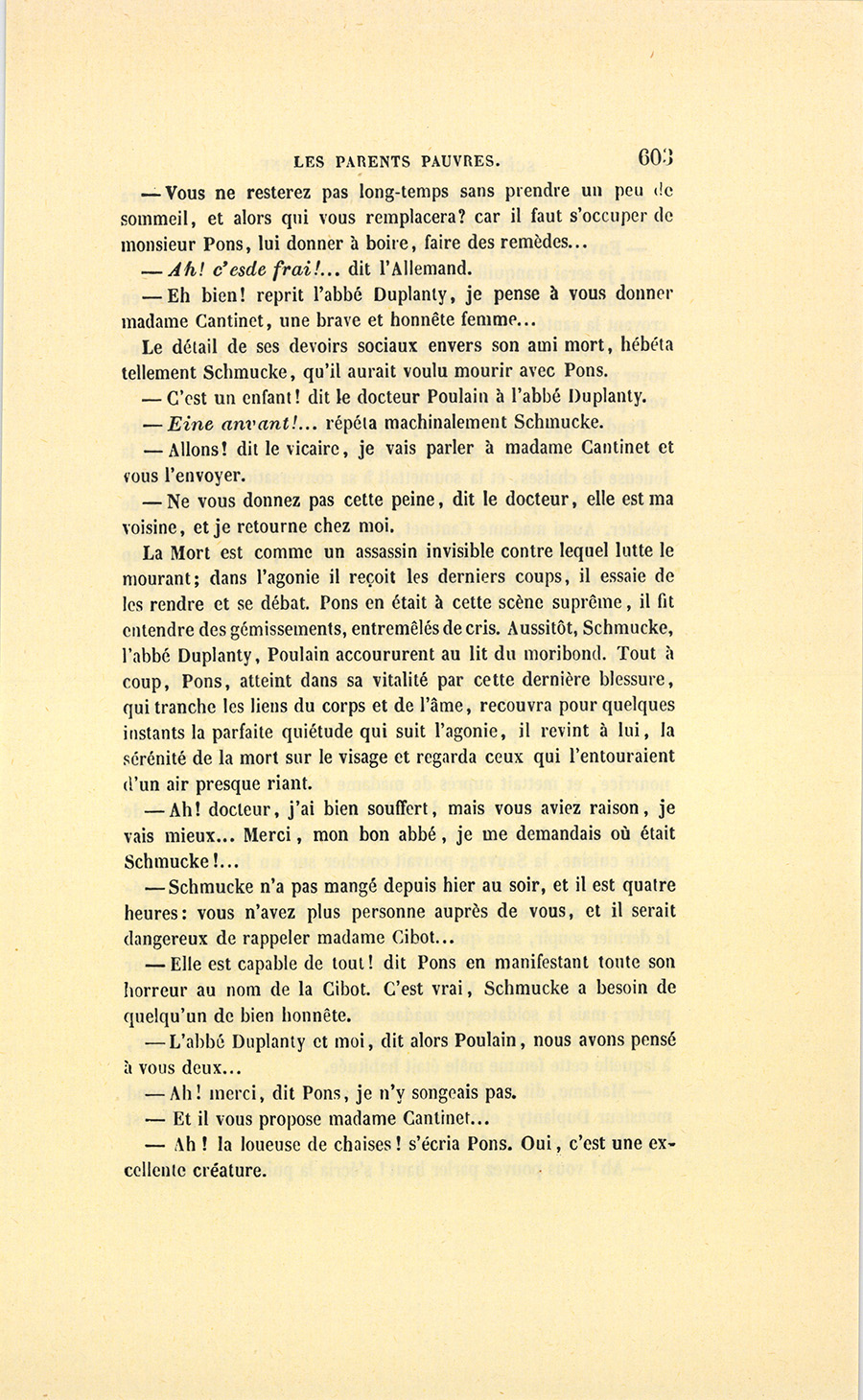 – Non ! dit Schmucke, che ne fifrai boind !… che n’ai blis le cueir à rien… che me sens addaqué…