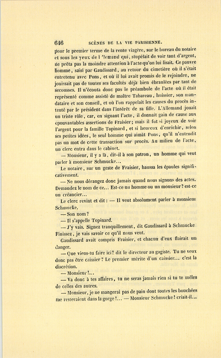 À quatre heures, se trouvaient réunis dans le cabinet de monsieur Berthier, notaire, d’abord Fraisier, rédacteur de la transaction, puis Tabareau, mandataire de Schmucke, et Schmucke lui-même, amené par Gaudissard. Fraisier avait eu soin de placer en billets de banque les six mille francs demandés, et six cents francs {p. 646} pour le premier terme de la rente viagère, sur le bureau du notaire et sous les yeux de l’Allemand qui, stupéfait de voir tant d’argent, ne prêta pas la moindre attention à l’acte qu’on lui lisait. Ce pauvre homme, saisi par Gaudissard, au retour du cimetière où il s’était entretenu avec Pons, et où il lui avait promis de le rejoindre, ne jouissait pas de toutes ses facultés déjà bien ébranlées par tant de secousses. Il n’écouta donc pas le préambule de l’acte où il était représenté comme assisté de maître Tabareau, huissier, son mandataire et son conseil, et où l’on rappelait les causes du procès intenté par le président dans l’intérêt de sa fille. L’Allemand jouait un triste rôle, car, en signant l’acte, il donnait gain de cause aux épouvantables assertions de Fraisier ; mais il fut si joyeux de voir l’argent pour la famille Topinard, et si heureux d’enrichir, selon ses petites idées, le seul homme qui aimât Pons, qu’il n’entendit pas un mot de cette transaction sur procès. Au milieu de l’acte, un clerc entra dans le cabinet.