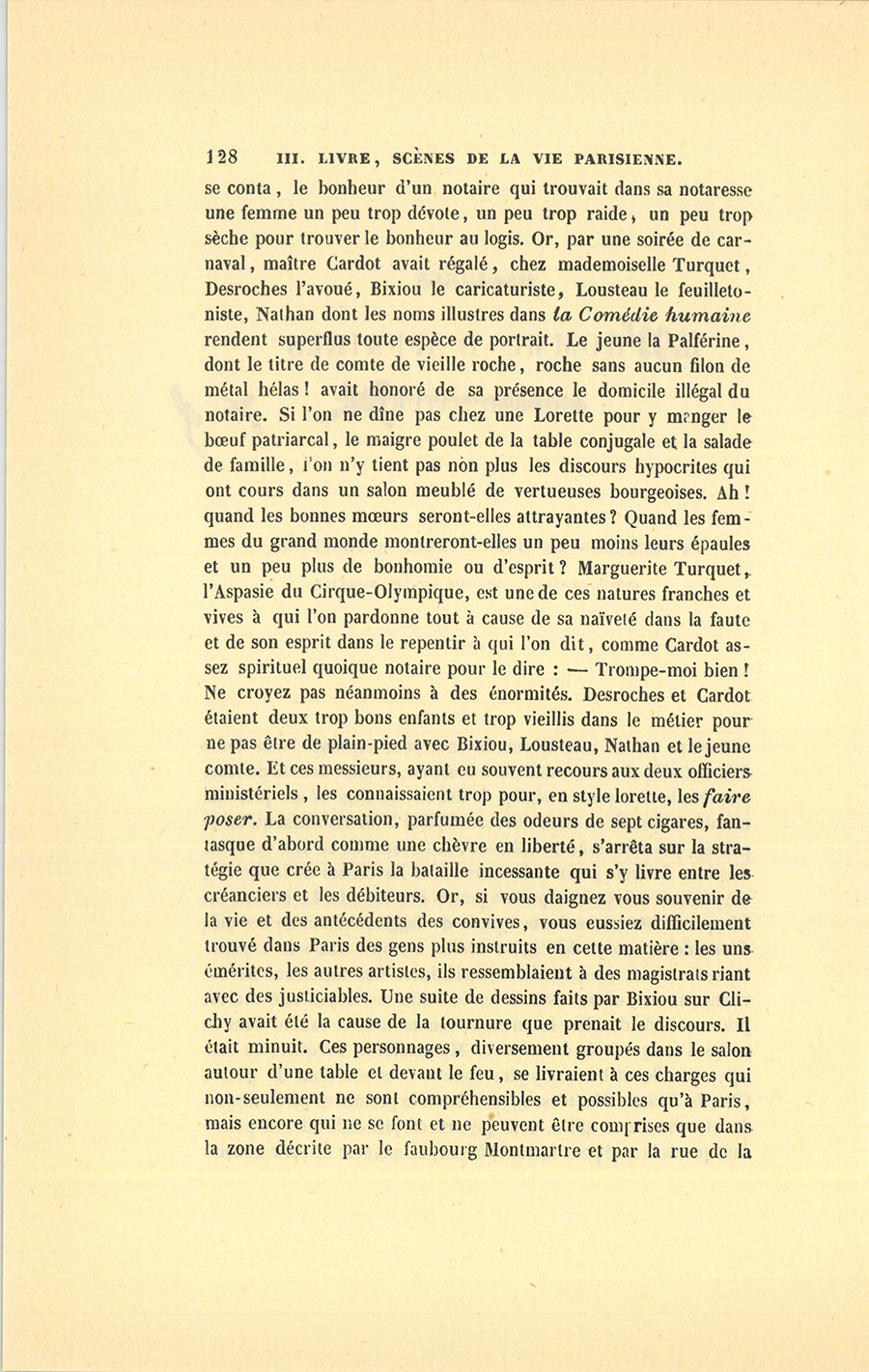 Lorette est un mot décent inventé pour exprimer l’état d’une fille ou la fille d’un état difficile à nommer, et que, dans sa pudeur, l’Académie Française a négligé de définir, vu l’âge de ses quarante membres. Quand un nom nouveau répond à un cas social qu’on ne pouvait pas dire sans périphrases, la fortune de ce mot est faite. Aussi la Lorette passa-t-elle dans toutes les classes de la société, même dans celles où ne passera jamais une Lorette. Le mot ne fut fait qu’en 1840, sans doute à cause de l’agglomération de ces nids d’hirondelles autour de l’église dédiée à Notre-Dame-de-Lorette. Ceci n’est écrit que pour les étymologistes. Ces messieurs ne seraient pas tant embarrassés si les écrivains du Moyen-Âge avaient pris le soin de détailler les mœurs, comme nous le faisons dans ce temps d’analyse et de description. Mademoiselle Turquet, ou Malaga, car elle est beaucoup plus connue sous son nom de guerre (Voir la Fausse Maîtresse), est l’une des premières paroissiennes de cette charmante église. Cette joyeuse et spirituelle fille, ne possédant que sa beauté pour fortune, faisait, au moment où cette histoire {p. 128} se conta, le bonheur d’un notaire qui trouvait dans sa notaresse une femme un peu trop dévote, un peu trop raide, un peu trop sèche pour trouver le bonheur au logis. Or, par une soirée de carnaval, maître Cardot avait régalé, chez mademoiselle Turquet, Desroches l’avoué, Bixiou le caricaturiste, Lousteau le feuilletoniste, Nathan dont les noms illustres dans la Comédie humaine rendent superflue1 toute espèce de portrait. Le jeune la Palférine, dont le titre de comte de vieille roche, roche sans aucun filon de métal hélas ! avait honoré de sa présence le domicile illégal du notaire. Si l’on ne dîne pas chez une Lorette pour y manger le bœuf patriarcal, le maigre poulet de la table conjugale et la salade de famille, l’on n’y tient pas non plus les discours hypocrites qui ont cours dans un salon meublé de vertueuses bourgeoises. Ah ! quand les bonnes mœurs seront-elles attrayantes ? Quand les femmes du grand monde montreront-elles un peu moins leurs épaules et un peu plus de bonhomie ou d’esprit ? Marguerite Turquet, l’Aspasie du Cirque-Olympique, est une de ces natures franches et vives à qui l’on pardonne tout à cause de sa naïveté dans la faute et de son esprit dans le repentir à qui l’on dit, comme Cardot assez spirituel quoique notaire pour le dire : – Trompe-moi bien ! Ne croyez pas néanmoins à des énormités. Desroches et Cardot étaient deux trop bons enfants et trop vieillis dans le métier pour ne pas être de plain-pied avec Bixiou, Lousteau, Nathan et le jeune comte. Et ces messieurs, ayant eu souvent recours aux deux officiers ministériels, les connaissaient trop pour, en style lorette, les faire poser. La conversation, parfumée des odeurs de sept cigares, fantasque d’abord comme une chèvre en liberté, s’arrêta sur la stratégie que crée à Paris la bataille incessante qui s’y livre entre les créanciers et les débiteurs. Or, si vous daignez vous souvenir de la vie et des antécédents des convives, vous eussiez difficilement trouvé dans Paris des gens plus instruits en cette matière : les uns émérites, les autres artistes, ils ressemblaient à des magistrats riant avec des justiciables. Une suite de dessins faits par Bixiou sur Clichy avait été la cause de la tournure que prenait le discours. Il était minuit. Ces personnages, diversement groupés dans le salon autour d’une table et devant le feu, se livraient à ces charges qui non-seulement ne sont compréhensibles et possibles qu’à Paris, mais encore qui ne se font et ne peuvent être comprises que dans la zone décrite par le faubourg Montmartre et par la rue de la {p. 129} Chaussée-d’Antin, entre les hauteurs de la rue de Navarin et la ligne des boulevards.