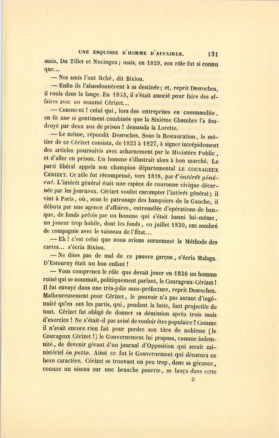 – Vous comprenez le rôle que devait jouer en 1830 un homme ruiné qui se nommait, politiquement parlant, le Courageux-Cérizet ! Il fut envoyé dans une très-jolie sous-préfecture, reprit Desroches. Malheureusement pour Cérizet, le pouvoir n’a pas autant d’ingénuité qu’en ont les partis, qui, pendant la lutte, font projectile de tout. Cérizet fut obligé de donner sa démission après trois mois d’exercice ! Ne s’était-il pas avisé de vouloir être populaire ? Comme il n’avait encore rien fait pour perdre son titre de noblesse (le Courageux Cérizet !) le Gouvernement lui proposa, comme indemnité, de devenir gérant d’un journal d’Opposition qui serait ministériel in petto. Ainsi ce fut le Gouvernement qui dénatura ce beau caractère. Cérizet se trouvant un peu trop, dans sa gérance, comme un oiseau sur une branche pourrie, se lança dans cette {p. 132} gentille commandite où le malheureux a, comme vous venez de le dire, attrapé deux ans de prison, là où de plus habiles ont attrapé le public.