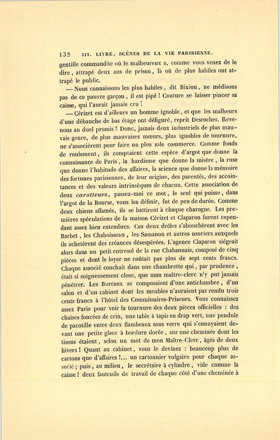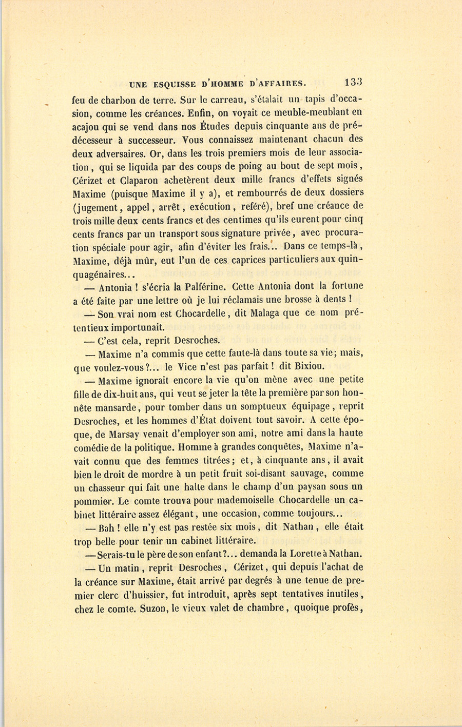 – Cérizet est d’ailleurs un homme ignoble, et que les malheurs d’une débauche de bas étage ont défiguré, reprit Desroches. Revenons au duel promis ? Donc, jamais deux industriels de plus mauvais genre, de plus mauvaises mœurs, plus ignobles de tournure, ne s’associèrent pour faire un plus sale commerce. Comme fonds de roulement, ils comptaient cette espèce d’argot que donne la connaissance de Paris, la hardiesse que donne la misère, la ruse que donne l’habitude des affaires, la science que donne la mémoire des fortunes parisiennes, de leur origine, des parentés, des accointances et des valeurs intrinsèques de chacun. Cette association de deux carotteurs, passez-moi ce mot, le seul qui puisse, dans l’argot de la Bourse, vous les définir, fut de peu de durée. Comme deux chiens affamés, ils se battirent à chaque charogne. Les premières spéculations de la maison Cérizet et Claparon furent cependant assez bien entendues. Ces deux drôles s’abouchèrent avec les Barbet, les Chaboisseau, les Samanon et autres usuriers auxquels ils achetèrent des créances désespérées. L’agence Claparon siégeait alors dans un petit entresol de la rue Chabannais, composé de cinq pièces et dont le loyer ne coûtait pas plus de sept cents francs. Chaque associé couchait dans une chambrette qui, par prudence, était si soigneusement close, que mon maître-clerc n’y put jamais pénétrer. Les Bureaux se composaient d’une antichambre, d’un salon et d’un cabinet dont les meubles n’auraient pas rendu trois cents francs à l’hôtel des Commissaires-Priseurs. Vous connaissez assez Paris pour voir la tournure des deux pièces officielles : des chaises foncées de crin, une table à tapis en drap vert, une pendule de pacotille entre deux flambeaux sous verre qui s’ennuyaient devant une petite glace à bordure dorée, sur une cheminée dont les tisons étaient, selon un mot de mon Maître-Clerc, âgés de deux hivers ! Quant au cabinet, vous le devinez : beaucoup plus de cartons que d’affaires !… un cartonnier vulgaire pour chaque associé ; puis, au milieu, le secrétaire à cylindre, vide comme la caisse ! deux fauteuils de travail de chaque côté d’une cheminée à {p. 133} feu de charbon de terre. Sur le carreau, s’étalait un tapis d’occasion, comme les créances. Enfin, on voyait ce meuble-meublant en acajou qui se vend dans nos Études depuis cinquante ans de prédécesseur à successeur. Vous connaissez maintenant chacun des deux adversaires. Or, dans les trois premiers mois de leur association, qui se liquida par des coups de poing au bout de sept mois, Cérizet et Claparon achetèrent deux mille francs d’effets signés Maxime (puisque Maxime il y a), et rembourrés de deux dossiers (jugement, appel, arrêt, exécution, référé), bref une créance de trois mille deux cents francs et des centimes qu’ils eurent pour cinq cents francs par un transport sous signature privée, avec procuration spéciale pour agir, afin d’éviter les frais… Dans ce temps-là, Maxime, déjà mûr, eut l’un de ces caprices particuliers aux quinquagénaires…