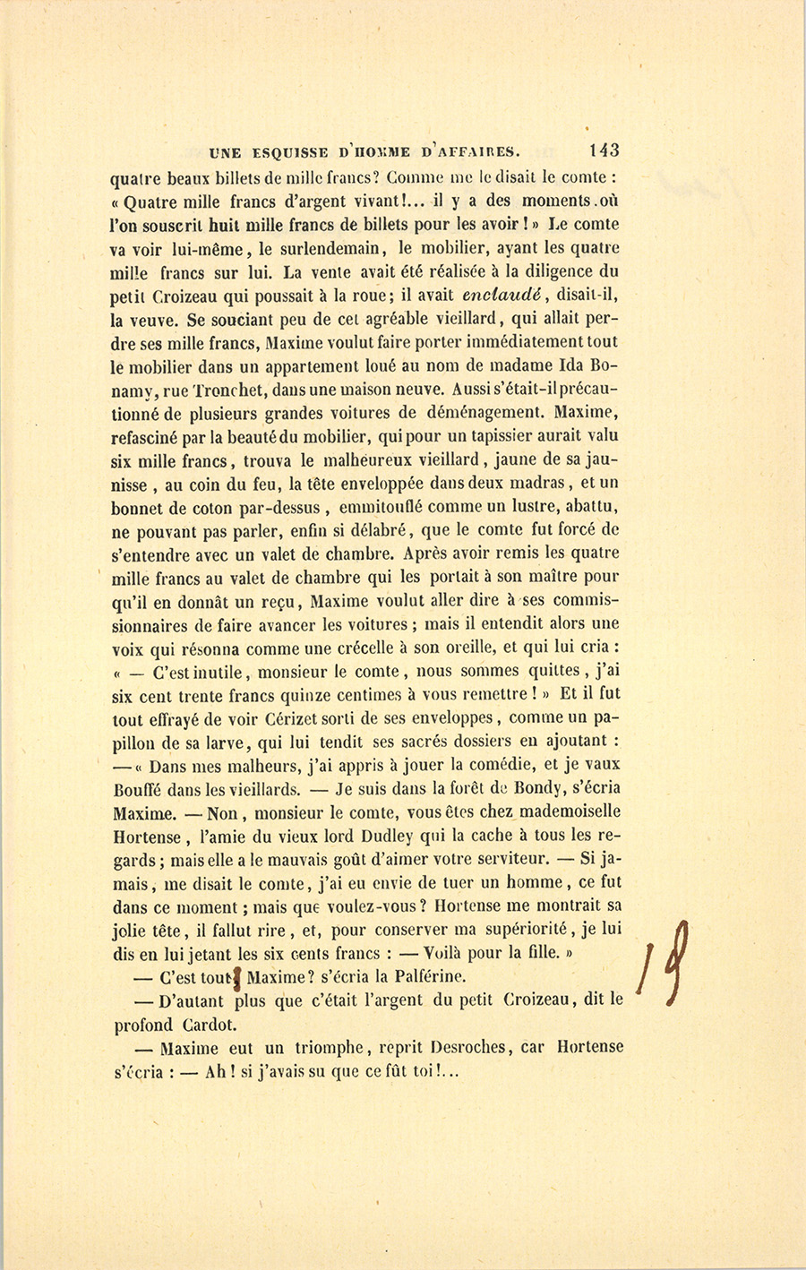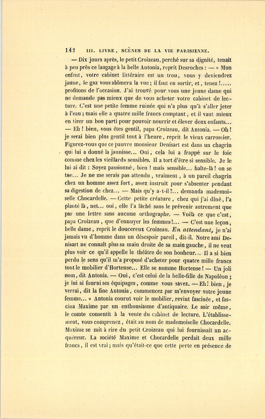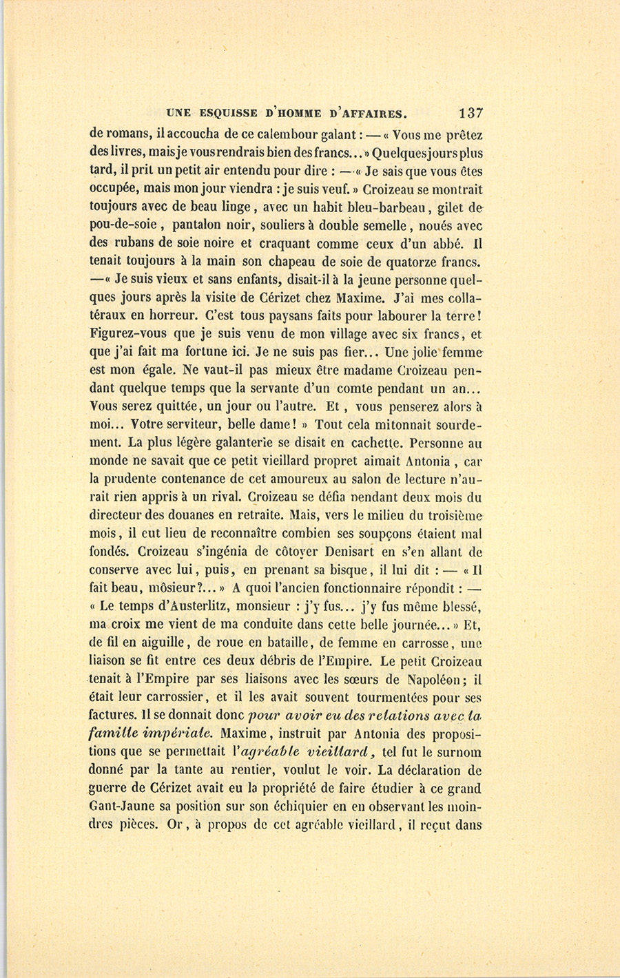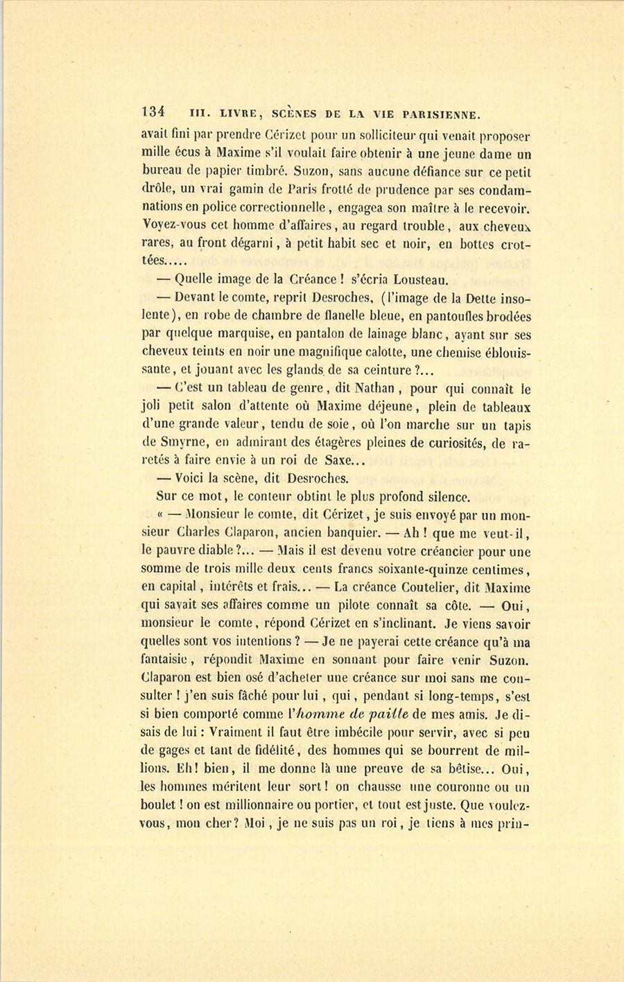 – Un matin, reprit Desroches, Cérizet, qui depuis l’achat de la créance sur Maxime, était arrivé par degrés à une tenue de premier clerc d’huissier, fut introduit, après sept tentatives inutiles, chez le comte. Suzon, le vieux valet de chambre, quoique profès, {p. 134} avait fini par prendre Cérizet pour un solliciteur qui venait proposer mille écus à Maxime s’il voulait faire obtenir à une jeune dame un bureau de papier timbré. Suzon, sans aucune défiance sur ce petit drôle, un vrai gamin de Paris frotté de prudence par ses condamnations en police correctionnelle, engagea son maître à le recevoir. Voyez-vous cet homme d’affaires, au regard trouble, aux cheveux rares, au front dégarni, à petit habit sec et noir, en bottes crottées…