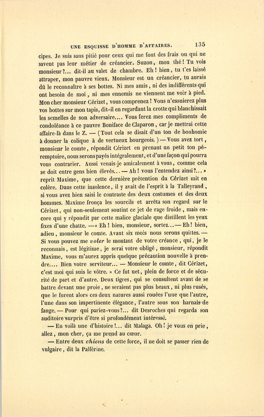 « – Monsieur le comte, dit Cérizet, je suis envoyé par un monsieur Charles Claparon, ancien banquier. – Ah ! que me veut-il, le pauvre diable ?… – Mais il est devenu votre créancier pour une somme de trois mille deux cents francs soixante-quinze centimes, en capital, intérêts et frais… – La créance Coutelier, dit Maxime qui savait ses affaires comme un pilote connaît sa côte. – Oui, monsieur le comte, répond Cérizet en s’inclinant. Je viens savoir quelles sont vos intentions ? – Je ne payerai cette créance qu’à ma fantaisie, répondit Maxime en sonnant pour faire venir Suzon. Claparon est bien osé d’acheter une créance sur moi sans me consulter ! j’en suis fâché pour lui, qui, pendant si long-temps, s’est si bien comporté comme l’homme de paille de mes amis. Je disais de lui : Vraiment il faut être imbécile pour servir, avec si peu de gages et tant de fidélité, des hommes qui se bourrent de millions. Eh ! bien, il me donne là une preuve de sa bêtise… Oui, les hommes méritent leur sort ! on chausse une couronne ou un boulet ! on est millionnaire ou portier, et tout est juste. Que voulez-vous, mon cher ? Moi, je ne suis pas un roi, je tiens à mes {p. 135} principes. Je suis sans pitié pour ceux qui me font des frais ou qui ne savent pas leur métier de créancier. Suzon, mon thé ! Tu vois monsieur ?… dit-il au valet de chambre. Eh ! bien, tu t’es laissé attraper, mon pauvre vieux. Monsieur est un créancier, tu aurais dû le reconnaître à ses bottes. Ni mes amis, ni des indifférents qui ont besoin de moi, ni mes ennemis ne viennent me voir à pied. Mon cher monsieur Cérizet, vous comprenez ! Vous n’essuierez plus vos bottes sur mon tapis, dit-il en regardant la crotte qui blanchissait les semelles de son adversaire… Vous ferez mes compliments de condoléance à ce pauvre Boniface de Claparon, car je mettrai cette affaire-là dans le Z. – (Tout cela se disait d’un ton de bonhomie à donner la colique à de vertueux bourgeois.) – Vous avez tort, monsieur le comte, répondit Cérizet en prenant un petit ton péremptoire, nous serons payés intégralement, et d’une façon qui pourra vous contrarier. Aussi venais-je amicalement à vous, comme cela se doit entre gens bien élevés… – Ah ! vous l’entendez ainsi ?… » reprit Maxime, que cette dernière prétention du Cérizet mit en colère. Dans cette insolence, il y avait de l’esprit à la Talleyrand, si vous avez bien saisi le contraste des deux costumes et des deux hommes. Maxime fronça les sourcils et arrêta son regard sur le Cérizet, qui non-seulement soutint ce jet de rage froide, mais encore qui y répondit par cette malice glaciale que distillent les yeux fixes d’une chatte. – « Eh ! bien, monsieur, sortez… – Eh ! bien, adieu, monsieur le comte. Avant six mois nous serons quittes. – Si vous pouvez me voler le montant de votre créance, qui, je le reconnais, est légitime, je serai votre obligé, monsieur, répondit Maxime, vous m’aurez appris quelque précaution nouvelle à prendre… Bien votre serviteur… – Monsieur le comte, dit Cérizet, c’est moi qui suis le vôtre. » Ce fut net, plein de force et de sécurité de part et d’autre. Deux tigres, qui se consultent avant de se battre devant une proie, ne seraient pas plus beaux, ni plus rusés, que le furent alors ces deux natures aussi rouées l’une que l’autre, l’une dans son impertinente élégance, l’autre sous son harnais de fange. – Pour qui pariez-vous ?… dit Desroches qui regarda son auditoire surpris d’être si profondément intéressé.