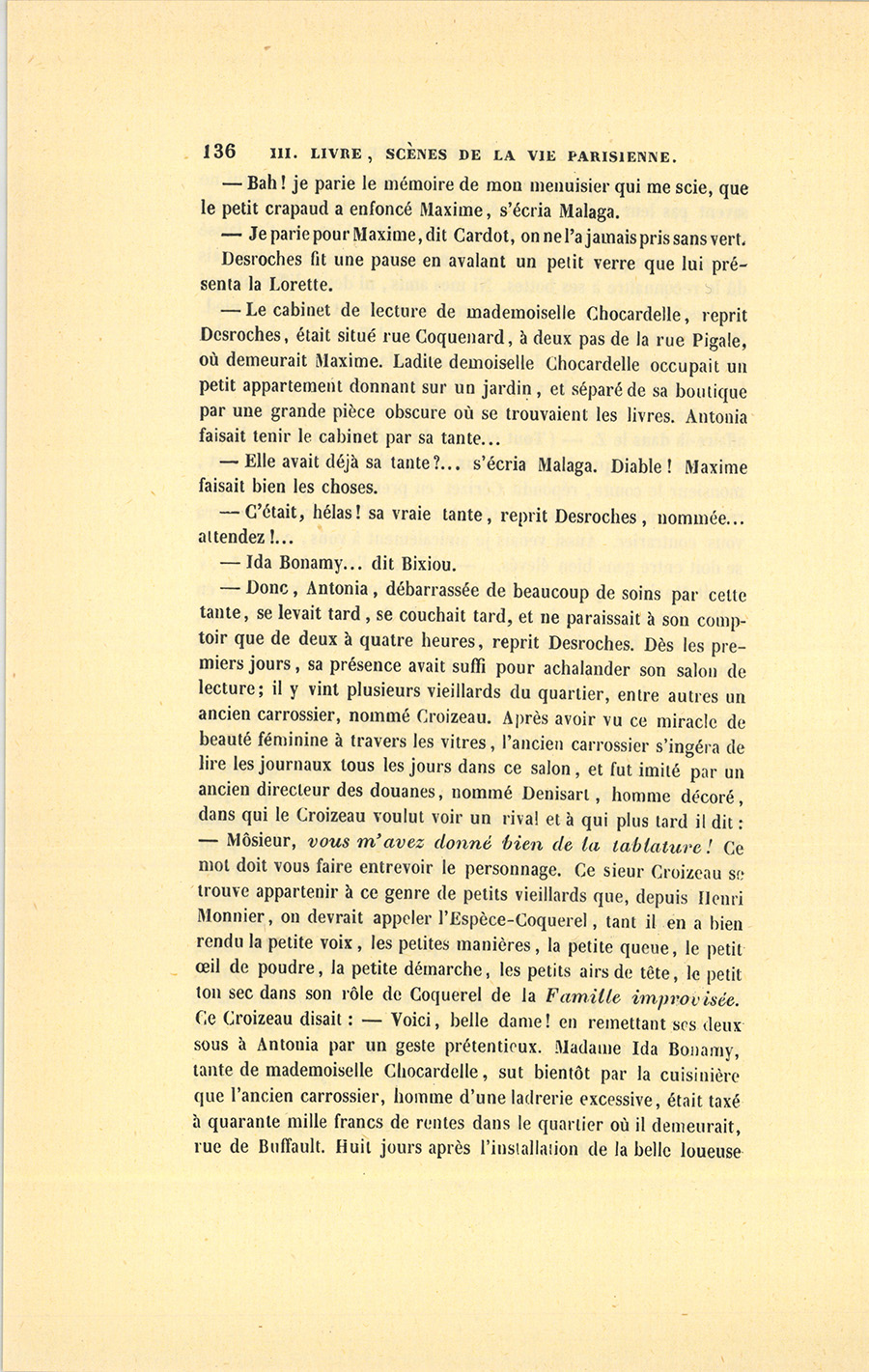 – Le cabinet de lecture de mademoiselle Chocardelle, reprit Desroches, était situé rue Coquenard, à deux pas de la rue Pigale, où demeurait Maxime. Ladite demoiselle Chocardelle occupait un petit appartement donnant sur un jardin, et séparé de sa boutique par une grande pièce obscure où se trouvaient les livres. Antonia faisait tenir le cabinet par sa tante…