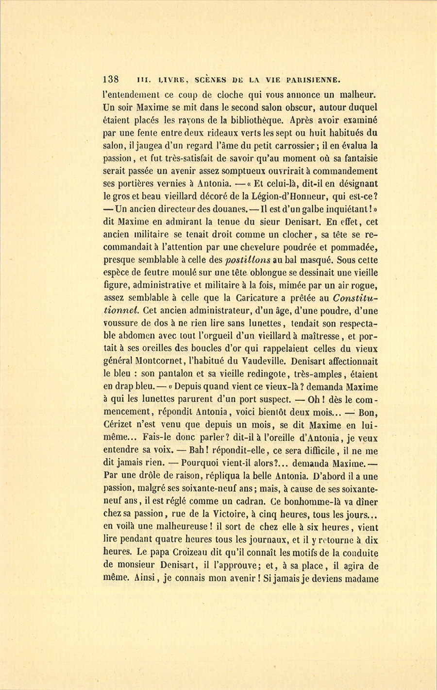 – Donc, Antonia, débarrassée de beaucoup de soins par cette tante, se levait tard, se couchait tard, et ne paraissait à son comptoir que de deux à quatre heures, reprit Desroches. Dès les premiers jours, sa présence avait suffi pour achalander son salon de lecture ; il y vint plusieurs vieillards du quartier, entre autres un ancien carrossier, nommé Croizeau. Après avoir vu ce miracle de beauté féminine à travers les vitres, l’ancien carrossier s’ingéra de lire les journaux tous les jours dans ce salon, et fut imité par un ancien directeur des douanes, nommé Denisart, homme décoré, dans qui le Croizeau voulut voir un rival et à qui plus tard il dit : – Môsieur, vous m’avez donné bien de la tablature ! Ce mot doit vous faire entrevoir le personnage. Ce sieur Croizeau se trouve appartenir à ce genre de petits vieillards que, depuis Henri Monnier, on devrait appeler l’Espèce-Coquerel, tant il en a bien rendu la petite voix, les petites manières, la petite queue, le petit œil de poudre, la petite démarche, les petits airs de tête, le petit ton sec dans son rôle de Coquerel de la Famille improvisée. Ce Croizeau disait : – Voici, belle dame ! en remettant ses deux sous à Antonia par un geste prétentieux. Madame Ida Bonamy, tante de mademoiselle Chocardelle, sut bientôt par la cuisinière que l’ancien carrossier, homme d’une ladrerie excessive, était taxé à quarante mille francs de rentes dans le quartier où il demeurait, rue de Buffault. Huit jours après l’installation de la belle loueuse {p. 137} de romans, il accoucha de ce calembour galant : – « Vous me prêtez des livres, mais je vous rendrais bien des francs… » Quelques jours plus tard, il prit un petit air entendu pour dire : – « Je sais que vous êtes occupée, mais mon jour viendra : je suis veuf. » Croizeau se montrait toujours avec de beau linge, avec un habit bleu-barbeau, gilet de pou-de-soie, pantalon noir, souliers à double semelle, noués avec des rubans de soie noire et craquant comme ceux d’un abbé. Il tenait toujours à la main son chapeau de soie de quatorze francs. – « Je suis vieux et sans enfants, disait-il à la jeune personne quelques jours après la visite de Cérizet chez Maxime. J’ai mes collatéraux en horreur. C’est tous paysans faits pour labourer la terre ! Figurez-vous que je suis venu de mon village avec six francs, et que j’ai fait ma fortune ici. Je ne suis pas fier… Une jolie femme est mon égale. Ne vaut-il pas mieux être madame Croizeau pendant quelque temps que la servante d’un comte pendant un an… Vous serez quittée, un jour ou l’autre. Et, vous penserez alors à moi… Votre serviteur, belle dame ! » Tout cela mitonnait sourdement. La plus légère galanterie se disait en cachette. Personne au monde ne savait que ce petit vieillard propret aimait Antonia, car la prudente contenance de cet amoureux au salon de lecture n’aurait rien appris à un rival. Croizeau se défia pendant deux mois du directeur des douanes en retraite. Mais, vers le milieu du troisième mois, il eut lieu de reconnaître combien ses soupçons étaient mal fondés. Croizeau s’ingénia de côtoyer Denisart en s’en allant de conserve avec lui, puis, en prenant sa bisque, il lui dit : – « Il fait beau, môsieur ?… » À quoi l’ancien fonctionnaire répondit : – « Le temps d’Austerlitz, monsieur : j’y fus… j’y fus même blessé, ma croix me vient de ma conduite dans cette belle journée… » Et, de fil en aiguille, de roue en bataille, de femme en carrosse, une liaison se fit entre ces deux débris de l’Empire. Le petit Croizeau tenait à l’Empire par ses liaisons avec les sœurs de Napoléon ; il était leur carrossier, et il les avait souvent tourmentées pour ses factures. Il se donnait donc pour avoir eu des relations avec la famille impériale. Maxime, instruit par Antonia des propositions que se permettait l’agréable vieillard, tel fut le surnom donné par la tante au rentier, voulut le voir. La déclaration de guerre de Cérizet avait eu la propriété de faire étudier à ce grand Gant-Jaune sa position sur son échiquier en en observant les moindres pièces. Or, à propos de cet agréable vieillard, il reçut dans {p. 138} l’entendement ce coup de cloche qui vous annonce un malheur. Un soir Maxime se mit dans le second salon obscur, autour duquel étaient placés les rayons de la bibliothèque. Après avoir examiné par une fente entre deux rideaux verts les sept ou huit habitués du salon, il jaugea d’un regard l’âme du petit carrossier ; il en évalua la passion, et fut très-satisfait de savoir qu’au moment où sa fantaisie serait passée un avenir assez somptueux ouvrirait à commandement ses portières vernies à Antonia. – « Et celui-là, dit-il en désignant le gros et beau vieillard décoré de la Légion-d’Honneur, qui est-ce ? – Un ancien directeur des douanes. – Il est d’un galbe inquiétant ! » dit Maxime en admirant la tenue du sieur Denisart. En effet, cet ancien militaire se tenait droit comme un clocher, sa tête se recommandait à l’attention par une chevelure poudrée et pommadée, presque semblable à celle des postillons au bal masqué. Sous cette espèce de feutre moulé sur une tête oblongue se dessinait une vieille figure, administrative et militaire à la fois, mimée par un air rogue, assez semblable à celle que la Caricature a prêtée au Constitutionnel. Cet ancien administrateur, d’un âge, d’une poudre, d’une voussure de dos à ne rien lire sans lunettes, tendait son respectable abdomen avec tout l’orgueil d’un vieillard à maîtresse, et portait à ses oreilles des boucles d’or qui rappelaient celles du vieux général Montcornet, l’habitué du Vaudeville. Denisart affectionnait le bleu : son pantalon et sa vieille redingote, très-amples, étaient en drap bleu. – « Depuis quand vient ce vieux-là ? demanda Maxime à qui les lunettes parur