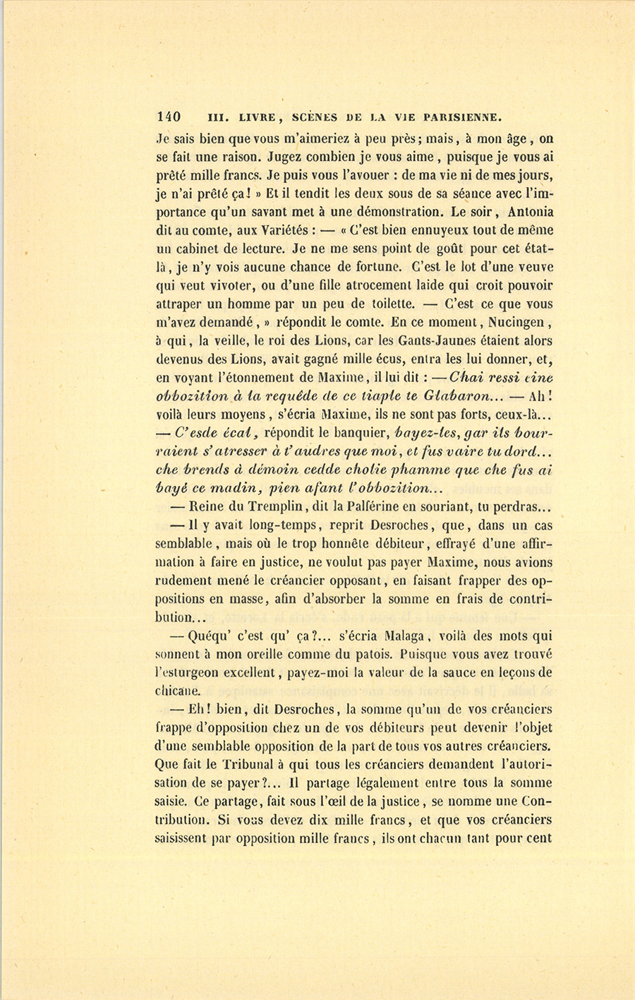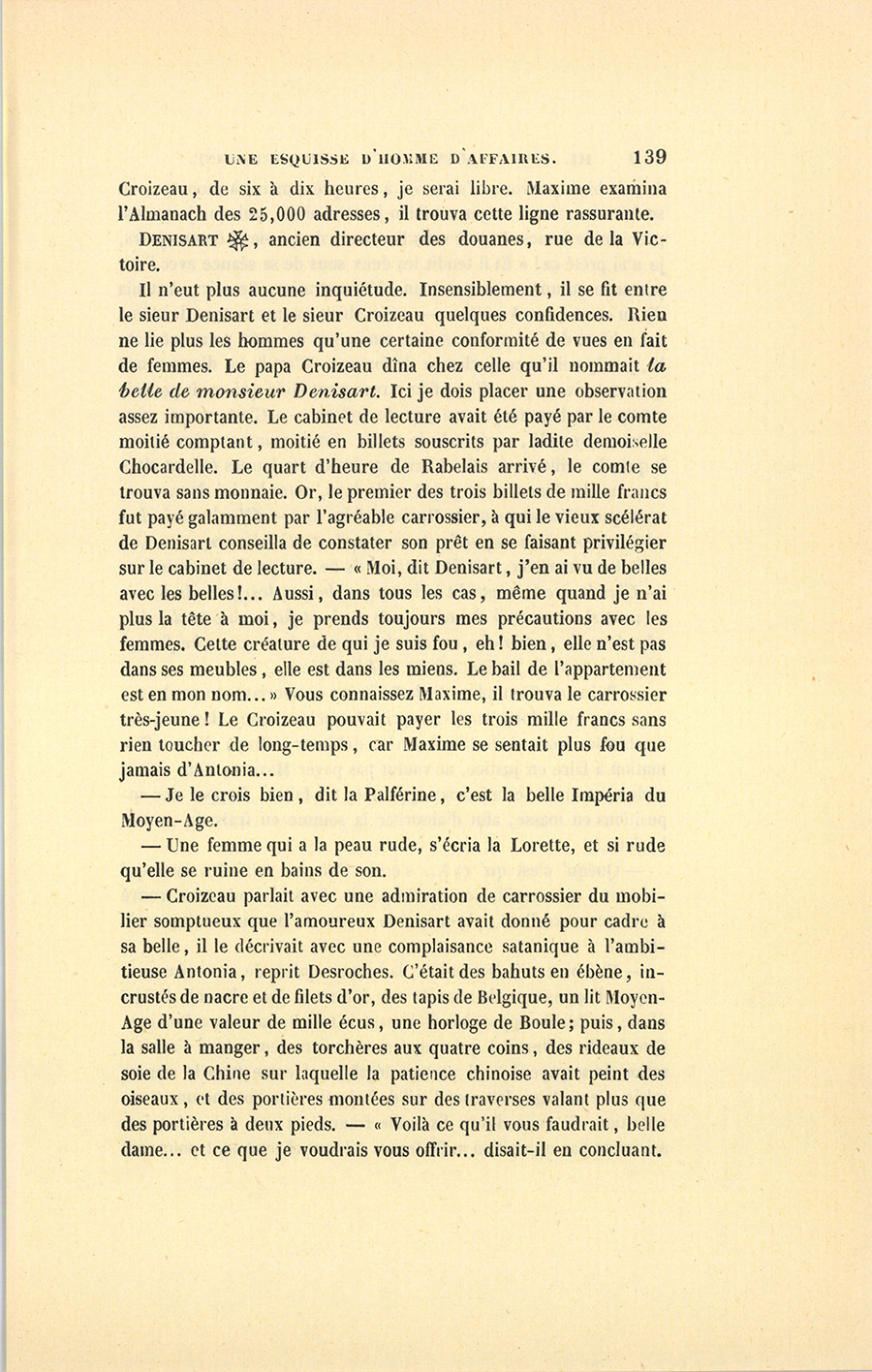 – Croizeau parlait avec une admiration de carrossier du mobilier somptueux que l’amoureux Denisart avait donné pour cadre à sa belle, il le décrivait avec une complaisance satanique à l’ambitieuse Antonia, reprit Desroches. C’était des bahuts en ébène, incrustés de nacre et de filets d’or, des tapis de Belgique, un lit Moyen-Âge d’une valeur de mille écus, une horloge de Boule ; puis, dans la salle à manger, des torchères aux quatre coins, des rideaux de soie de la Chine sur laquelle la patience chinoise avait peint des oiseaux, et des portières montées sur des traverses valant plus que des portières à deux pieds. – « Voilà ce qu’il vous faudrait, belle dame… et ce que je voudrais vous offrir… disait-il en concluant. {p. 140} Je sais bien que vous m’aimeriez à peu près ; mais, à mon âge, on se fait une raison. Jugez combien je vous aime, puisque je vous ai prêté mille francs. Je puis vous l’avouer : de ma vie ni de mes jours, je n’ai prêté ça ! » Et il tendit les deux sous de sa séance avec l’importance qu’un savant met à une démonstration. Le soir, Antonia dit au comte, aux Variétés : – « C’est bien ennuyeux tout de même un cabinet de lecture. Je ne me sens point de goût pour cet état-là, je n’y vois aucune chance de fortune. C’est le lot d’une veuve qui veut vivoter, ou d’une fille atrocement laide qui croit pouvoir attraper un homme par un peu de toilette. – C’est ce que vous m’avez demandé », répondit le comte. En ce moment, Nucingen, à qui, la veille, le roi des Lions, car les Gants-Jaunes étaient alors devenus des Lions, avait gagné mille écus, entra les lui donner, et, en voyant l’étonnement de Maxime, il lui dit : – Chai ressi eine obbozition à la requêde de ce tiaple te Glabaron… – Ah ! voilà leurs moyens, s’écria Maxime, ils ne sont pas forts, ceux-là… – C’esde écal, répondit le banquier, bayez-les, gar ils bourraient s’atresser à t’audres que moi, et fus vaire tu dord… che brends à démoin cedde cholie phamme que che fus ai bayé ce madin, pien afant l’obbozition…