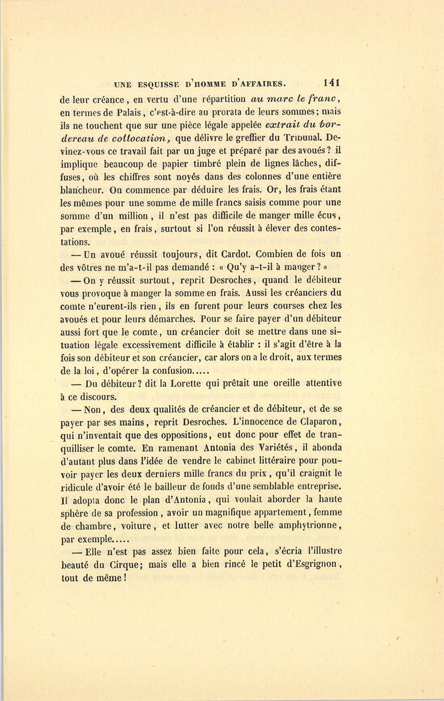 – Eh ! bien, dit Desroches, la somme qu’un de vos créanciers frappe d’opposition chez un de vos débiteurs peut devenir l’objet d’une semblable opposition de la part de tous vos autres créanciers. Que fait le Tribunal à qui tous les créanciers demandent l’autorisation de se payer ?… Il partage légalement entre tous la somme saisie. Ce partage, fait sous l’œil de la justice, se nomme une Contribution. Si vous devez dix mille francs, et que vos créanciers saisissent par opposition mille francs, ils ont chacun tant pour cent {p. 141} de leur créance, en vertu d’une répartition au marc le franc, en termes de Palais, c’est-à-dire au prorata de leurs sommes ; mais ils ne touchent que sur une pièce légale appelée extrait du bordereau de collocation, que délivre le greffier du Tribunal. Devinez-vous ce travail fait par un juge et préparé par des avoués ? il implique beaucoup de papier timbré plein de lignes lâches, diffuses, où les chiffres sont noyés dans des colonnes d’une entière blancheur. On commence par déduire les frais. Or, les frais étant les mêmes pour une somme de mille francs saisis comme pour une somme d’un million, il n’est pas difficile de manger mille écus, par exemple, en frais, surtout si l’on réussit à élever des contestations.