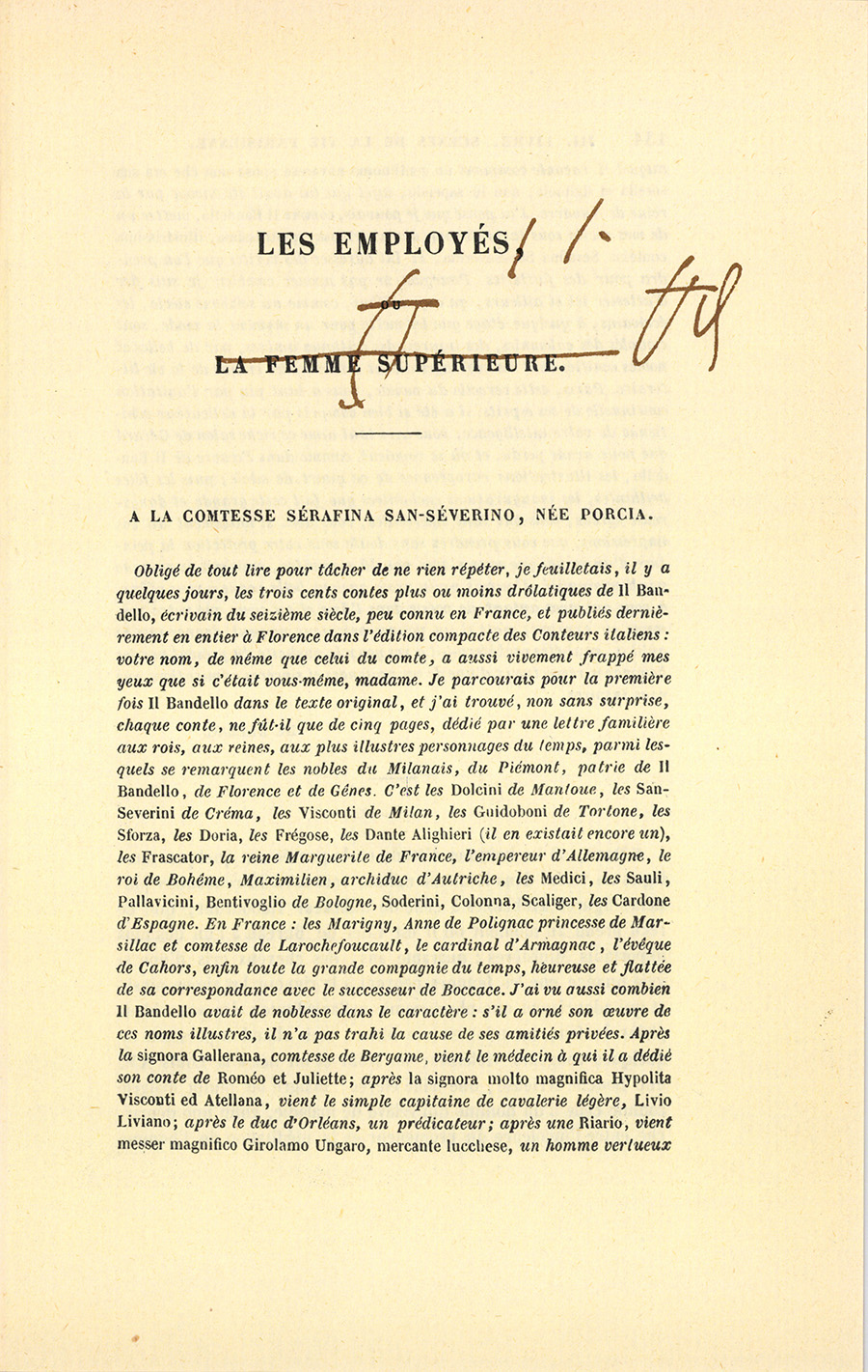 Obligé de tout lire pour tâcher de ne rien répéter, je feuilletais, il y a quelques jours, les trois cents contes plus ou moins drolatiques de Il Bandello, écrivain du seizième siècle, peu connu en France, et publiés dernièrement en entier à Florence dans l’édition compacte des Conteurs italiens : votre nom, de même que celui du comte, a aussi vivement frappé mes yeux que si c’était vous-même, madame. Je parcourais pour la première fois Il Bandello dans le texte original, et j’ai trouvé, non sans surprise, chaque conte, ne fût-il que de cinq pages, dédié par une lettre familière aux rois, aux reines, aux plus illustres personnages du temps, parmi lesquels se remarquent les nobles du Milanais, du Piémont, patrie de Il Bandello, de Florence et de Gênes. C’est les Dolcini de Mantoue, les San-Severini de Créma, les Visconti de Milan, les Guidoboni de Tortone, les Sforza, les Doria, les Frégose, les Dante Alighieri (il en existait encore un), les Frascator, la reine Marguerite de France, l’empereur d’Allemagne, le roi de Bohême, Maximilien, archiduc d’Autriche, les Medici, les Sauli, Pallavicini, Bentivoglio de Bologne, Soderini, Colonna, Scaliger, les Cardone d’Espagne. En France : les Marigny, Anne de Polignac princesse de Marsillac et comtesse de Larochefoucault, le cardinal d’Armagnac, l’évêque de Cahors, enfin toute la grande compagnie du temps, heureuse et flattée de sa correspondance avec le successeur de Boccace. J’ai vu aussi combien Il Bandello avait de noblesse dans le caractère : s’il a orné son œuvre de ces noms illustres, il n’a pas trahi la cause de ses amitiés privées. Après la signora Gallerana, comtesse de Bergame, vient le médecin à qui il a dédié son conte de Roméo et Juliette ; après la signora molto magnifica Hypolita Visconti ed Atellana, vient le simple capitaine de cavalerie légère, Livio Liviano ; après le duc d’Orléans, un prédicateur ; après une Riario, vient messer magnifico Girolamo Ungaro, mercante lucchese, un homme vertueux {p. 134} auquel il raconte comment un gentiluomo navarese sposa una che era sua sorella et figliuola, non lo sapendo, sujet qui lui avait été envoyé par la reine de Navarre. J’ai pensé que je pouvais, comme Il Bandello, mettre un de mes récits sous la protection d’una virtuosa, gentilissima, illustrissima contessa Serafina San-Severina, et lui adresser des vérités que l’on prendra pour des flatteries. Pourquoi ne pas avouer combien je suis fier d’attester ici et ailleurs, qu’aujourd’hui, comme au seizième siècle, les écrivains, à quelque étage que les mette pour un moment la mode, sont consolés des calomnies, des injures, des critiques amères, par de belles et nobles amitiés dont les suffrages aident à vaincre les ennuis de la vie littéraire. Paris, cette cervelle du monde, vous a tant plu par l’agitation continuelle de ses esprits, il a été si bien compris par la délicatesse vénitienne de votre intelligence ; vous avez tant aimé ce riche salon de Gérard que nous avons perdu, et où se voyaient, comme dans l’œuvre de Il Bandello, les illustrations européennes de ce quart de siècle ; puis les fêtes brillantes, les inaugurations enchantées que fait cette grande et dangereuse syrène, vous ont tant émerveillée, vous avez si naïvement dit vos impressions, que vous prendrez sans doute sous votre protection la peinture d’un monde que vous n’avez pas dû connaître, mais qui ne manque pas d’originalité. J’aurais voulu avoir quelque belle poésie à vous offrir, à vous qui avez autant de poésie dans l’âme et au cœur que votre personne en exprime ; mais si un pauvre prosateur ne peut donner que ce qu’il a, peut-être rachètera-t-il à vos yeux la modicité du présent par les hommages respectueux d’une de ces profondes et sincères admirations que vous inspirez.