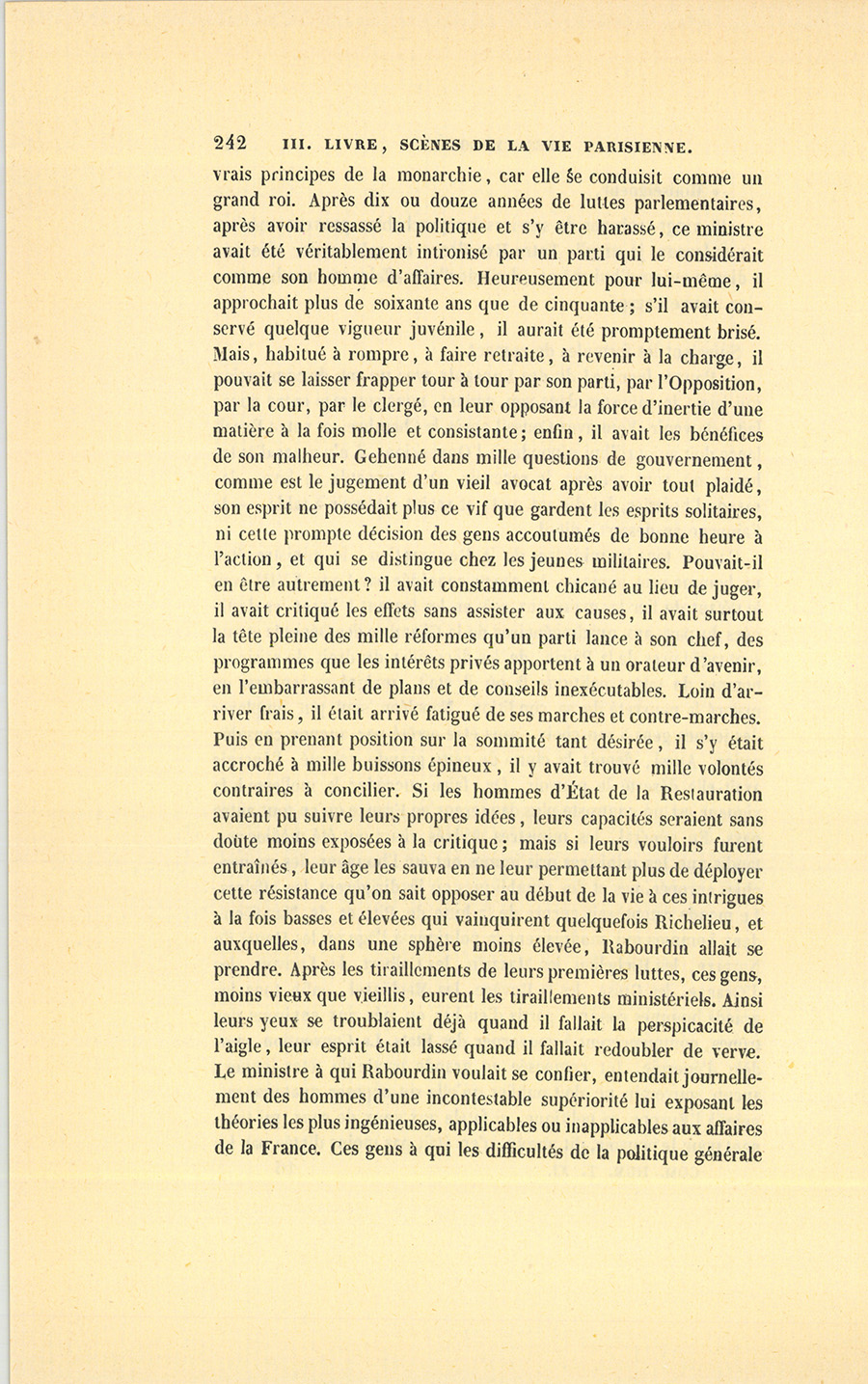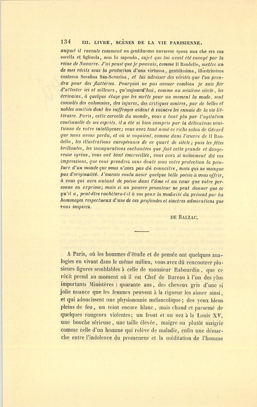 À Paris, où les hommes d’étude et de pensée ont quelques analogies en vivant dans le même milieu, vous avez dû rencontrer plusieurs figures semblables à celle de monsieur Rabourdin, que ce récit prend au moment où il est Chef de Bureau à l’un des plus importants Ministères : quarante ans, des cheveux gris d’une si jolie nuance que les femmes peuvent à la rigueur les aimer ainsi, et qui adoucissent une physionomie mélancolique ; des yeux bleus pleins de feu, un teint encore blanc, mais chaud et parsemé de quelques rougeurs violentes ; un front et un nez à la Louis XV, une bouche sérieuse, une taille élevée, maigre ou plutôt maigrie comme celle d’un homme qui relève de maladie, enfin une démarche entre l’indolence du promeneur et la méditation de l’homme {p. 135} occupé. Si ce portrait fait préjuger un caractère, la mise de l’homme contribuait peut-être à le mettre en relief. Rabourdin portait habituellement une grande redingote bleue, une cravate blanche, un gilet croisé à la Roberspierre, un pantalon noir sans sous-pieds, des bas de soie gris et des souliers découverts. Rasé, lesté de sa tasse de café dès huit heures du matin, il sortait avec une exactitude d’horloge, et passait par les mêmes rues en se rendant au Ministère ; mais si propre, si compassé que vous l’eussiez pris pour un Anglais allant à son ambassade. À ces traits principaux, vous devinez le père de famille harassé par des contrariétés au sein du ménage, tourmenté par des ennuis au Ministère, mais assez philosophe pour prendre la vie comme elle est ; un honnête homme aimant son pays et le servant, sans se dissimuler les obstacles que l’on rencontre à vouloir le bien ; prudent parce qu’il connaît les hommes, d’une exquise politesse avec les femmes parce qu’il n’en attend rien ; enfin, un homme plein d’acquis, affable avec ses inférieurs, tenant à une grande distance ses égaux, et d’une haute dignité avec ses chefs. À l’époque où le prend cette Étude, vous eussiez remarqué chez lui l’air froidement résigné de l’homme qui avait enterré les illusions de la jeunesse, qui avait renoncé à de secrètes ambitions ; vous eussiez reconnu l’homme découragé mais encore sans dégoût et qui persiste dans ses premiers projets, plus pour employer ses facultés que dans l’espoir d’un douteux triomphe. Il n’était décoré d’aucun ordre, et s’accusait comme d’une faiblesse d’avoir porté celui du Lys aux premiers jours de la Restauration.