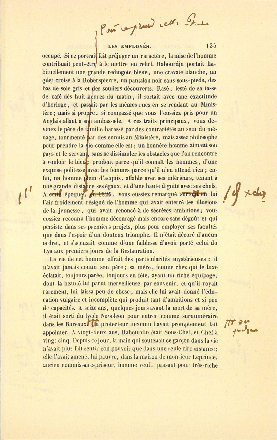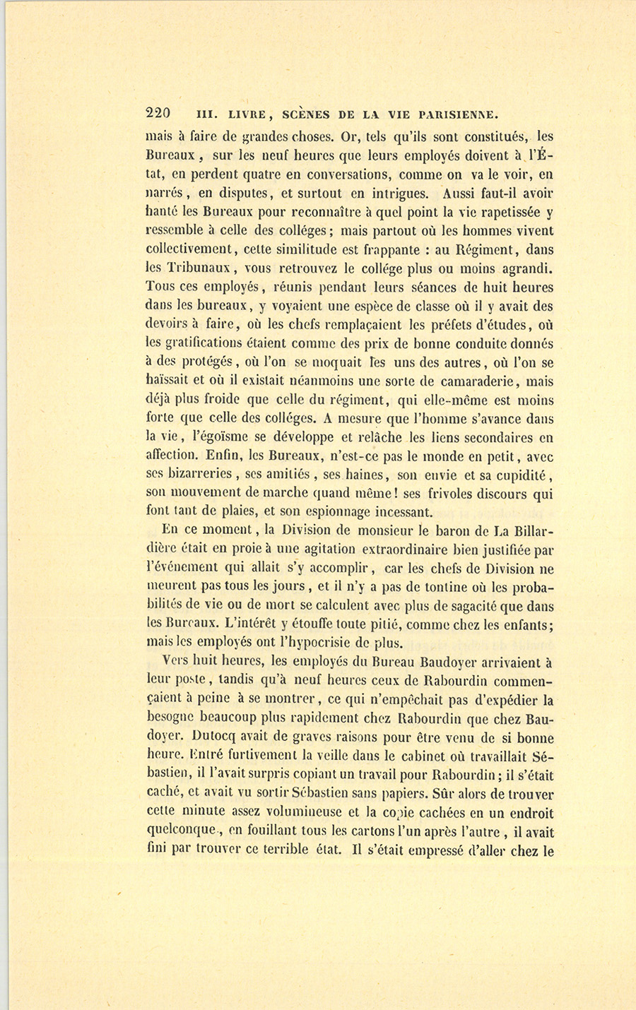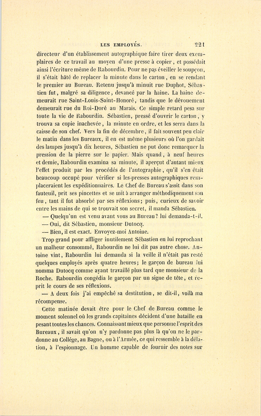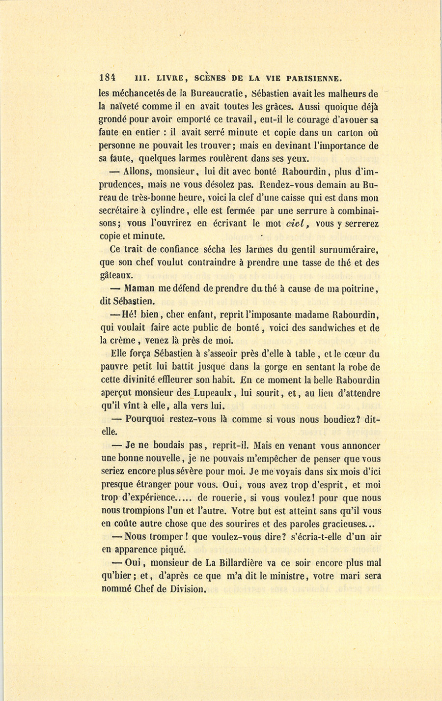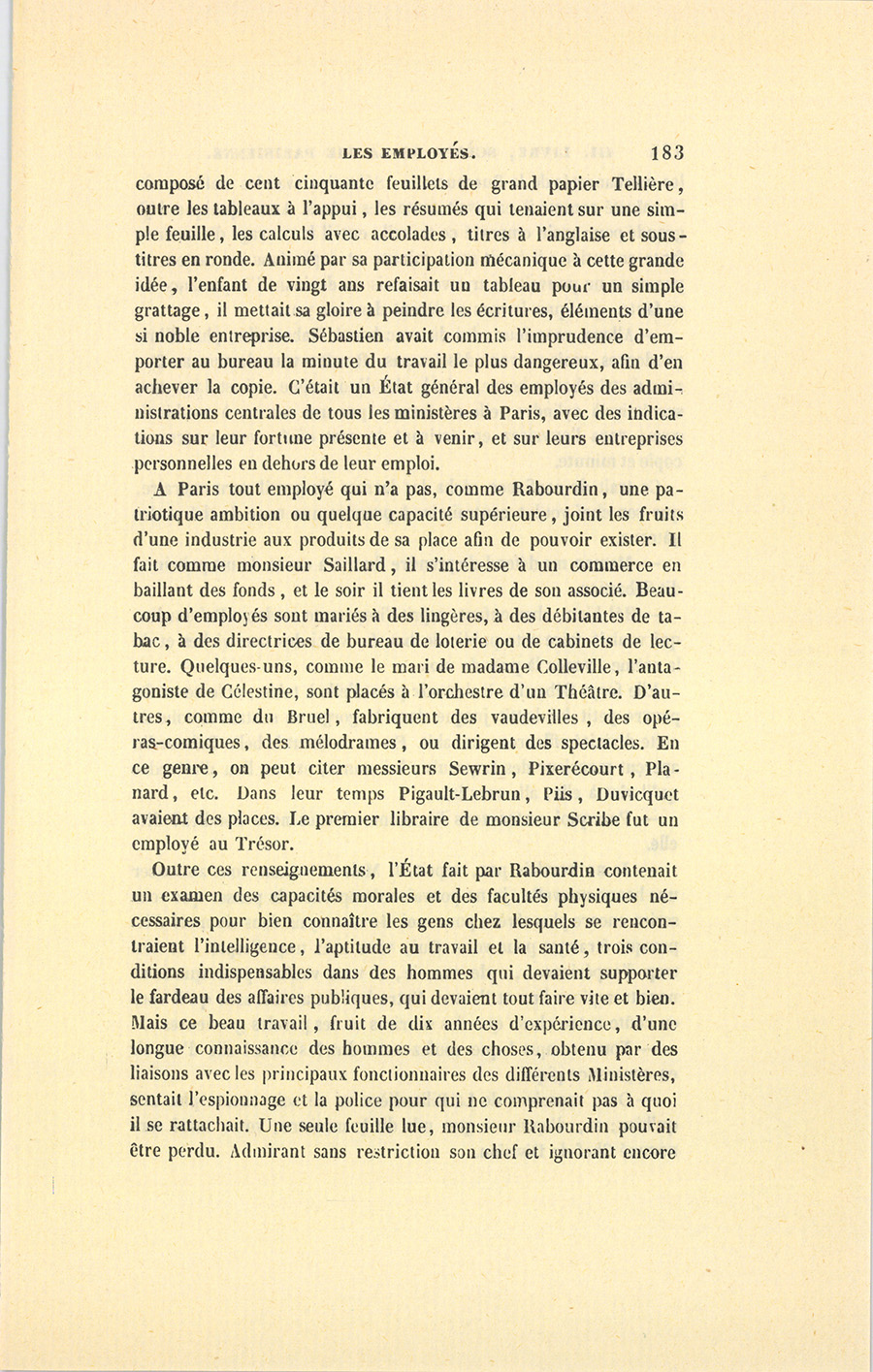 En ce moment Rabourdin grondait ce pauvre petit Sébastien, le seul qui fût dans la confidence entière de ses immenses travaux. Le surnuméraire copiait et recopiait le fameux mémoire {p. 183} composé de cent cinquante feuillets de grand papier Tellière, outre les tableaux à l’appui, les résumés qui tenaient sur une simple feuille, les calculs avec accolades, titres à l’anglaise et sous-titres en ronde. Animé par sa participation mécanique à cette grande idée, l’enfant de vingt ans refaisait un tableau pour un simple grattage, il mettait sa gloire à peindre les écritures, éléments d’une si noble entreprise. Sébastien avait commis l’imprudence d’emporter au bureau la minute du travail le plus dangereux, afin d’en achever la copie. C’était un État général des employés des administrations centrales de tous les ministères à Paris, avec des indications sur leur fortune présente et à venir, et sur leurs entreprises personnelles en dehors de leur emploi.